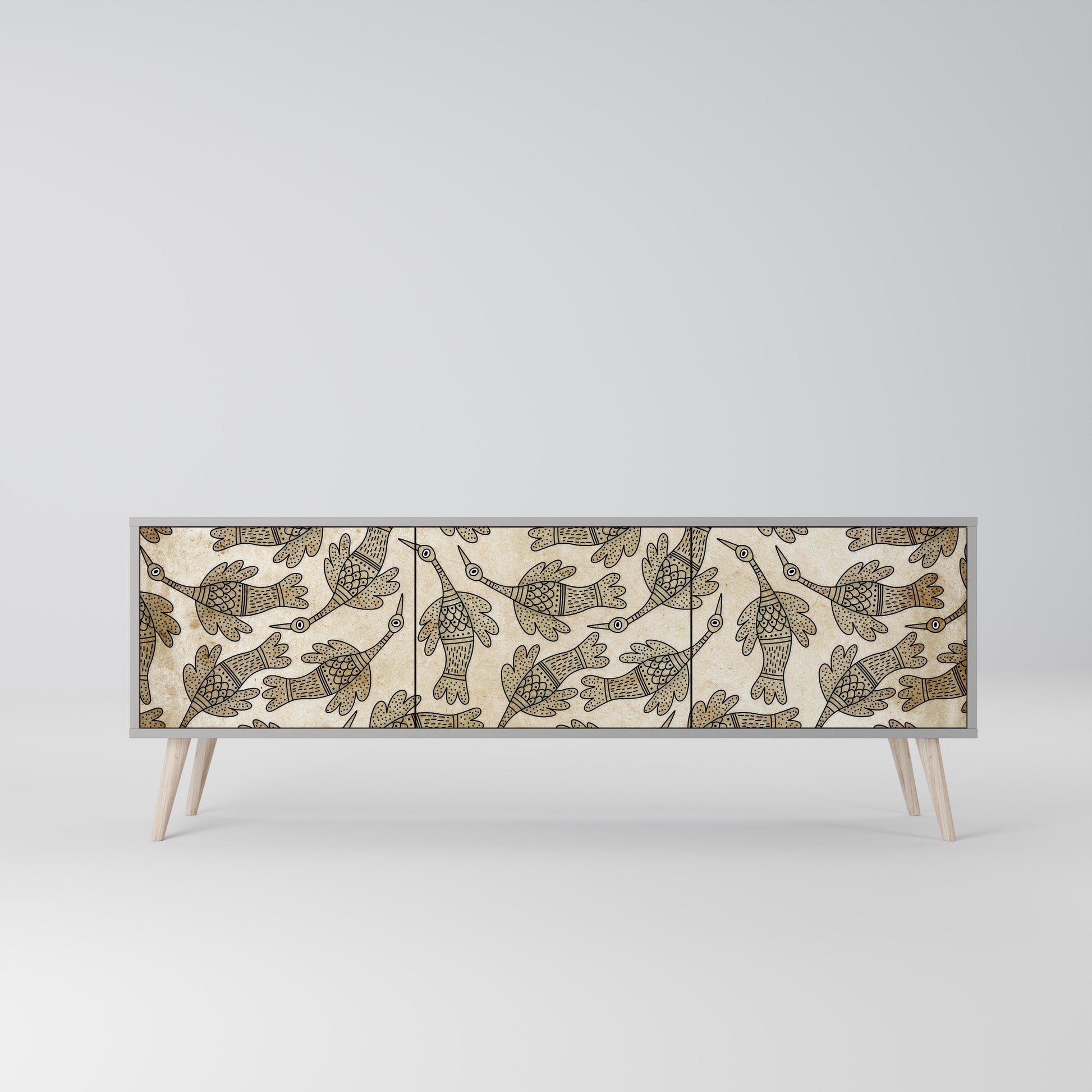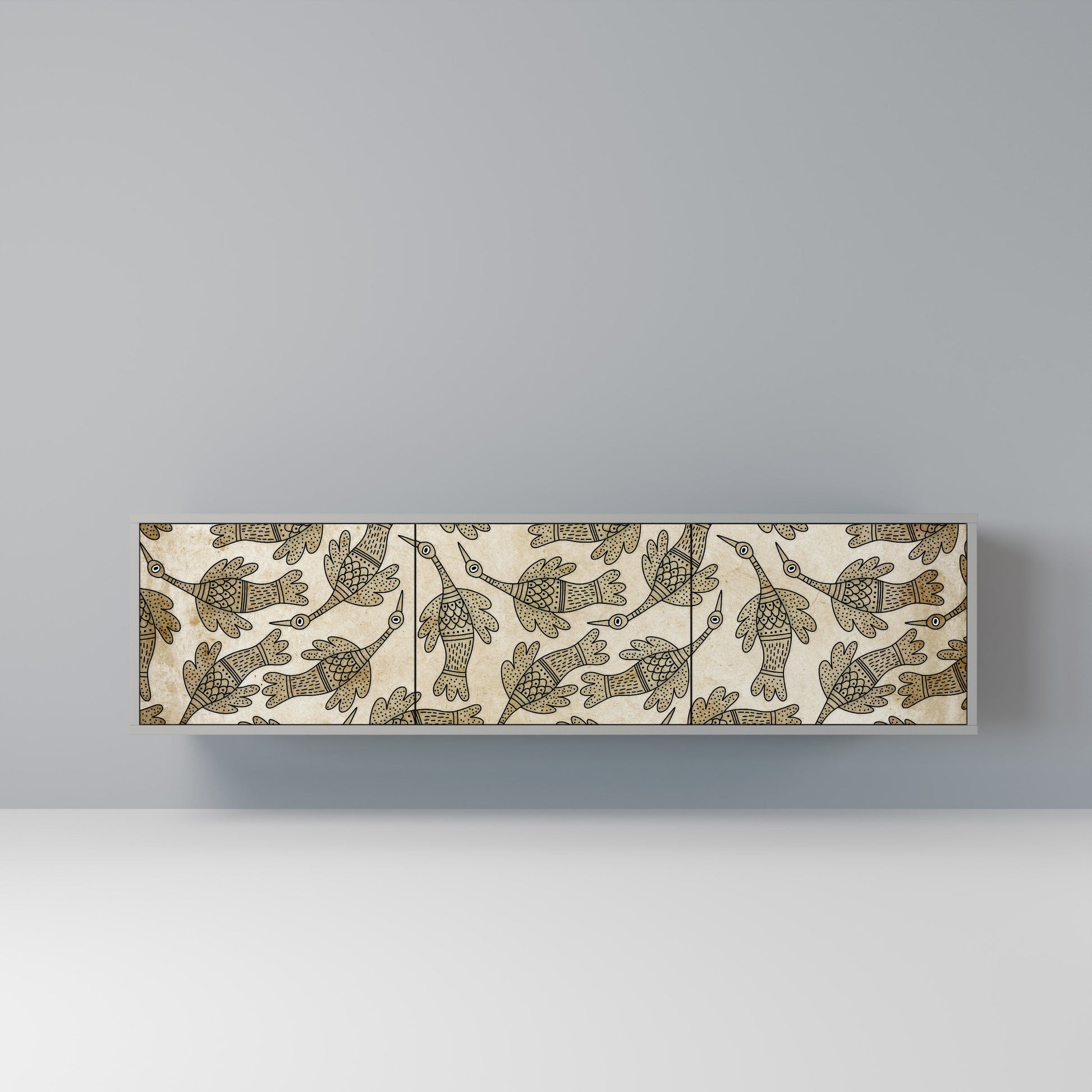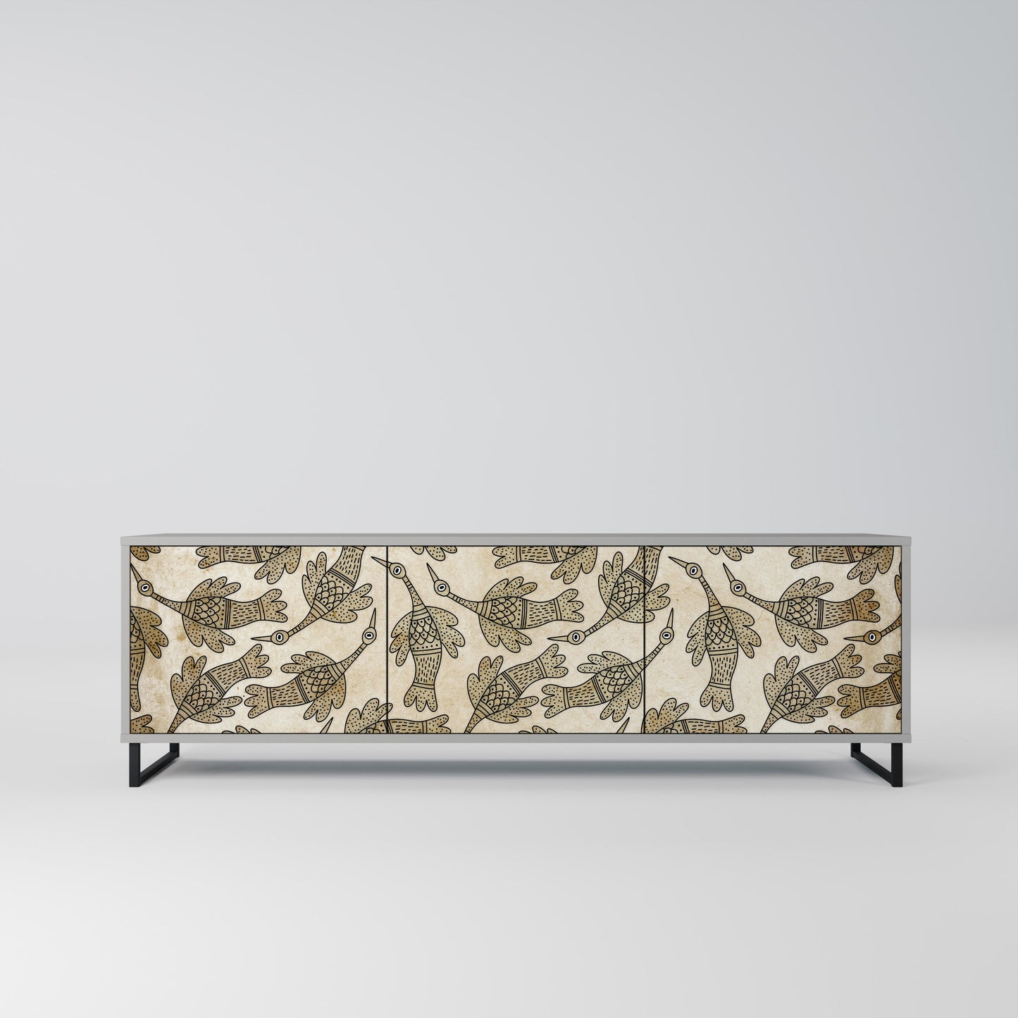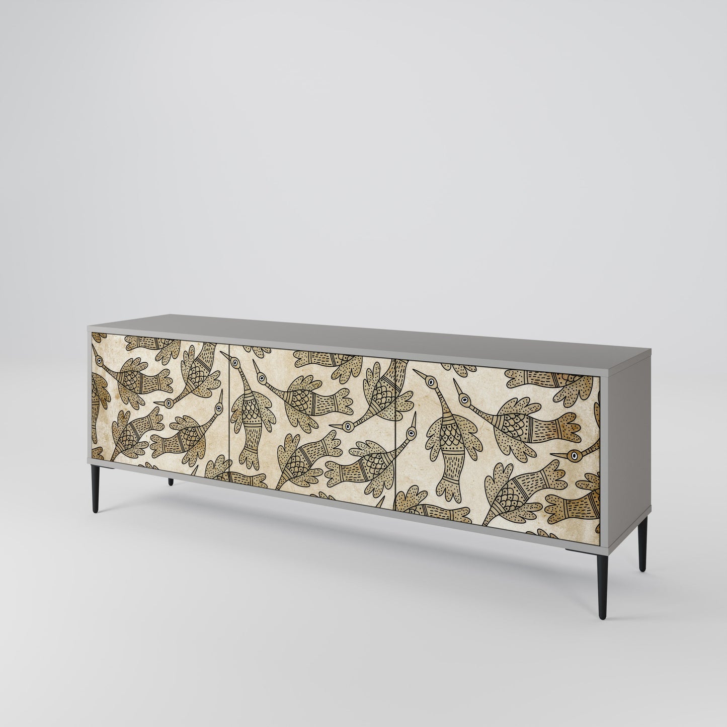 Il corpo grigio del mobile crea un accento raffinato e moderno che si abbina perfettamente ad arredi industriali e minimalisti. I frontali con stampa di design aggiungono carattere e unicità, rendendo questo pezzo non solo pratico, ma anche un elemento decorativo di spicco.
