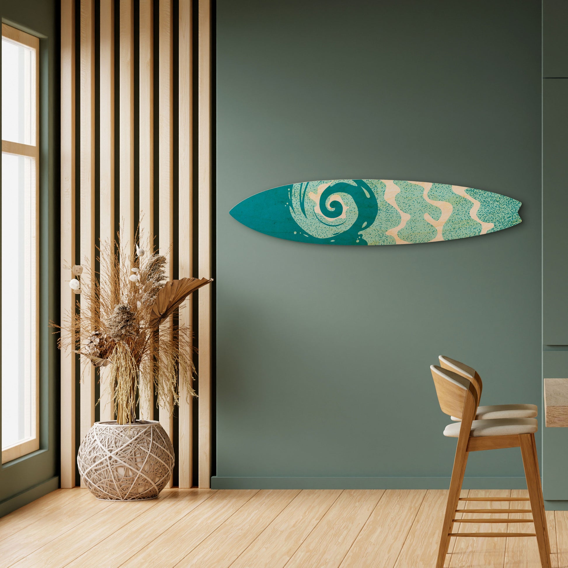 The surfboard has been designed with maximum functionality and arrangement flexibility in mind. It can be hung vertically or horizontally, or displayed freestanding by leaning it against a wall, dresser, or shelf. This makes it easy to adapt the piece to the character of the space and changing interior needs.