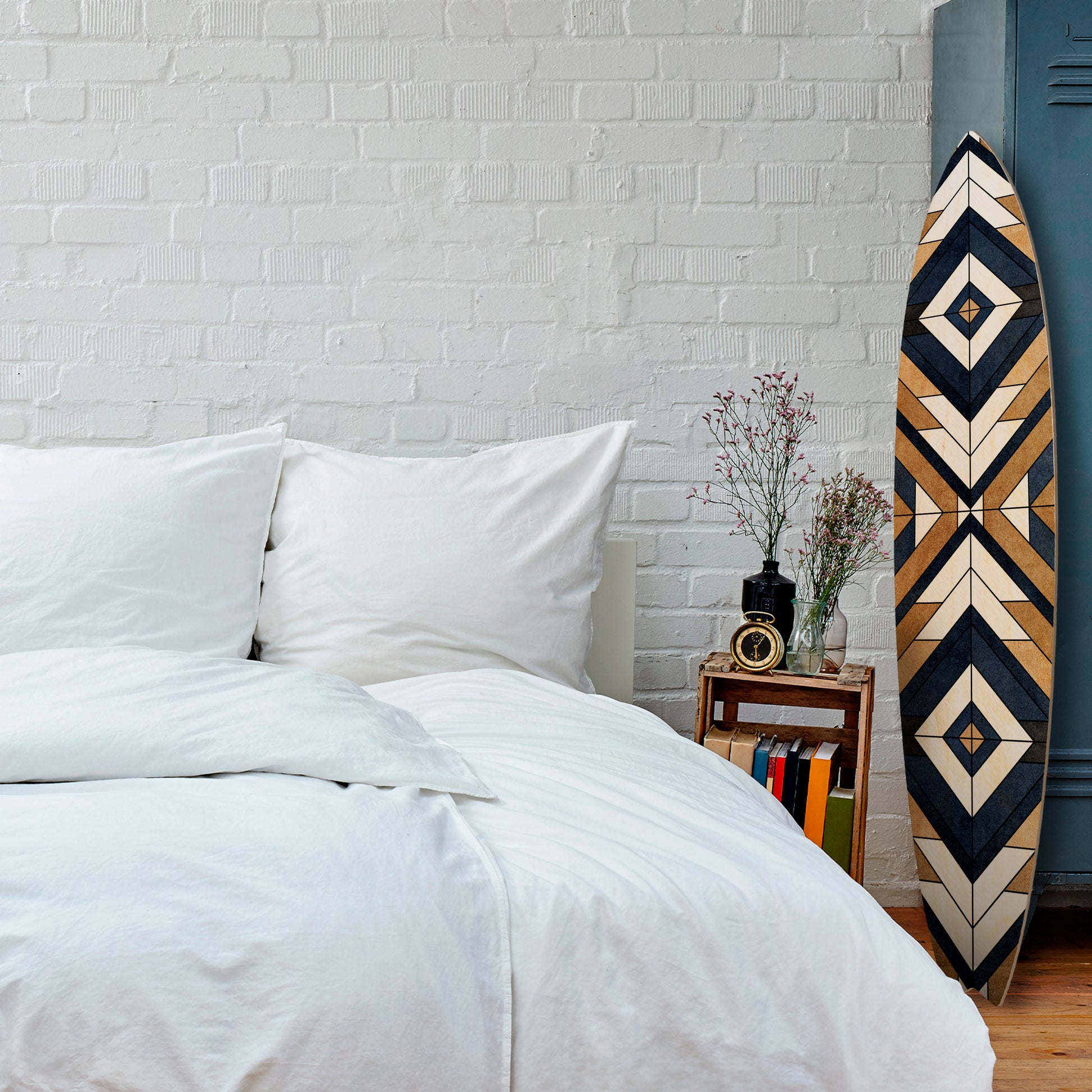 The surfboard has been designed with maximum functionality and arrangement flexibility in mind. It can be hung vertically or horizontally, or displayed freestanding by leaning it against a wall, dresser, or shelf. This makes it easy to adapt the piece to the character of the space and changing interior needs.