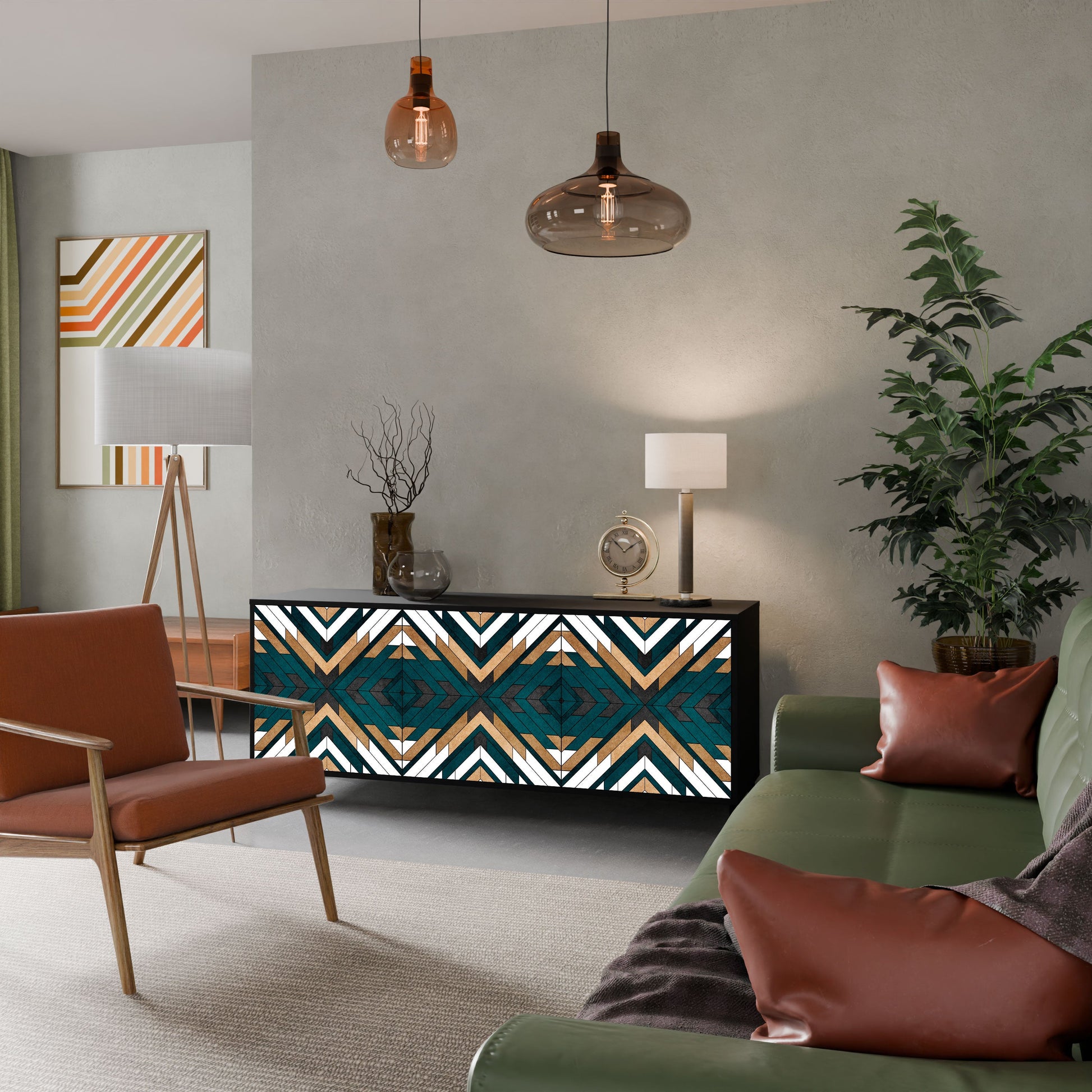 Eleganza e funzionalità in un unico mobile: la nostra credenza a 3 ante con corpo nero è la soluzione perfetta per gli amanti degli interni eleganti e moderni. Il corpo nero enfatizza il carattere audace del mobile, mentre i frontali con una stampa unica aggiungono un tocco artistico. Si adatta perfettamente al soggiorno, alla camera da letto o all'ufficio, completando sia gli arrangiamenti moderni che quelli industriali.