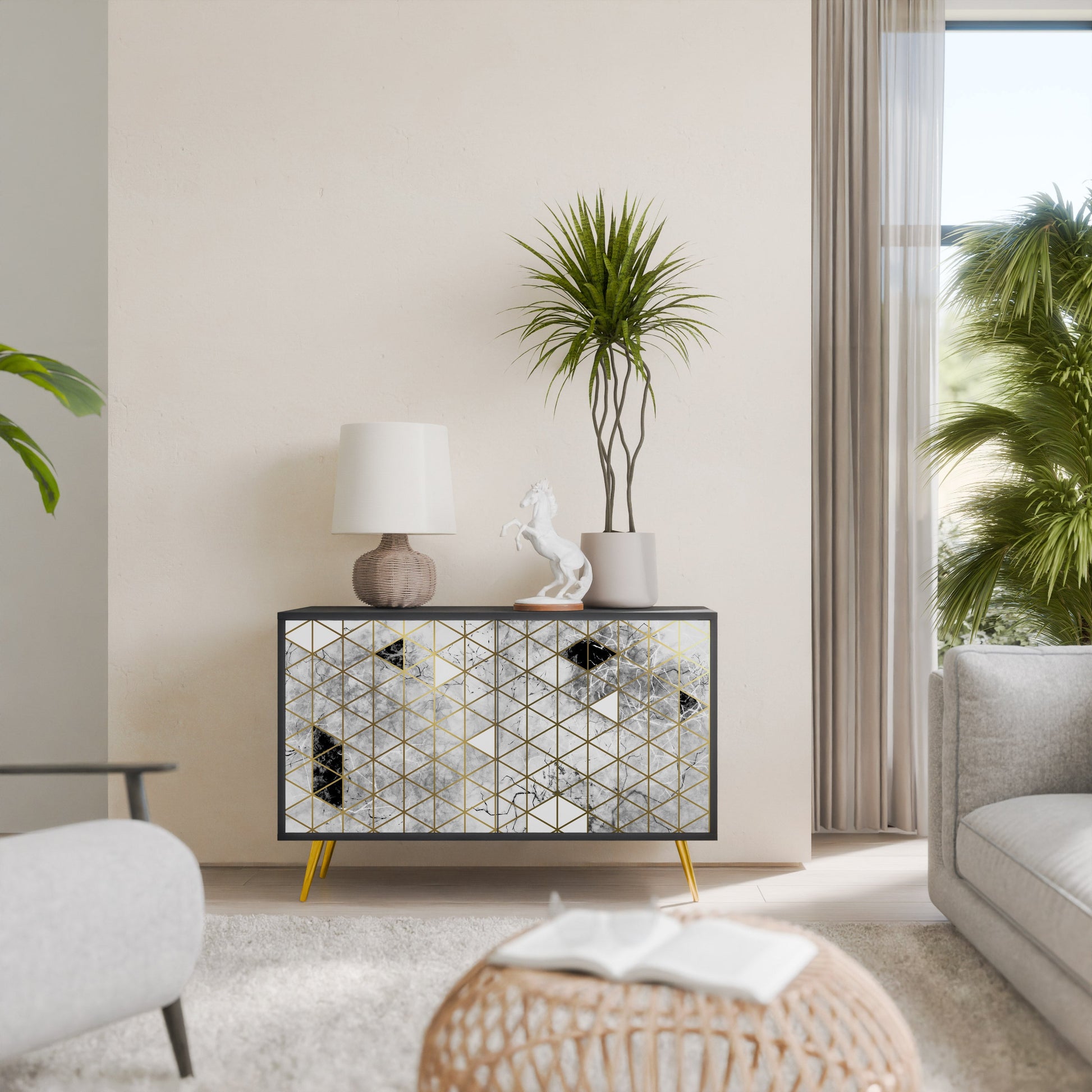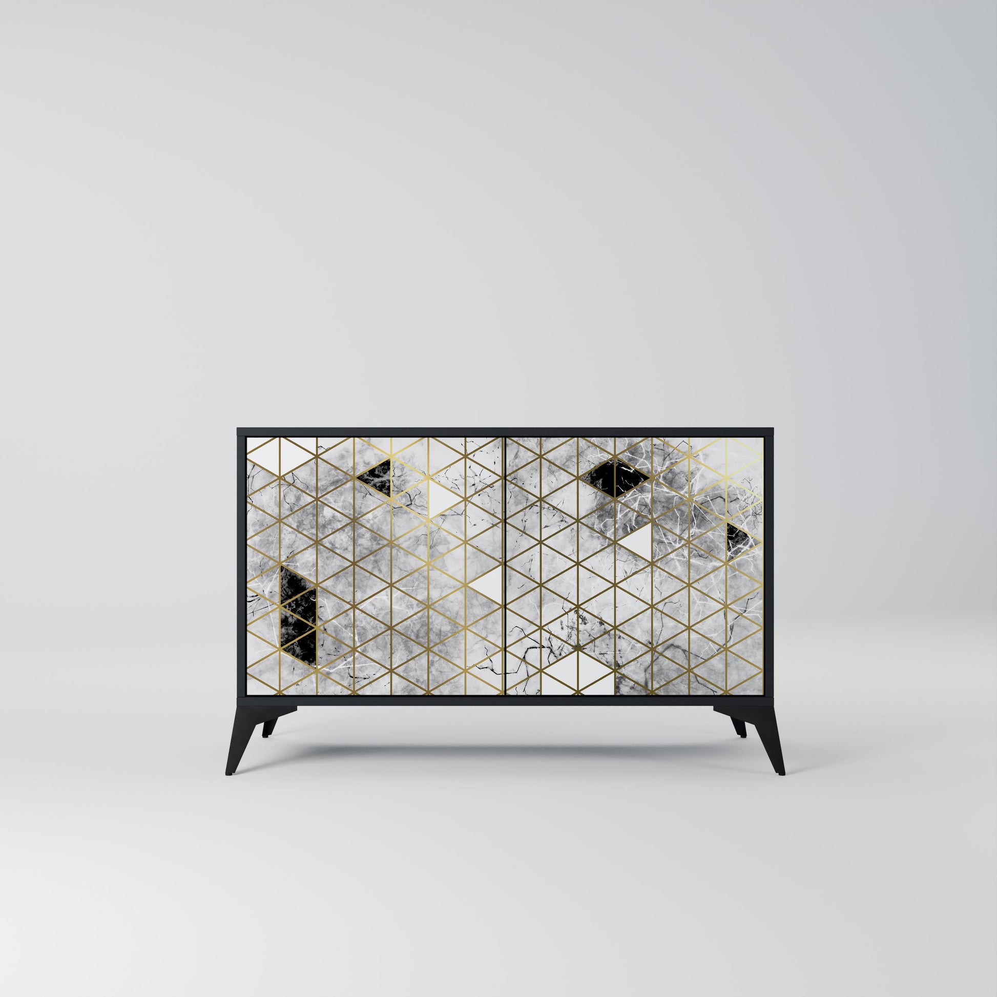 Eleganza e funzionalità in un unico mobile: la nostra credenza a 2 ante con corpo nero è la soluzione perfetta per gli amanti degli interni eleganti e moderni. Il corpo nero enfatizza il carattere audace del mobile, mentre i frontali con una stampa unica aggiungono un tocco artistico. Si adatta perfettamente al soggiorno, alla camera da letto o all'ufficio, completando sia gli arrangiamenti moderni che quelli industriali.