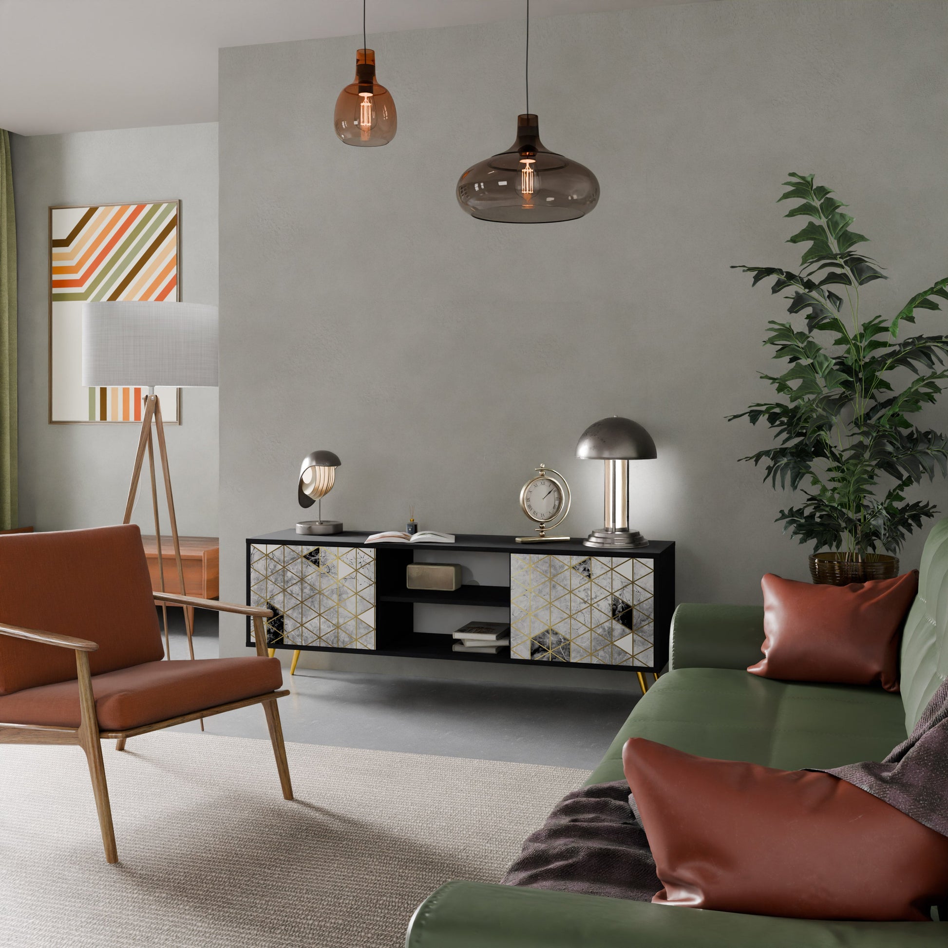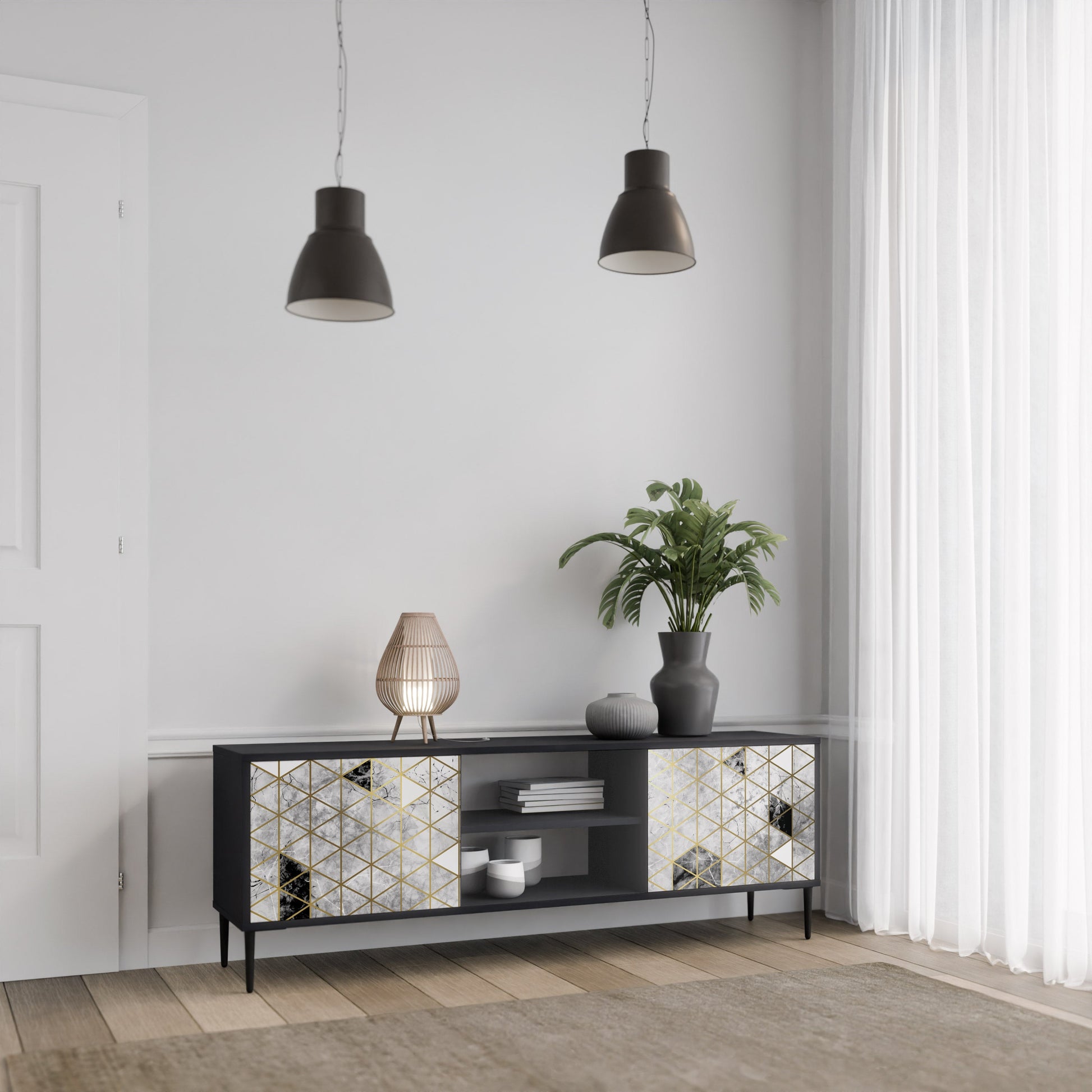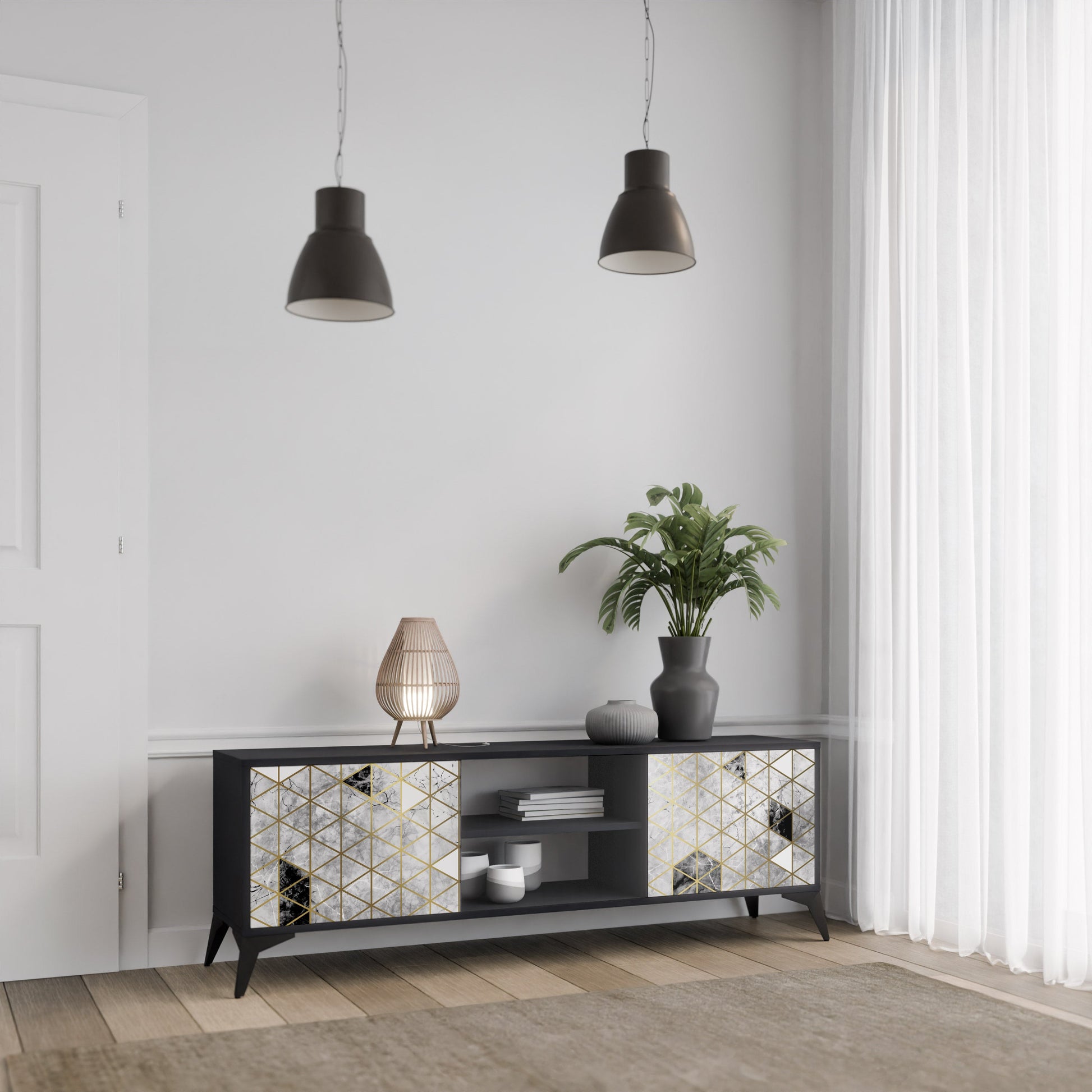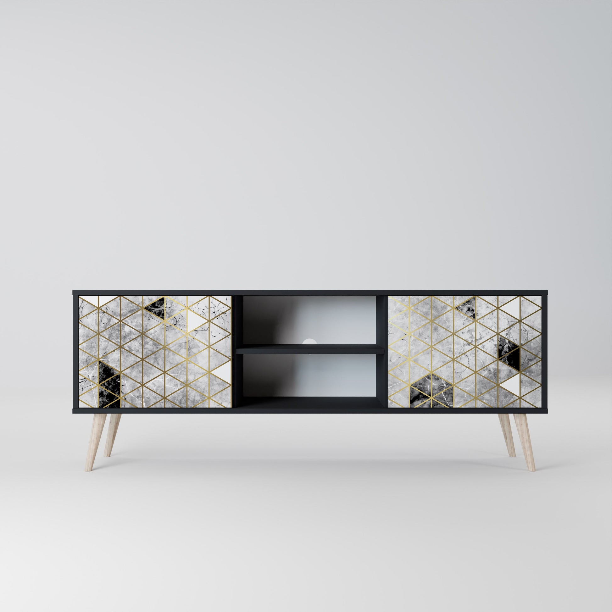 Il corpo nero conferisce al mobile TV un aspetto elegante e moderno, mentre i frontali con una stampa eccezionale attirano l'attenzione, rendendolo il punto focale di ogni stanza. L'interno spazioso offre spazio per dispositivi elettronici, cavi, telecomandi e altri accessori, aiutandoti a mantenere ordine e organizzazione.