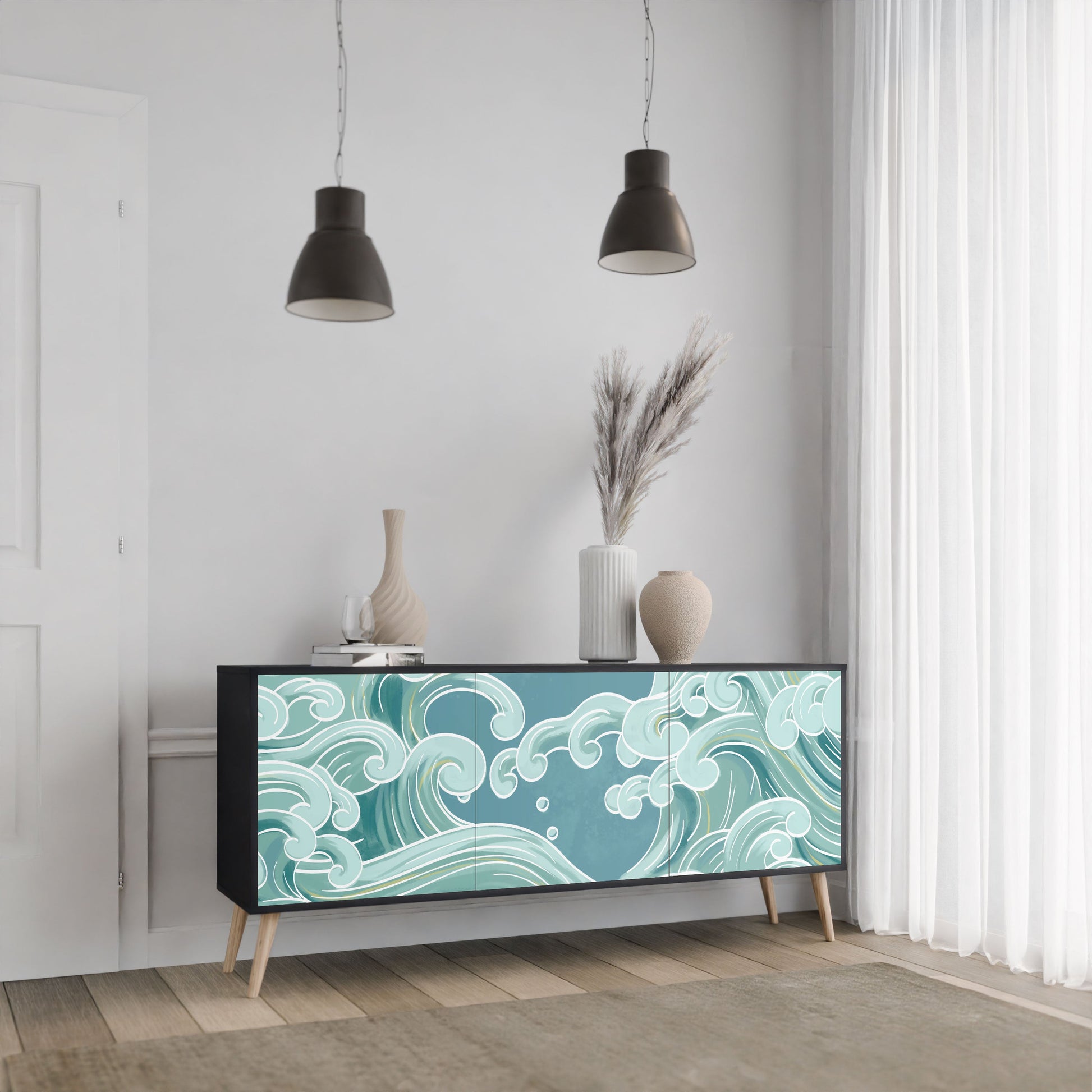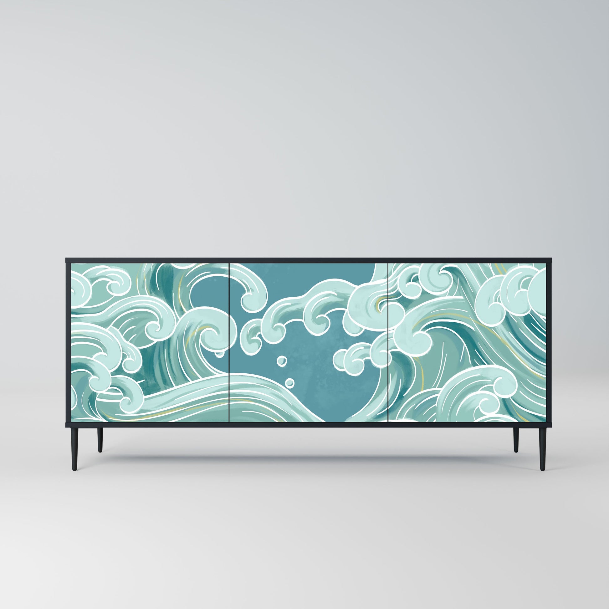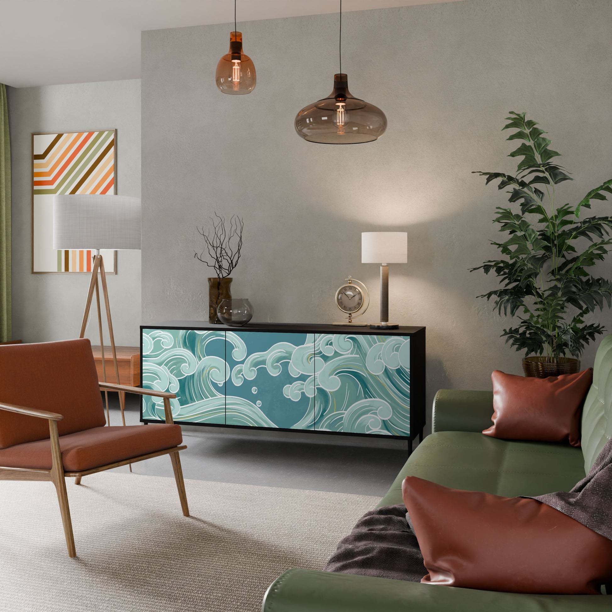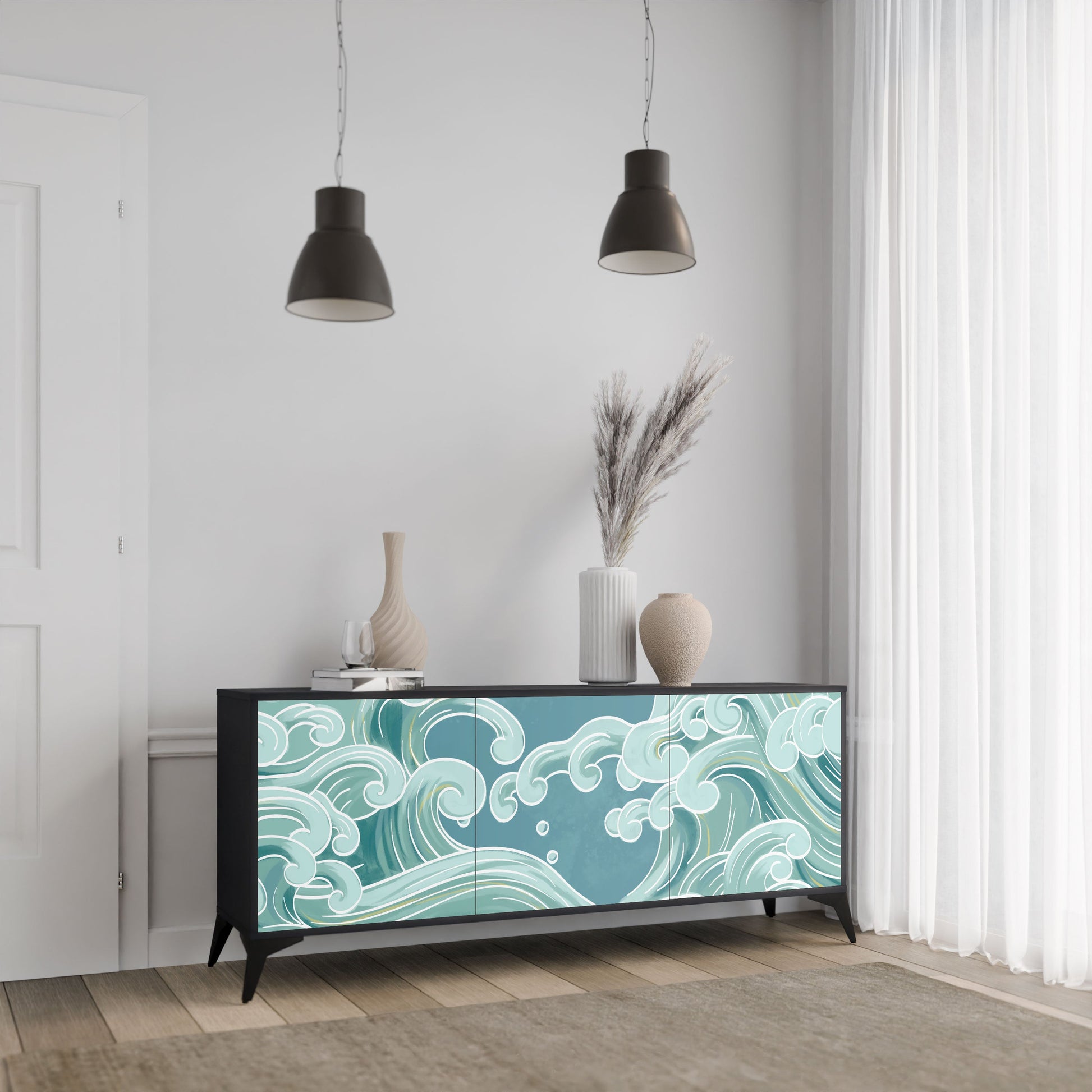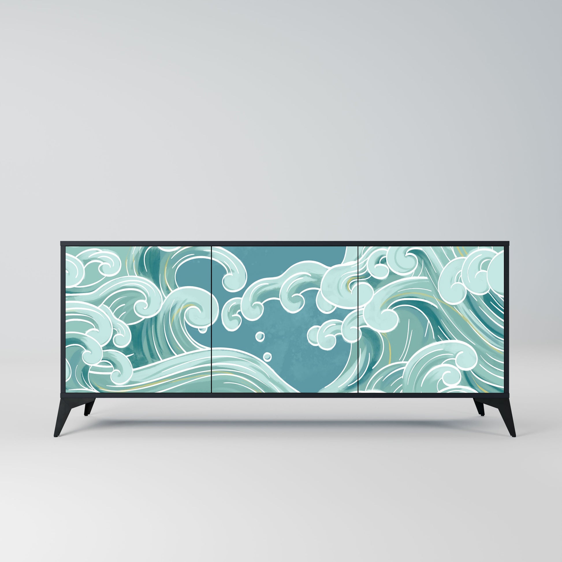 Eleganza e funzionalità in un unico mobile: la nostra credenza a 3 ante con corpo nero è la soluzione perfetta per gli amanti degli interni eleganti e moderni. Il corpo nero enfatizza il carattere audace del mobile, mentre i frontali con una stampa unica aggiungono un tocco artistico. Si adatta perfettamente al soggiorno, alla camera da letto o all'ufficio, completando sia gli arrangiamenti moderni che quelli industriali.