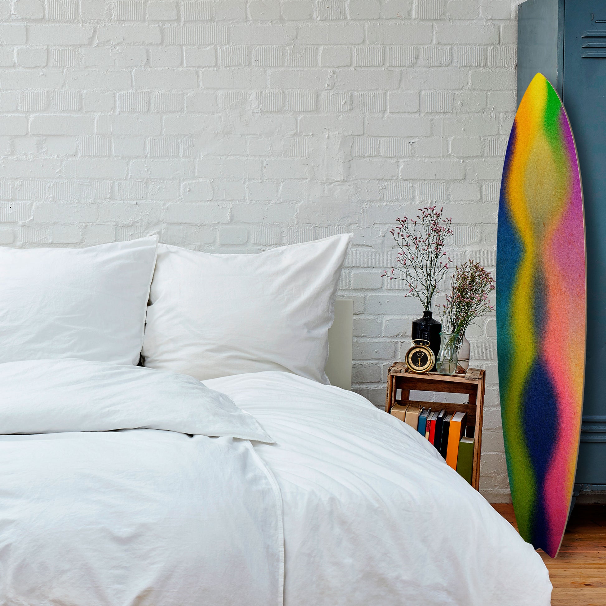 The surfboard has been designed with maximum functionality and arrangement flexibility in mind. It can be hung vertically or horizontally, or displayed freestanding by leaning it against a wall, dresser, or shelf. This makes it easy to adapt the piece to the character of the space and changing interior needs.
