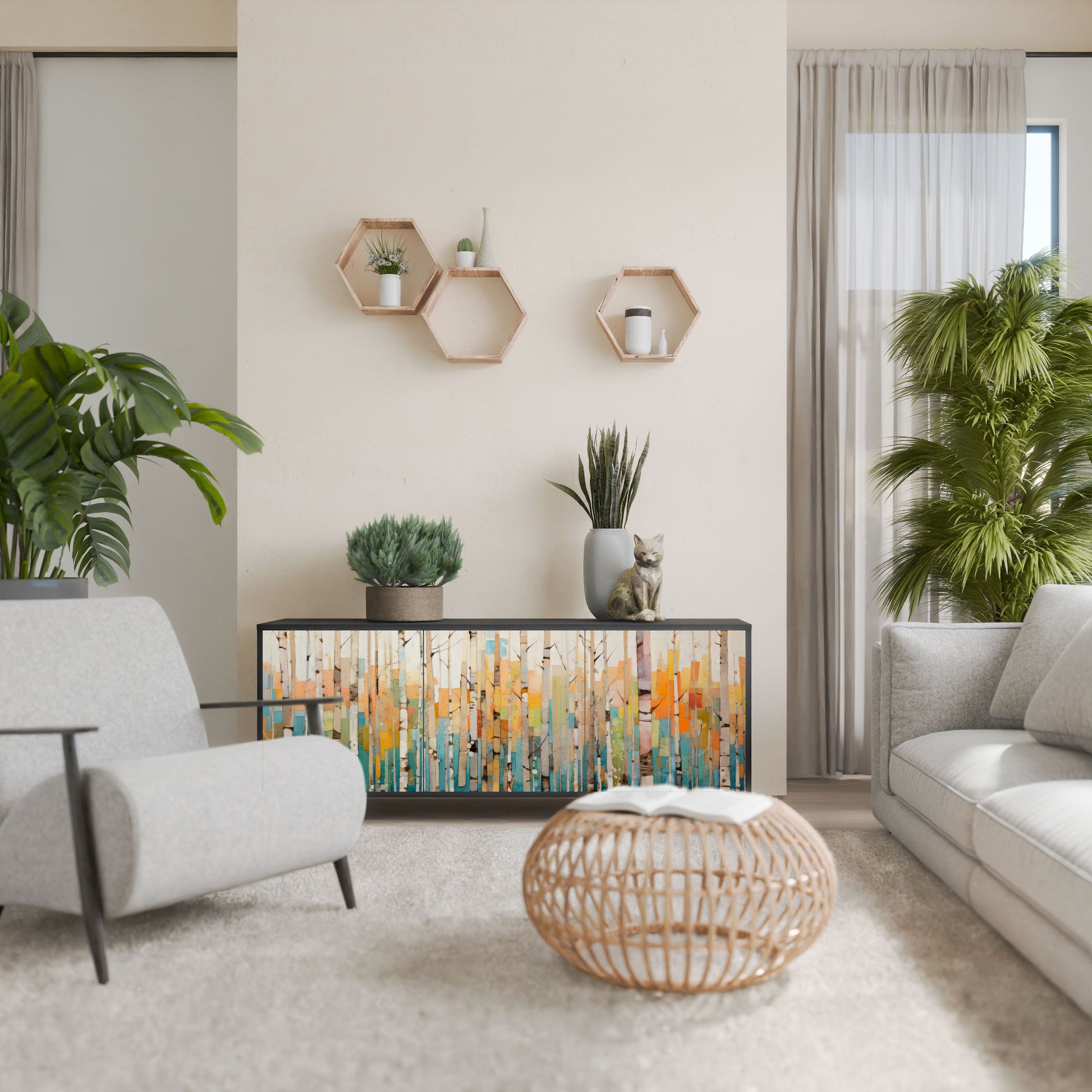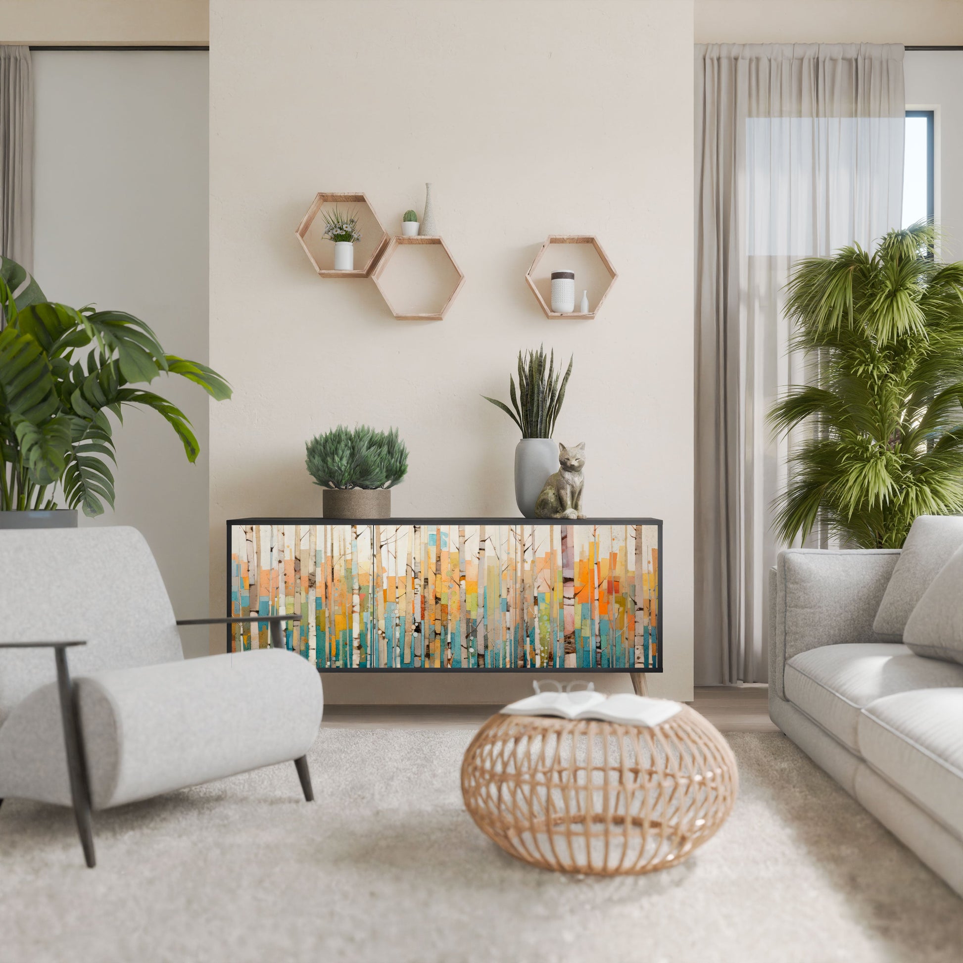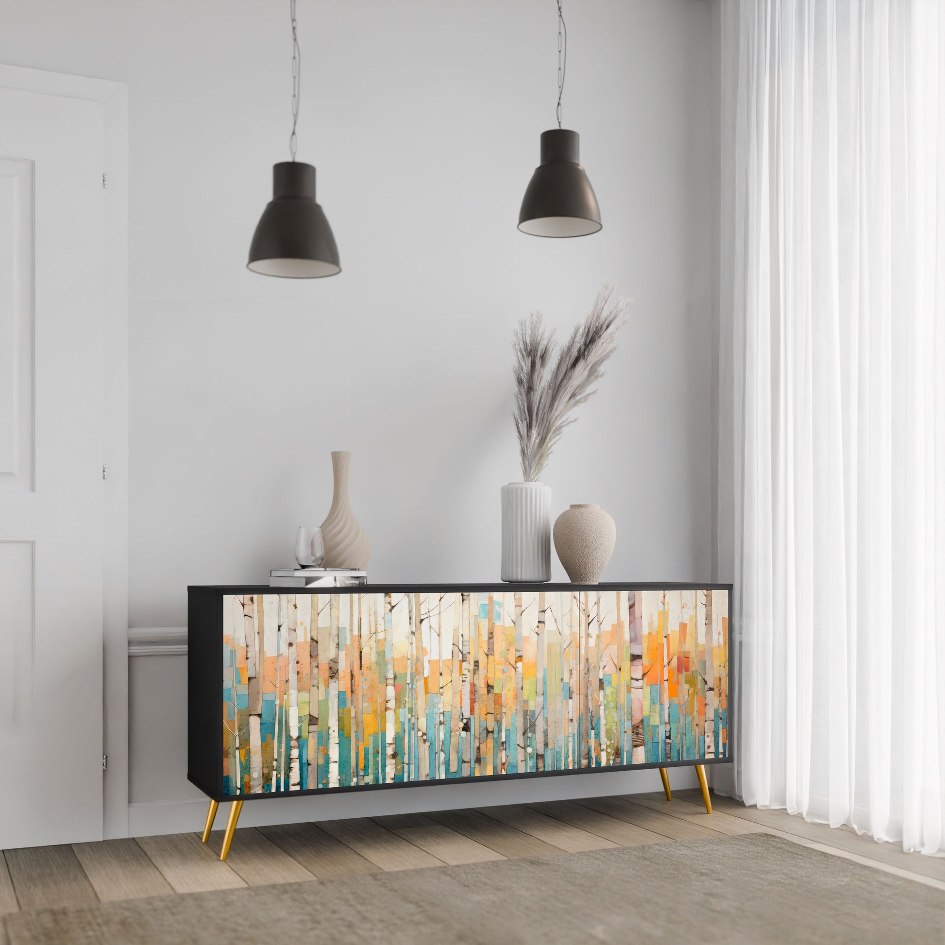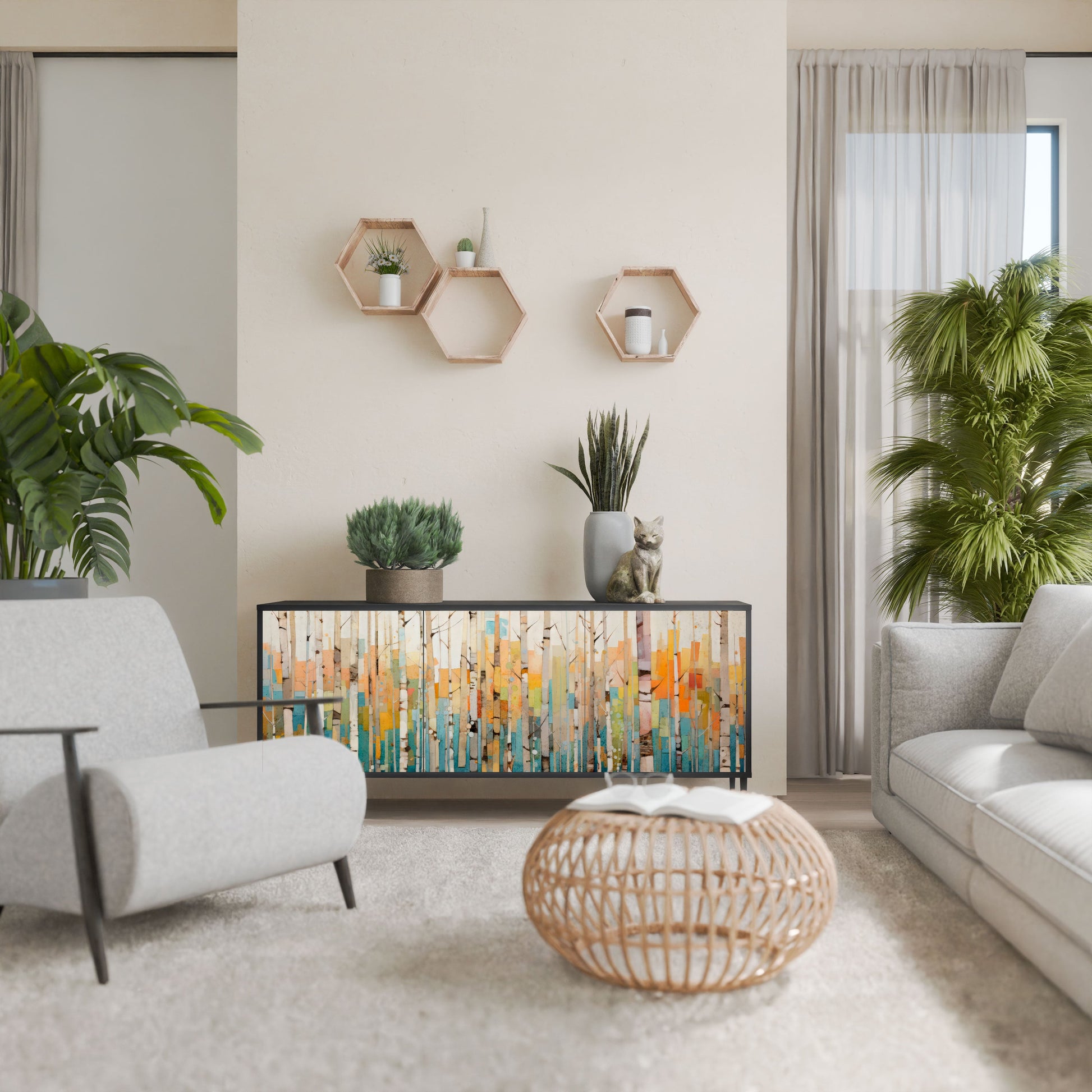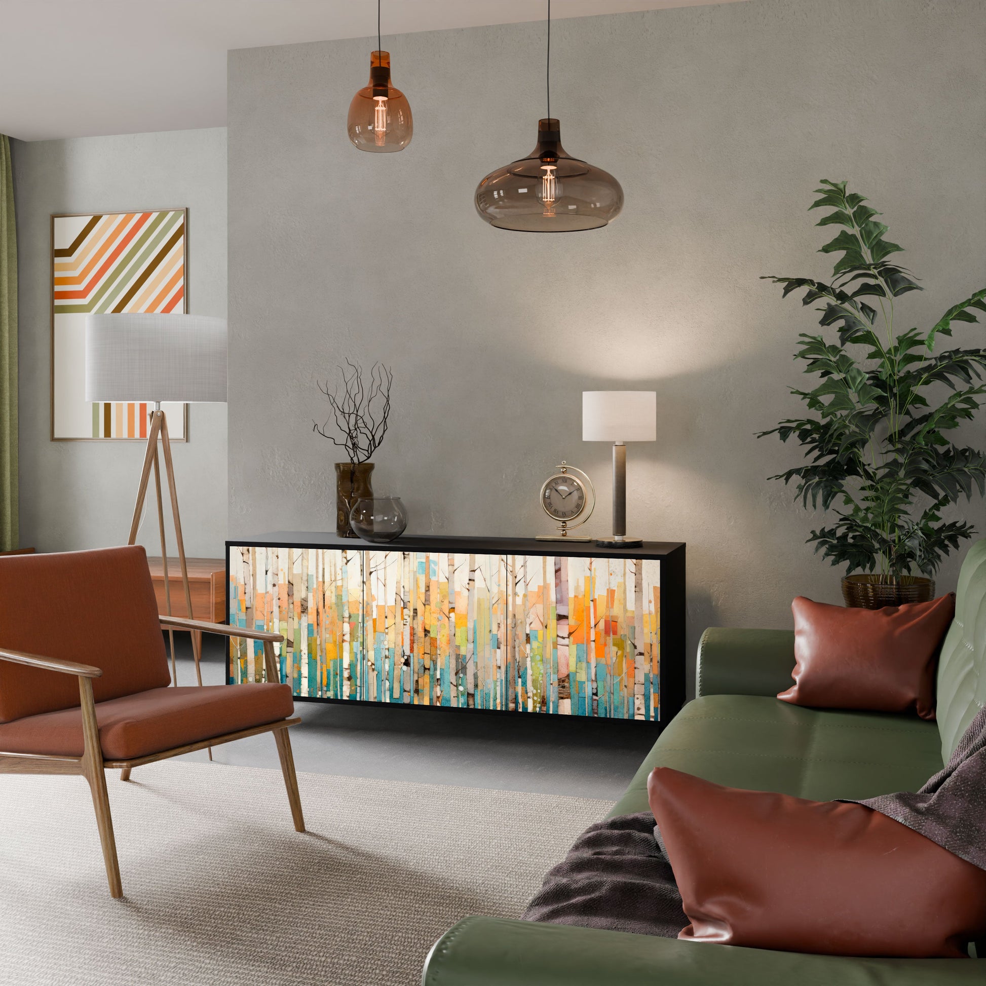 Eleganza e funzionalità in un unico mobile: la nostra credenza a 3 ante con corpo nero è la soluzione perfetta per gli amanti degli interni eleganti e moderni. Il corpo nero enfatizza il carattere audace del mobile, mentre i frontali con una stampa unica aggiungono un tocco artistico. Si adatta perfettamente al soggiorno, alla camera da letto o all'ufficio, completando sia gli arrangiamenti moderni che quelli industriali.