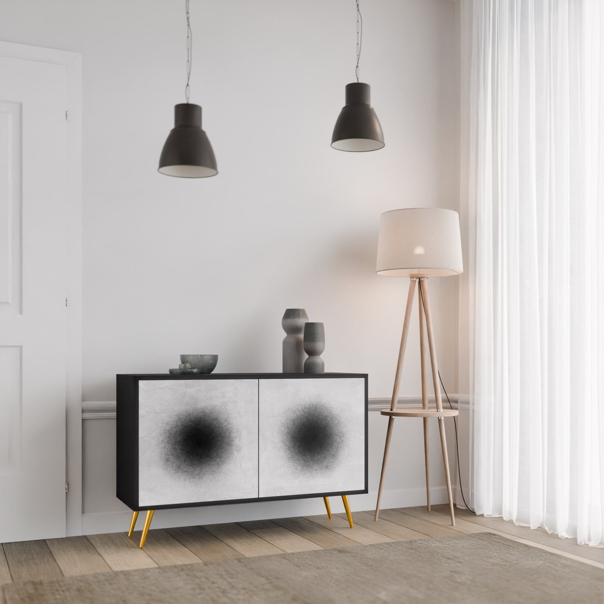 Eleganza e funzionalità in un unico mobile: la nostra credenza a 2 ante con corpo nero è la soluzione perfetta per gli amanti degli interni eleganti e moderni. Il corpo nero enfatizza il carattere audace del mobile, mentre i frontali con una stampa unica aggiungono un tocco artistico. Si adatta perfettamente al soggiorno, alla camera da letto o all'ufficio, completando sia gli arrangiamenti moderni che quelli industriali.