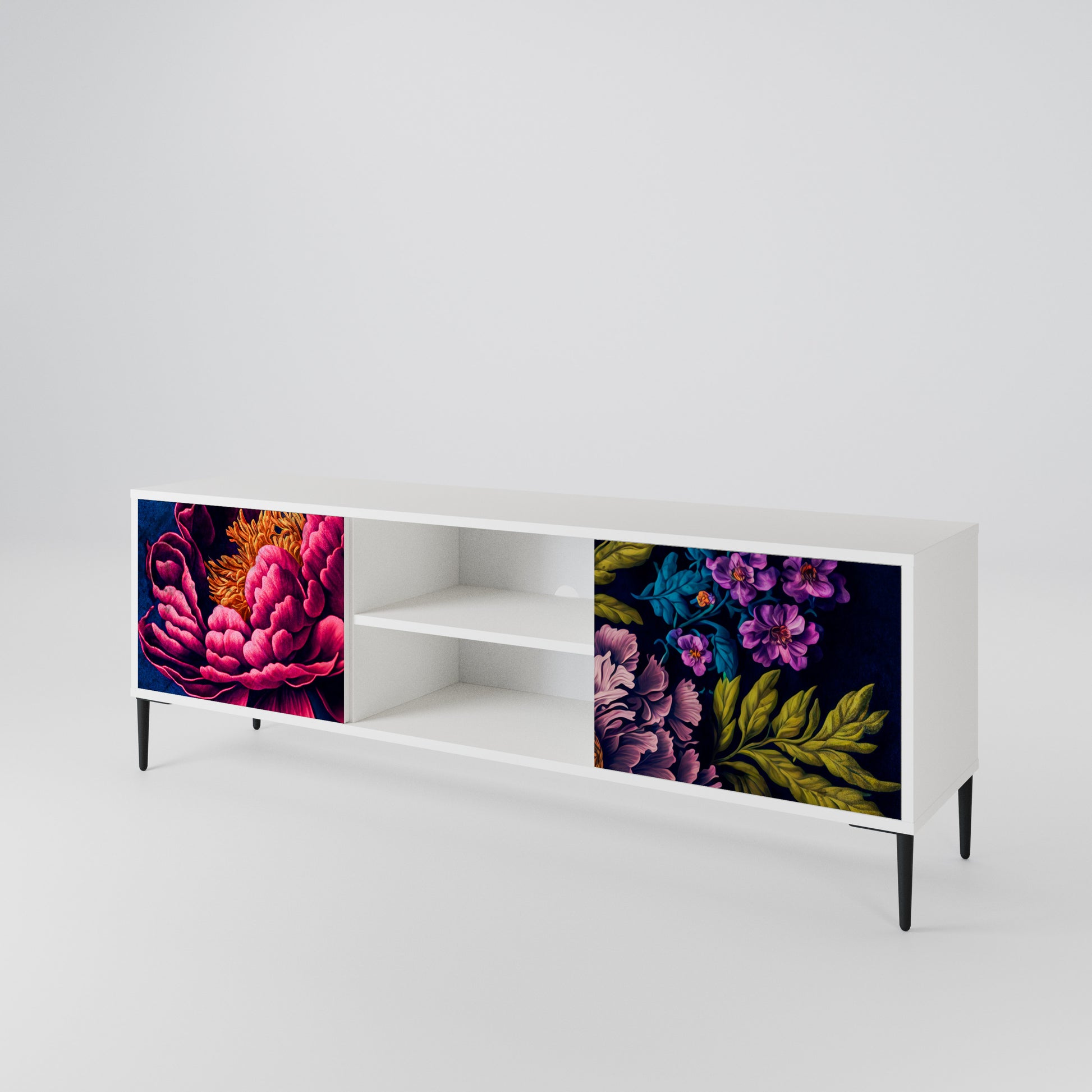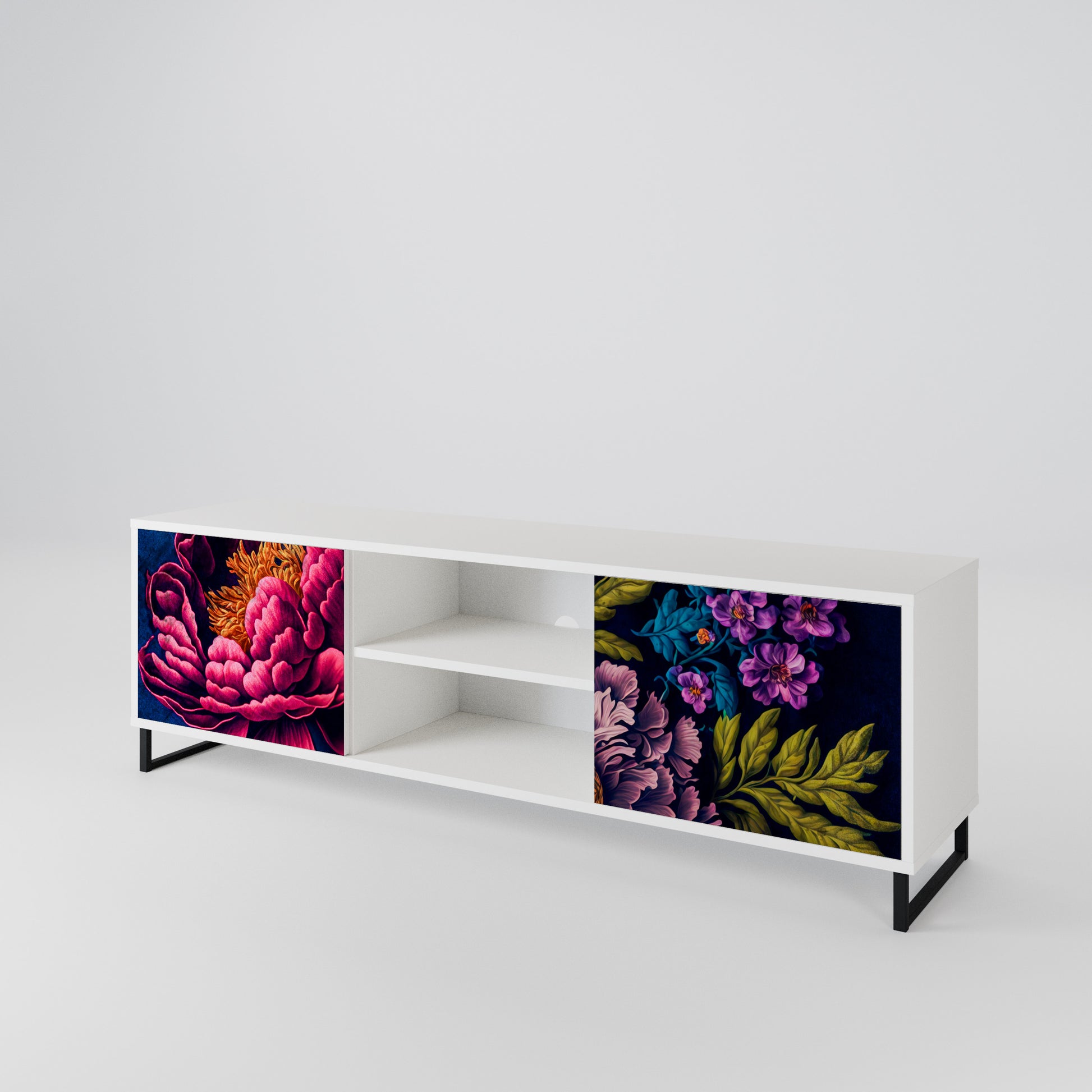 Il corpo bianco conferisce al mobile TV un aspetto luminoso e raffinato, mentre i frontali con una stampa eccezionale catturano l'attenzione, diventando il punto focale di qualsiasi stanza. Lo spazioso interno offre spazio per dispositivi elettronici, cavi, telecomandi e altri accessori, aiutandoti a mantenere ordine e organizzazione.
