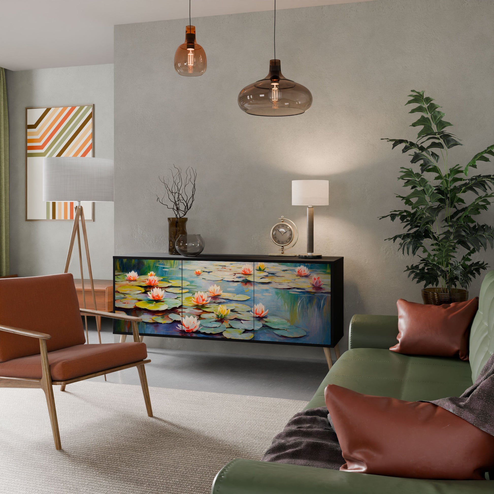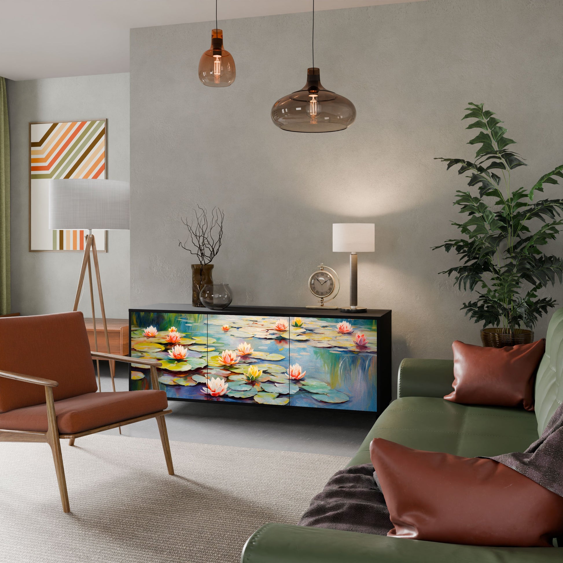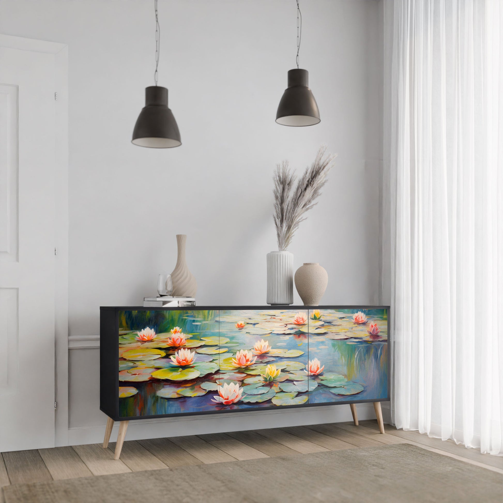 Eleganza e funzionalità in un unico mobile: la nostra credenza a 3 ante con corpo nero è la soluzione perfetta per gli amanti degli interni eleganti e moderni. Il corpo nero enfatizza il carattere audace del mobile, mentre i frontali con una stampa unica aggiungono un tocco artistico. Si adatta perfettamente al soggiorno, alla camera da letto o all'ufficio, completando sia gli arrangiamenti moderni che quelli industriali.