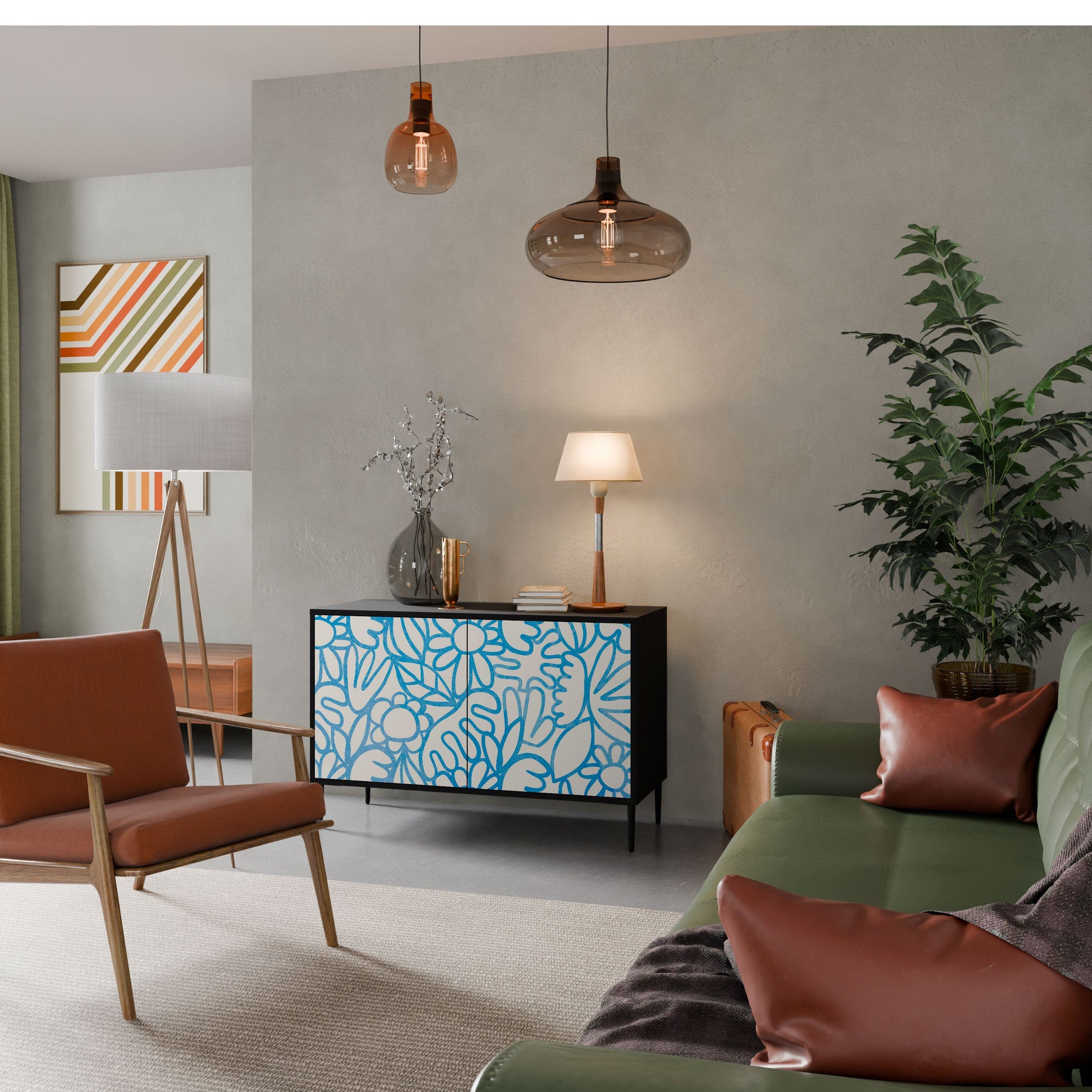 Eleganza e funzionalità in un unico mobile: la nostra credenza a 2 ante con corpo nero è la soluzione perfetta per gli amanti degli interni eleganti e moderni. Il corpo nero enfatizza il carattere audace del mobile, mentre i frontali con una stampa unica aggiungono un tocco artistico. Si adatta perfettamente al soggiorno, alla camera da letto o all'ufficio, completando sia gli arrangiamenti moderni che quelli industriali.