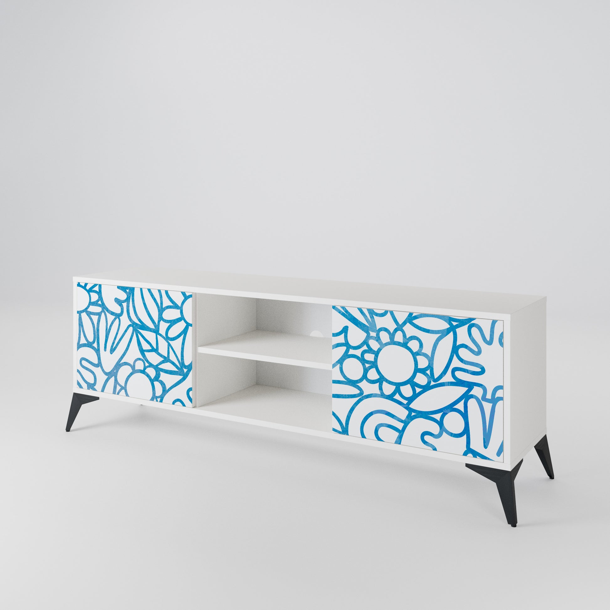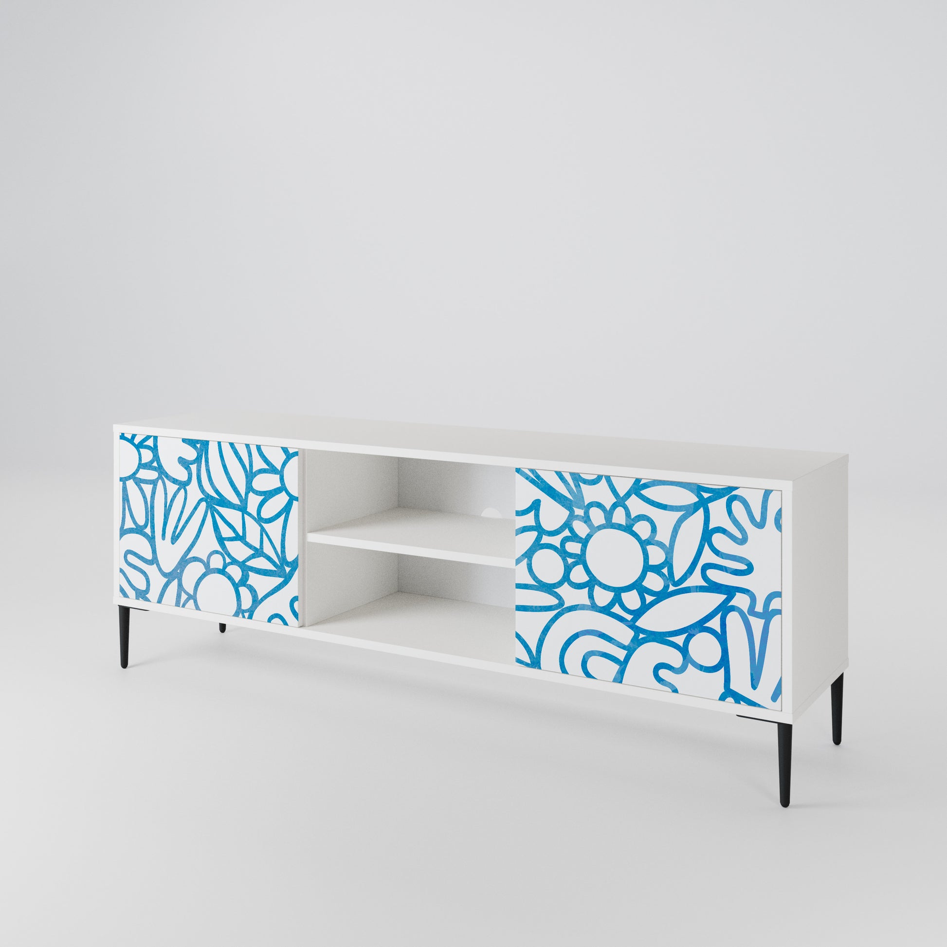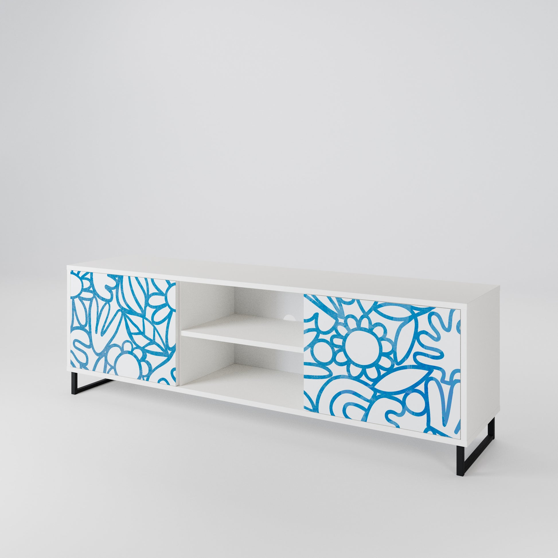 Il corpo bianco conferisce al mobile TV un aspetto luminoso e raffinato, mentre i frontali con una stampa eccezionale catturano l'attenzione, diventando il punto focale di qualsiasi stanza. Lo spazioso interno offre spazio per dispositivi elettronici, cavi, telecomandi e altri accessori, aiutandoti a mantenere ordine e organizzazione.