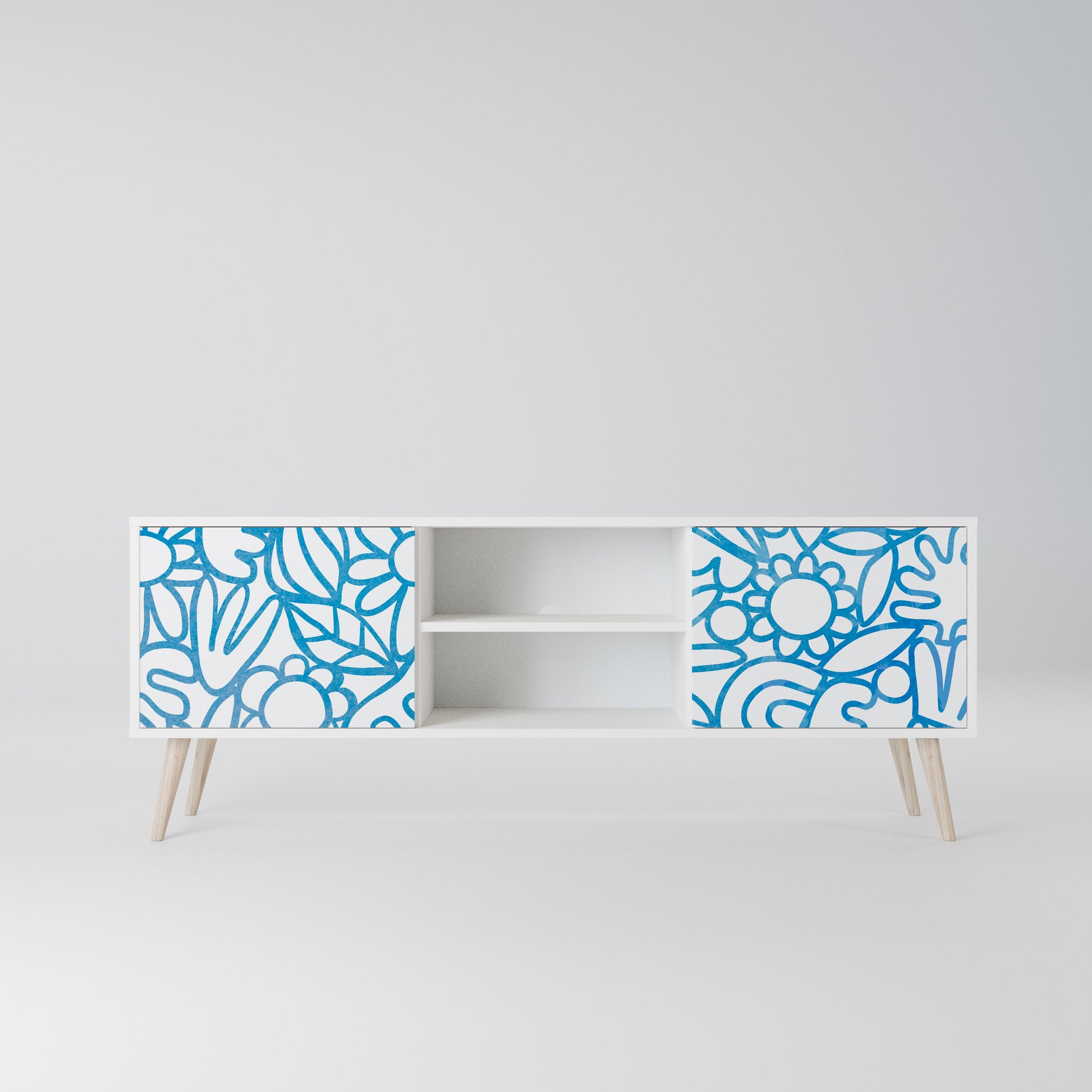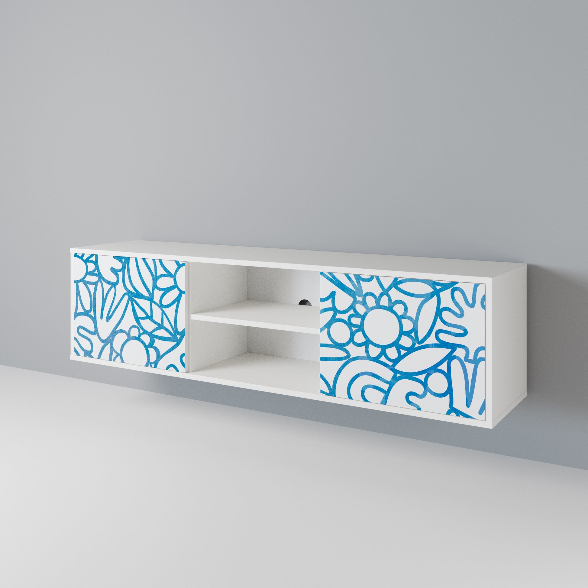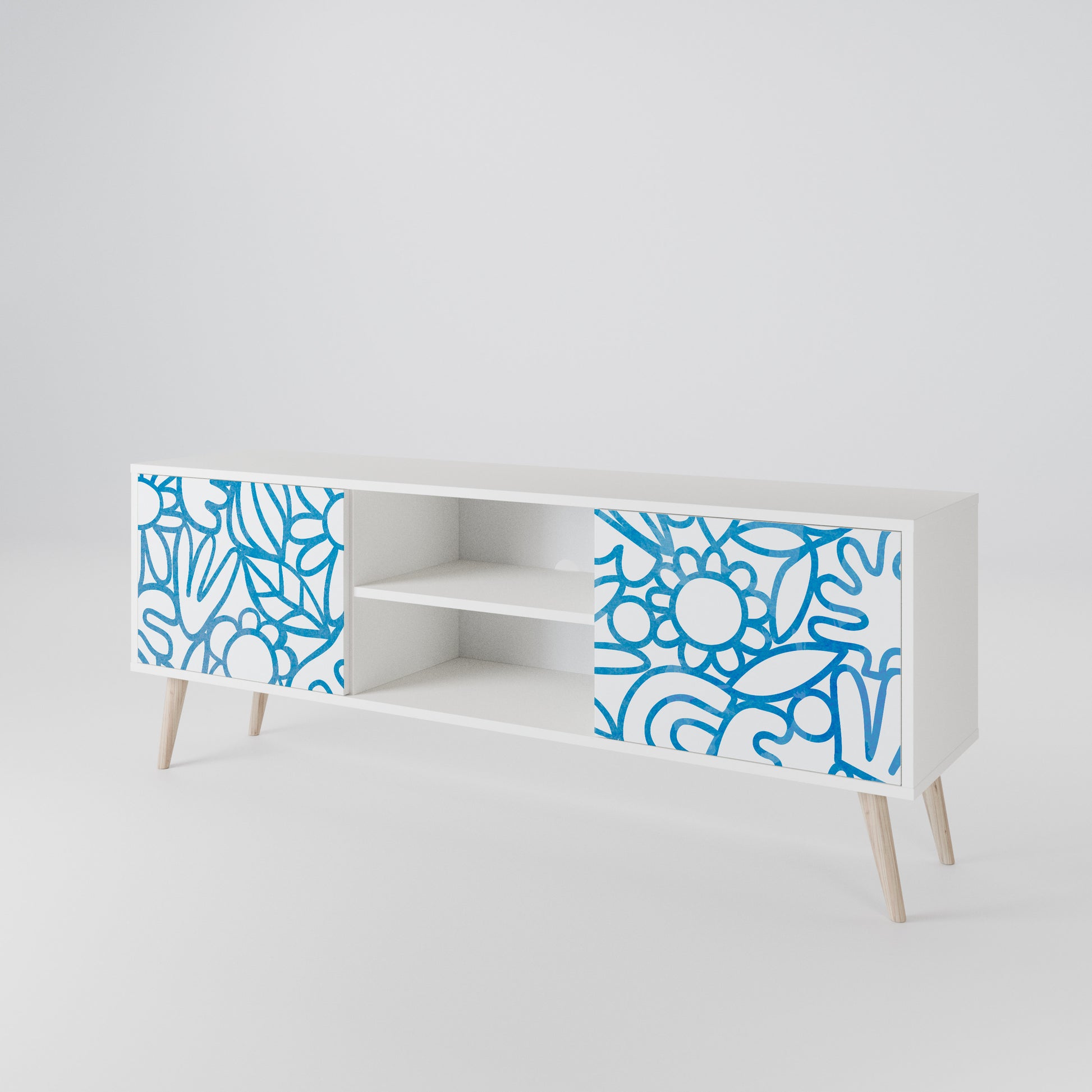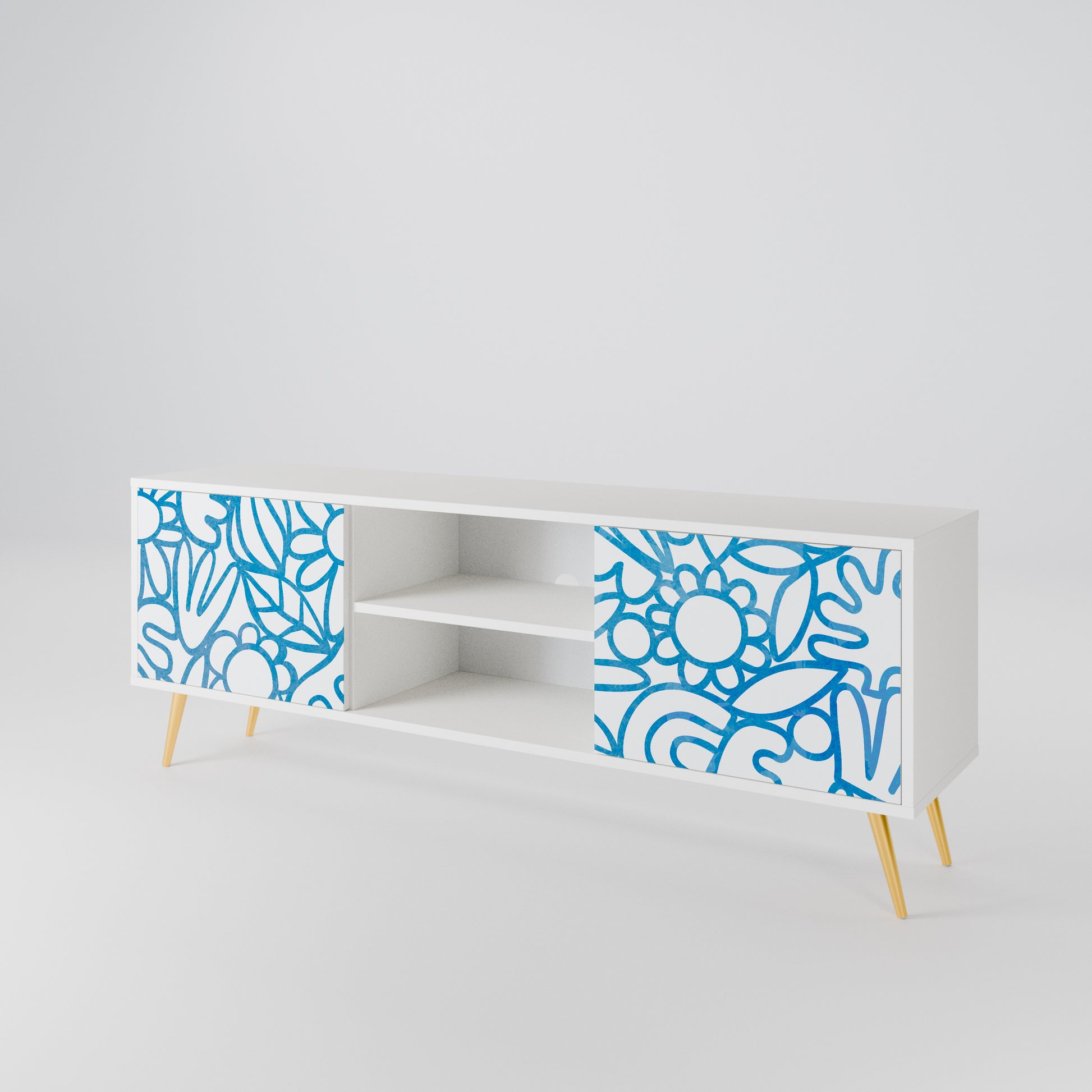 Il corpo bianco conferisce al mobile TV un aspetto luminoso e raffinato, mentre i frontali con una stampa eccezionale catturano l'attenzione, diventando il punto focale di qualsiasi stanza. Lo spazioso interno offre spazio per dispositivi elettronici, cavi, telecomandi e altri accessori, aiutandoti a mantenere ordine e organizzazione.