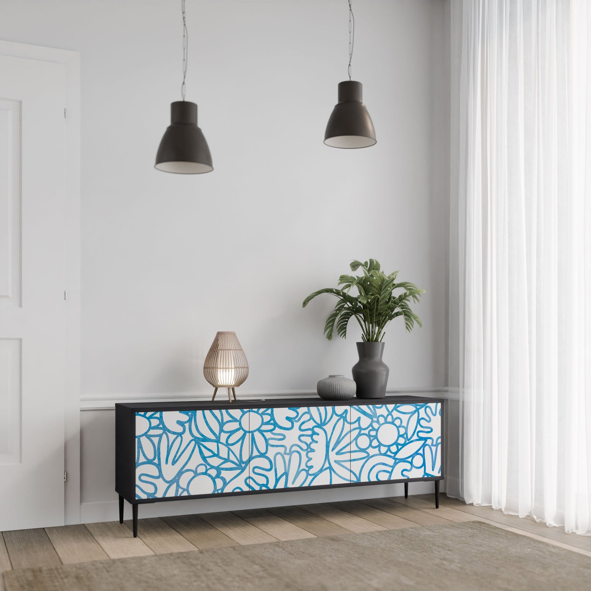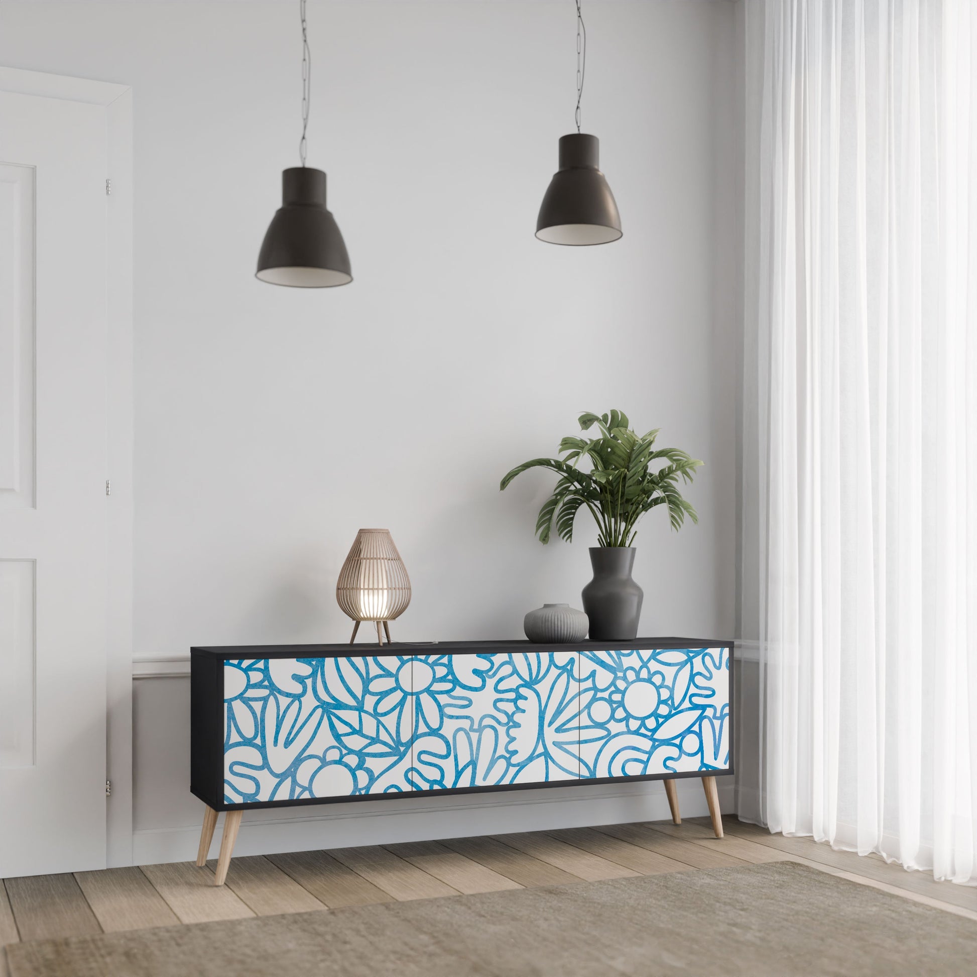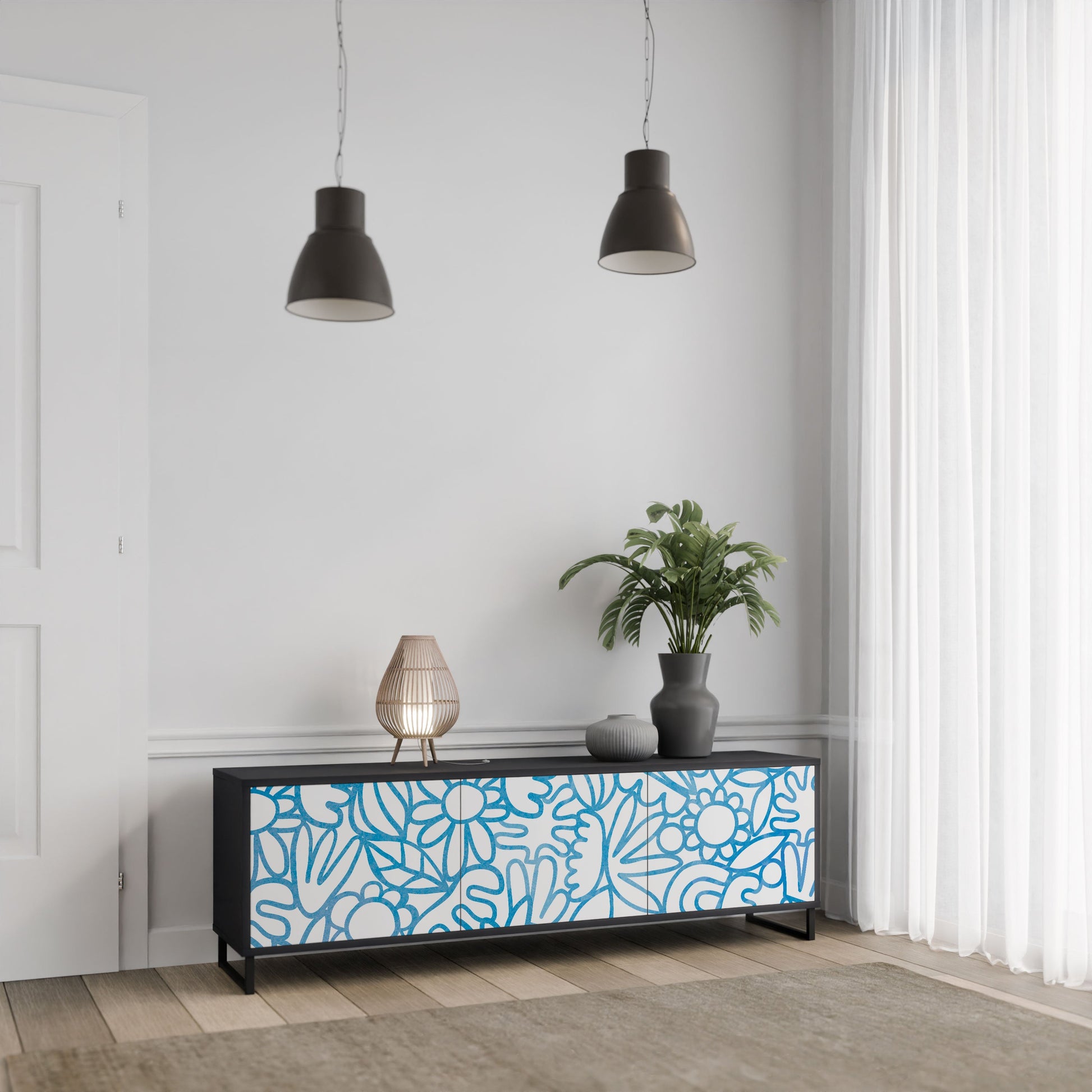Il corpo nero del supporto crea un accento audace e moderno che si abbina magnificamente ad allestimenti industriali e minimalisti. I frontali con una stampa di design aggiungono carattere e unicità, rendendo questo pezzo non solo pratico ma anche un elemento decorativo di spicco.