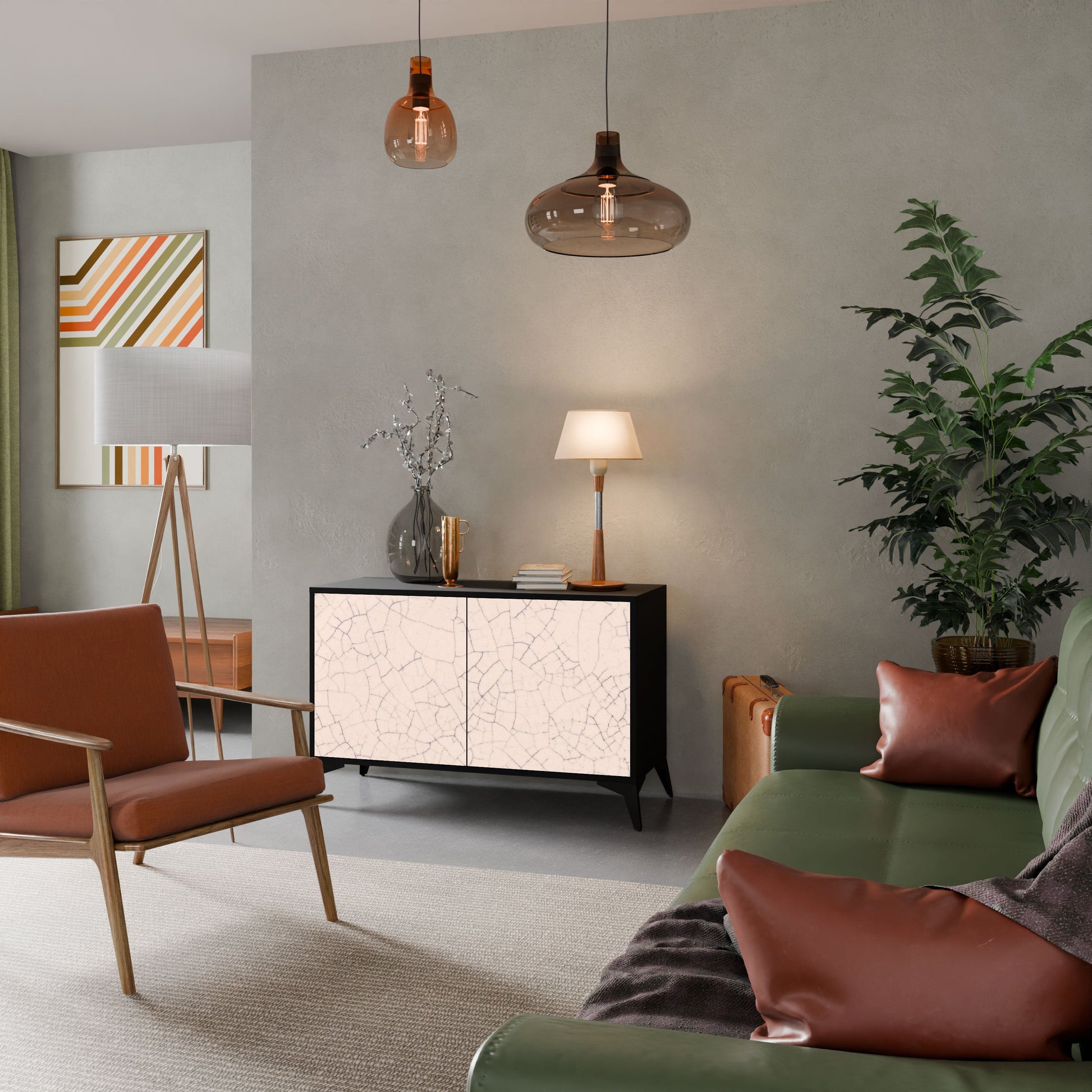 Eleganza e funzionalità in un unico mobile: la nostra credenza a 2 ante con corpo nero è la soluzione perfetta per gli amanti degli interni eleganti e moderni. Il corpo nero enfatizza il carattere audace del mobile, mentre i frontali con una stampa unica aggiungono un tocco artistico. Si adatta perfettamente al soggiorno, alla camera da letto o all'ufficio, completando sia gli arrangiamenti moderni che quelli industriali.