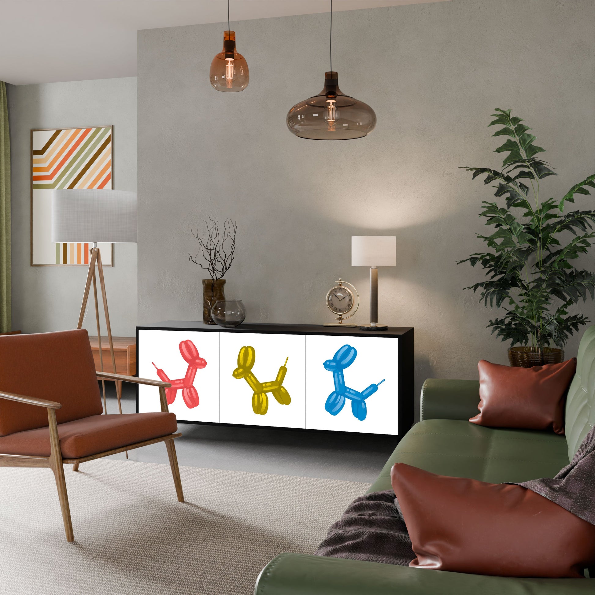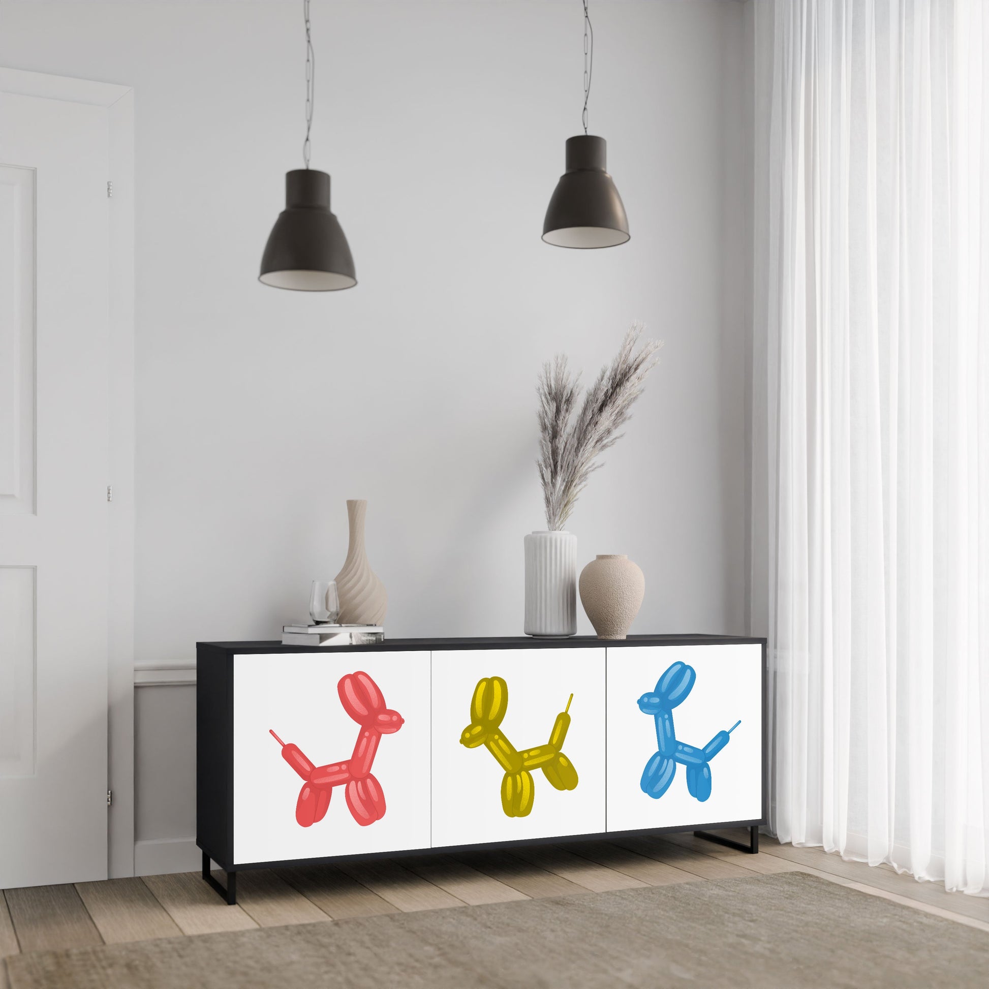 Eleganza e funzionalità in un unico mobile: la nostra credenza a 3 ante con corpo nero è la soluzione perfetta per gli amanti degli interni eleganti e moderni. Il corpo nero enfatizza il carattere audace del mobile, mentre i frontali con una stampa unica aggiungono un tocco artistico. Si adatta perfettamente al soggiorno, alla camera da letto o all'ufficio, completando sia gli arrangiamenti moderni che quelli industriali.