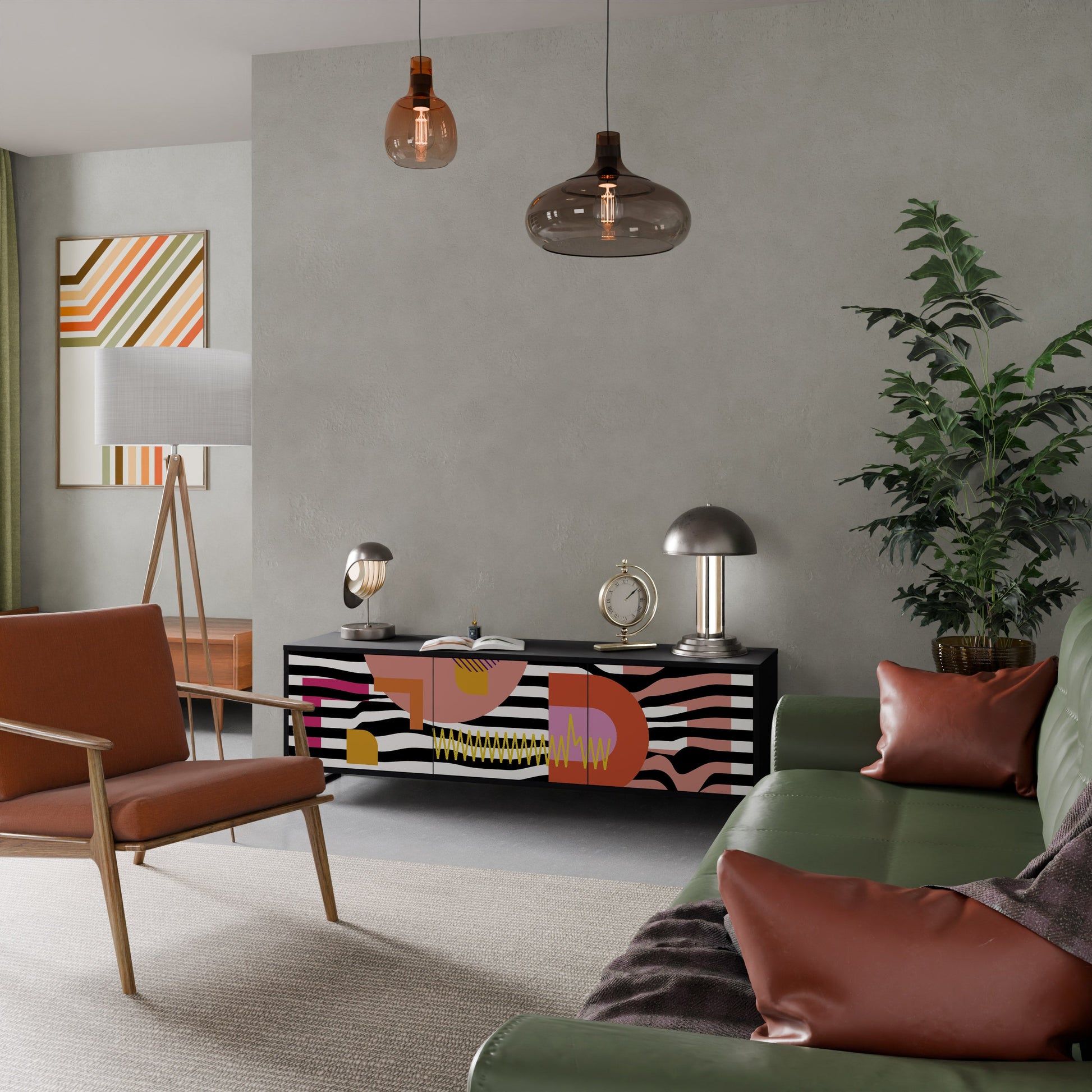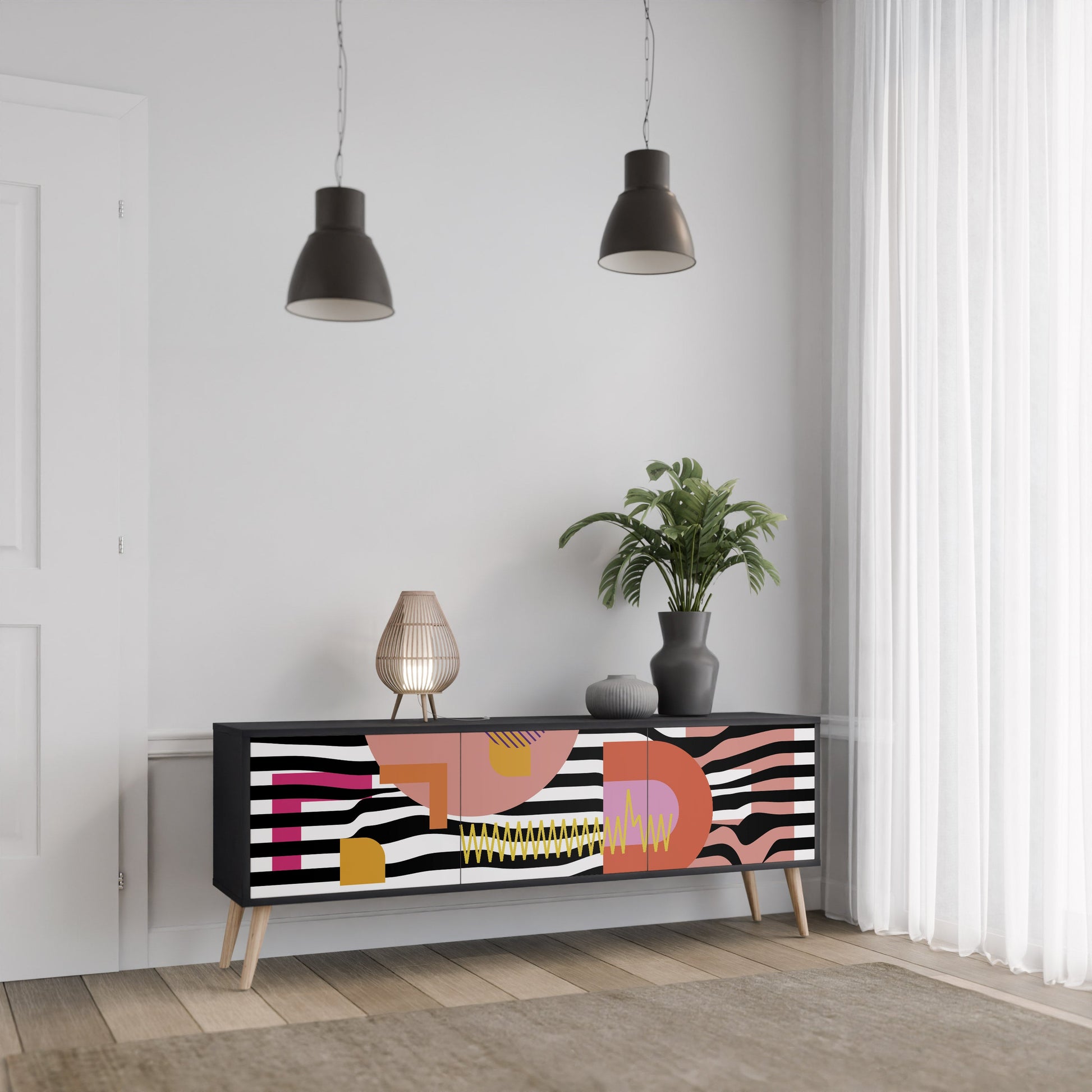 Il corpo nero del supporto crea un accento audace e moderno che si abbina magnificamente ad allestimenti industriali e minimalisti. I frontali con una stampa di design aggiungono carattere e unicità, rendendo questo pezzo non solo pratico ma anche un elemento decorativo di spicco.