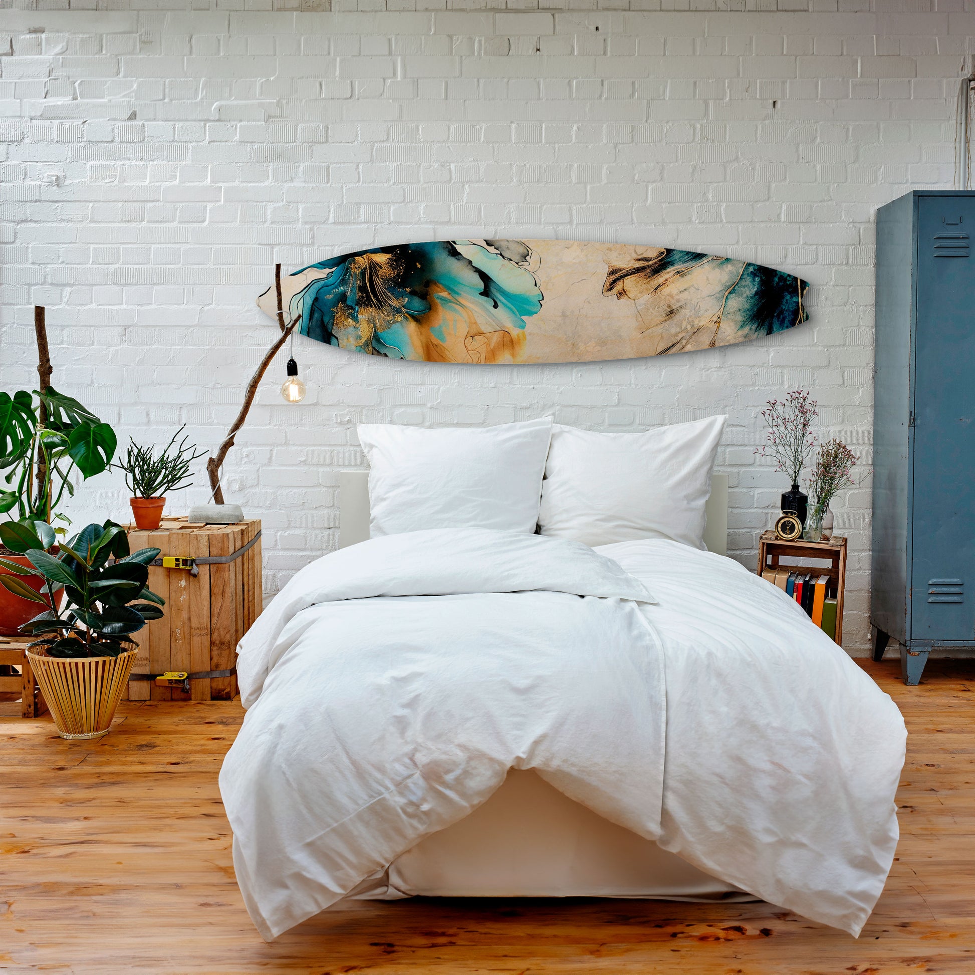 The surfboard has been designed with maximum functionality and arrangement flexibility in mind. It can be hung vertically or horizontally, or displayed freestanding by leaning it against a wall, dresser, or shelf. This makes it easy to adapt the piece to the character of the space and changing interior needs.