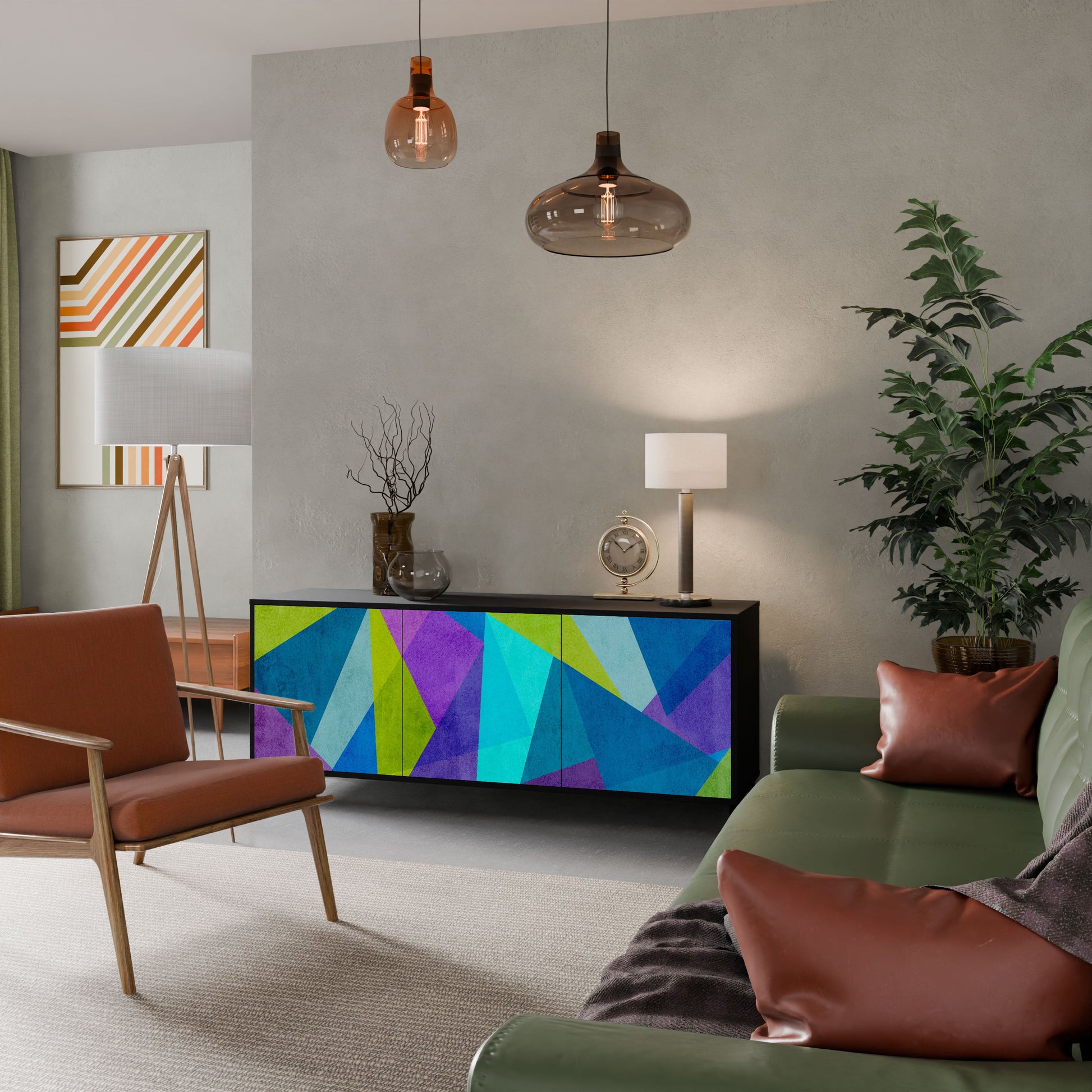 Eleganza e funzionalità in un unico mobile: la nostra credenza a 3 ante con corpo nero è la soluzione perfetta per gli amanti degli interni eleganti e moderni. Il corpo nero enfatizza il carattere audace del mobile, mentre i frontali con una stampa unica aggiungono un tocco artistico. Si adatta perfettamente al soggiorno, alla camera da letto o all'ufficio, completando sia gli arrangiamenti moderni che quelli industriali.