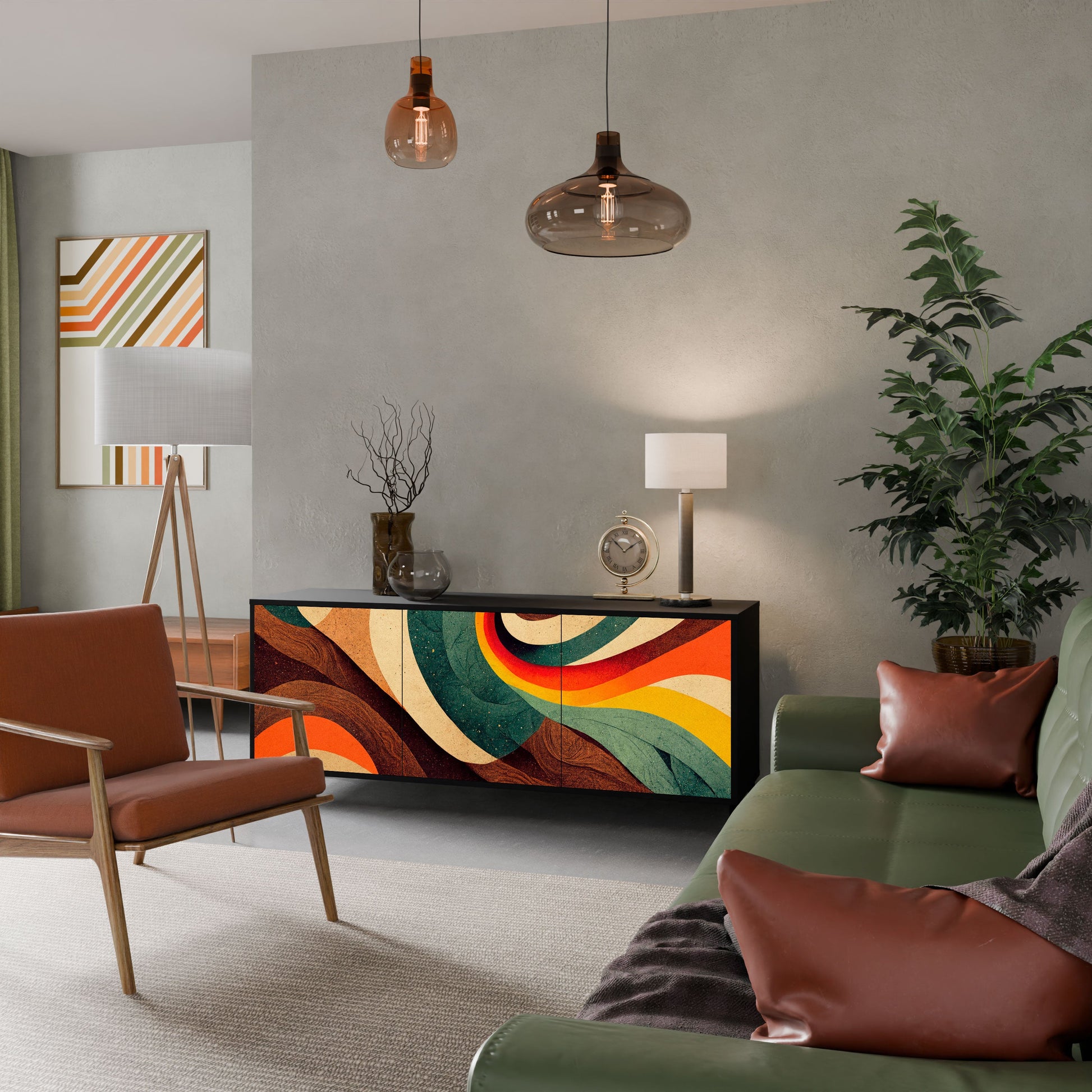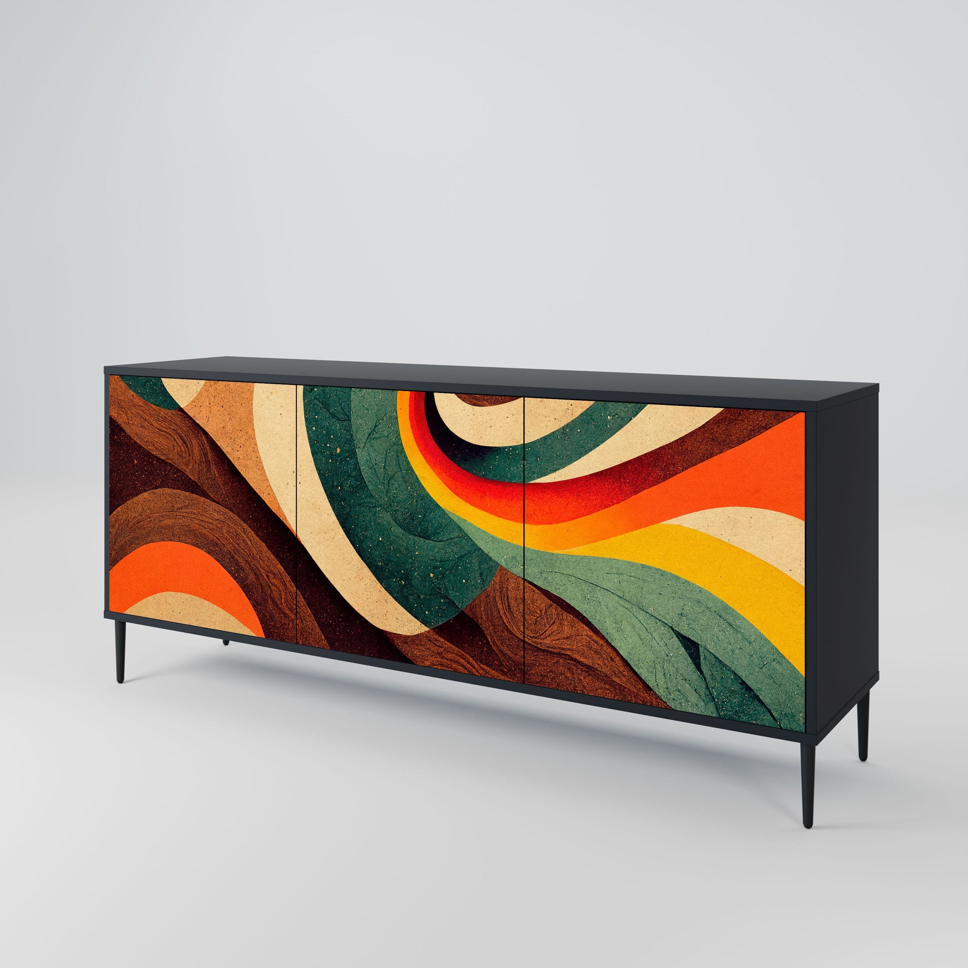 Eleganza e funzionalità in un unico mobile: la nostra credenza a 3 ante con corpo nero è la soluzione perfetta per gli amanti degli interni eleganti e moderni. Il corpo nero enfatizza il carattere audace del mobile, mentre i frontali con una stampa unica aggiungono un tocco artistico. Si adatta perfettamente al soggiorno, alla camera da letto o all'ufficio, completando sia gli arrangiamenti moderni che quelli industriali.