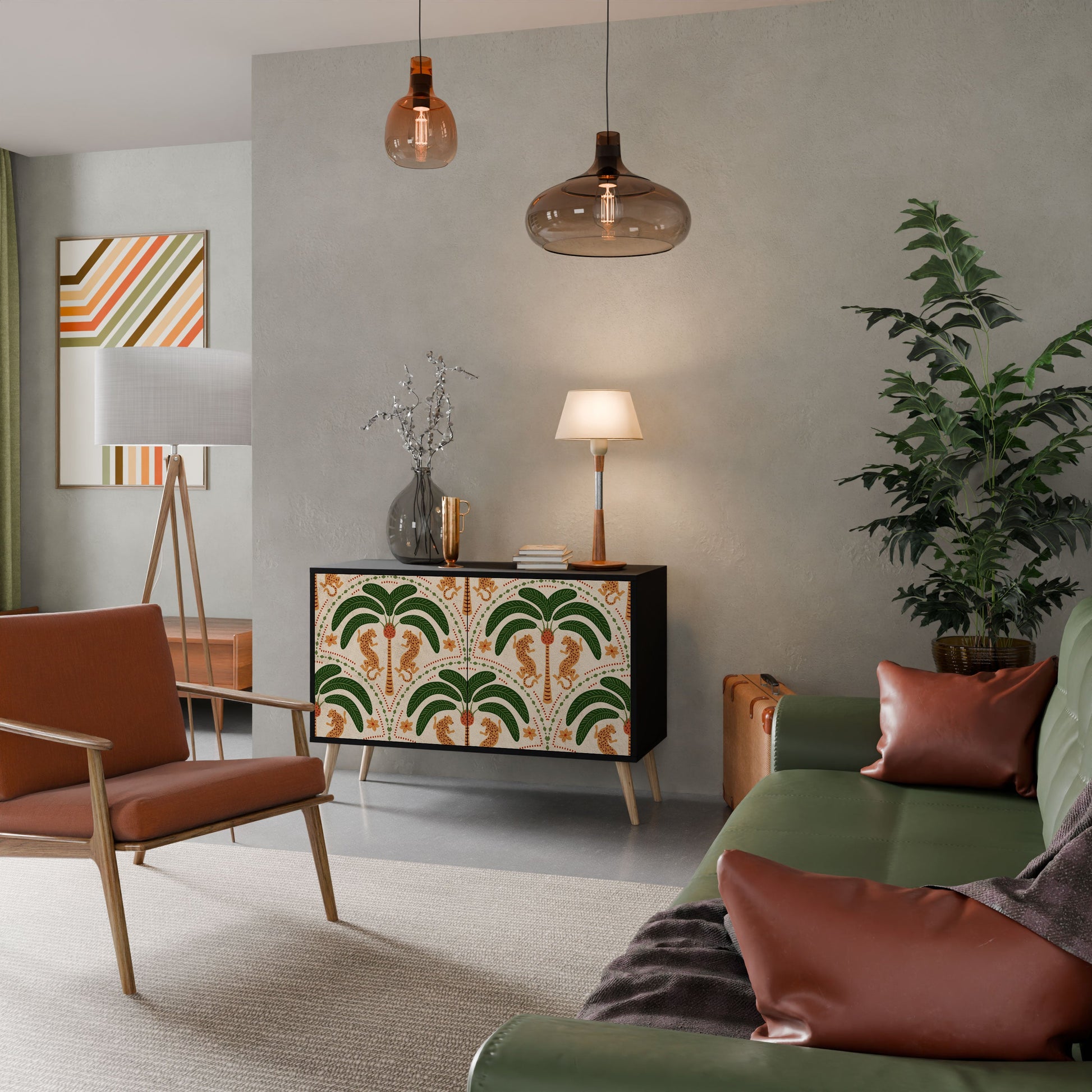 Eleganza e funzionalità in un unico mobile: la nostra credenza a 2 ante con corpo nero è la soluzione perfetta per gli amanti degli interni eleganti e moderni. Il corpo nero enfatizza il carattere audace del mobile, mentre i frontali con una stampa unica aggiungono un tocco artistico. Si adatta perfettamente al soggiorno, alla camera da letto o all'ufficio, completando sia gli arrangiamenti moderni che quelli industriali.