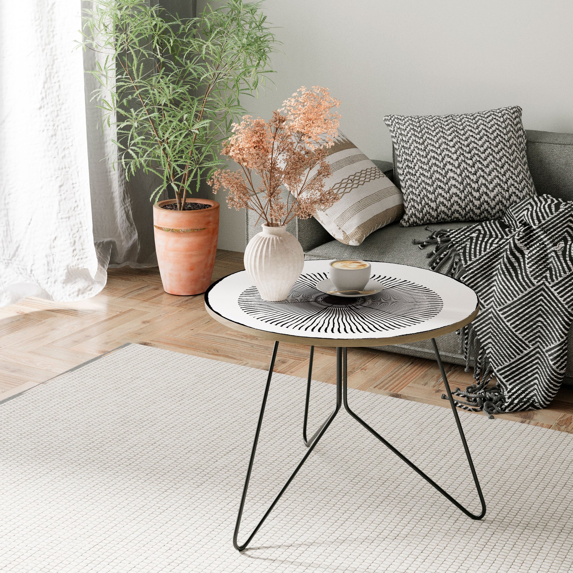 Scopri la versatilità e lo stile dei nostri tavolini da caffè di design, ora disponibili in quattro eleganti combinazioni di finiture per gambe e bordi del piano. Che tu preferisca la calda eleganza delle gambe dorate o la moderna raffinatezza delle gambe nere, ogni opzione si abbina perfettamente all'effetto rovere naturale o all'elegante bordo nero del piano, permettendoti di adattare il tavolo al tuo arredamento.