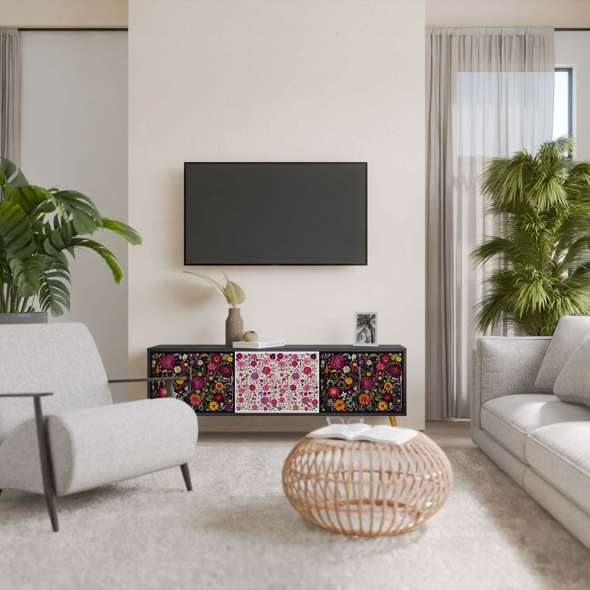 Scopri il perfetto equilibrio tra stile e funzionalità! Il nostro mobile TV a 3 ante con corpo nero porta eleganza moderna e il massimo spazio contenitivo nel tuo soggiorno. È la scelta ideale per la zona living, offrendo un piano per la TV e spazio dedicato a dispositivi elettronici, accessori e decorazioni.