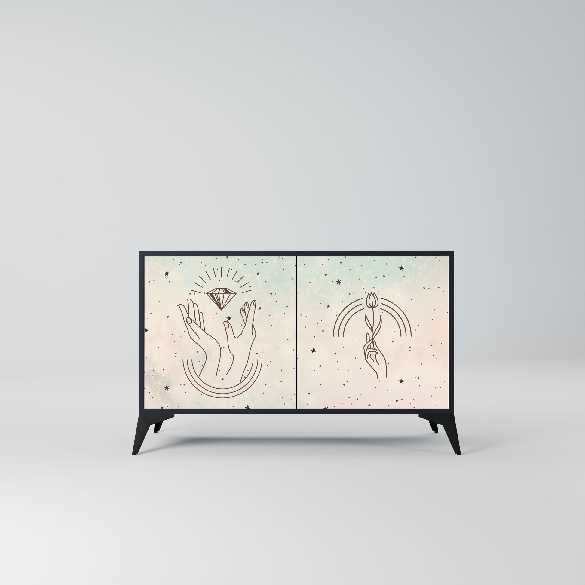 Eleganza e funzionalità in un unico mobile: la nostra credenza a 2 ante con corpo nero è la soluzione perfetta per gli amanti degli interni eleganti e moderni. Il corpo nero enfatizza il carattere audace del mobile, mentre i frontali con una stampa unica aggiungono un tocco artistico. Si adatta perfettamente al soggiorno, alla camera da letto o all'ufficio, completando sia gli arrangiamenti moderni che quelli industriali.
