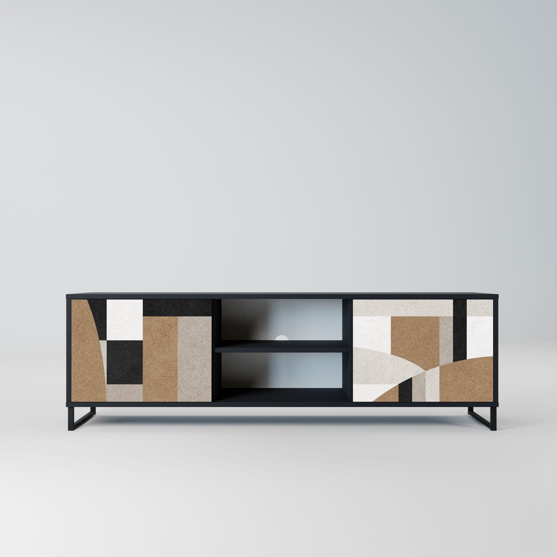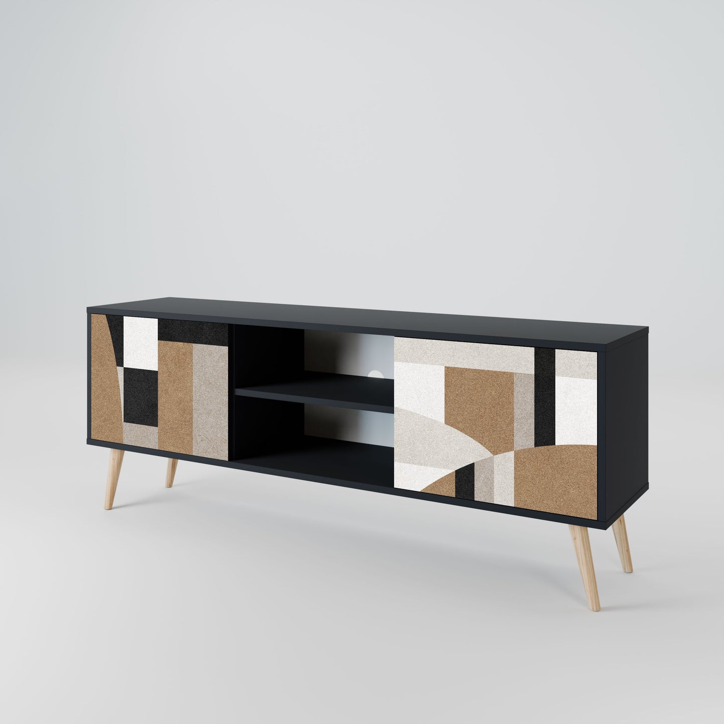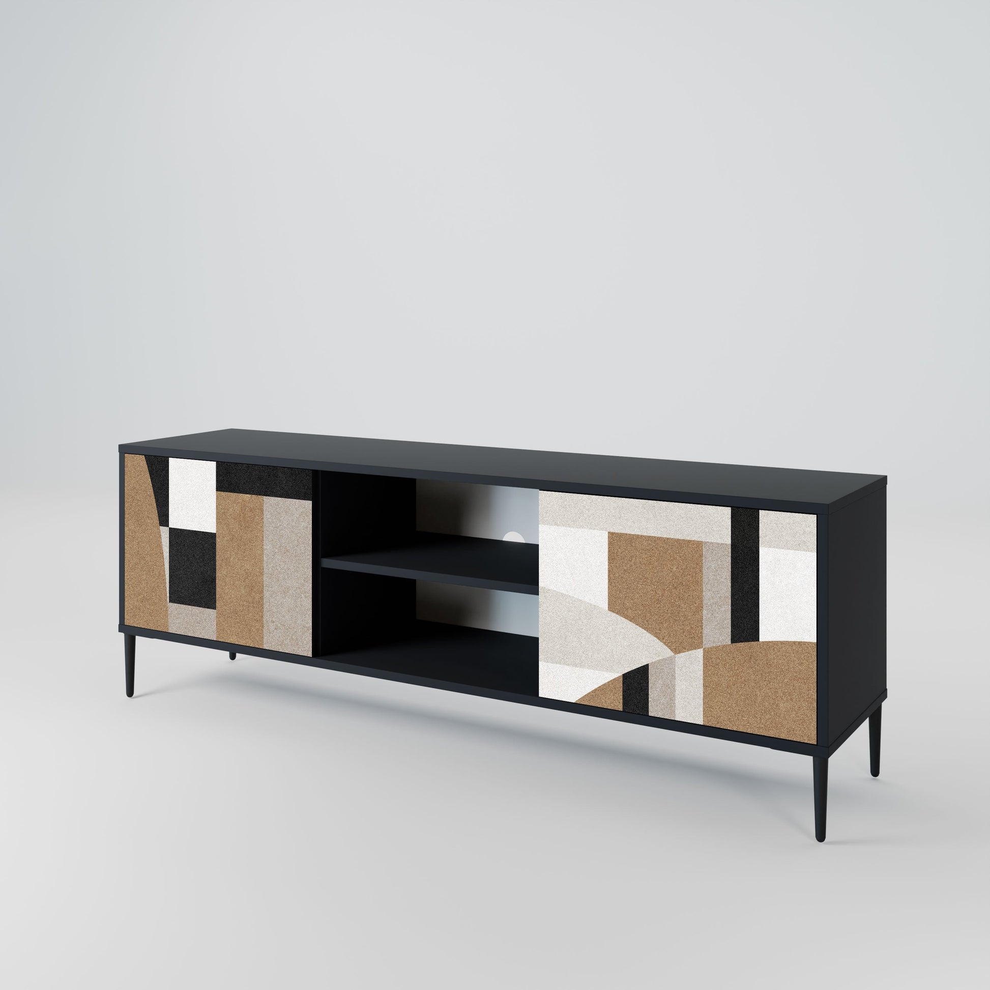 Il corpo nero conferisce al mobile TV un aspetto elegante e moderno, mentre i frontali con una stampa eccezionale attirano l'attenzione, rendendolo il punto focale di ogni stanza. L'interno spazioso offre spazio per dispositivi elettronici, cavi, telecomandi e altri accessori, aiutandoti a mantenere ordine e organizzazione.