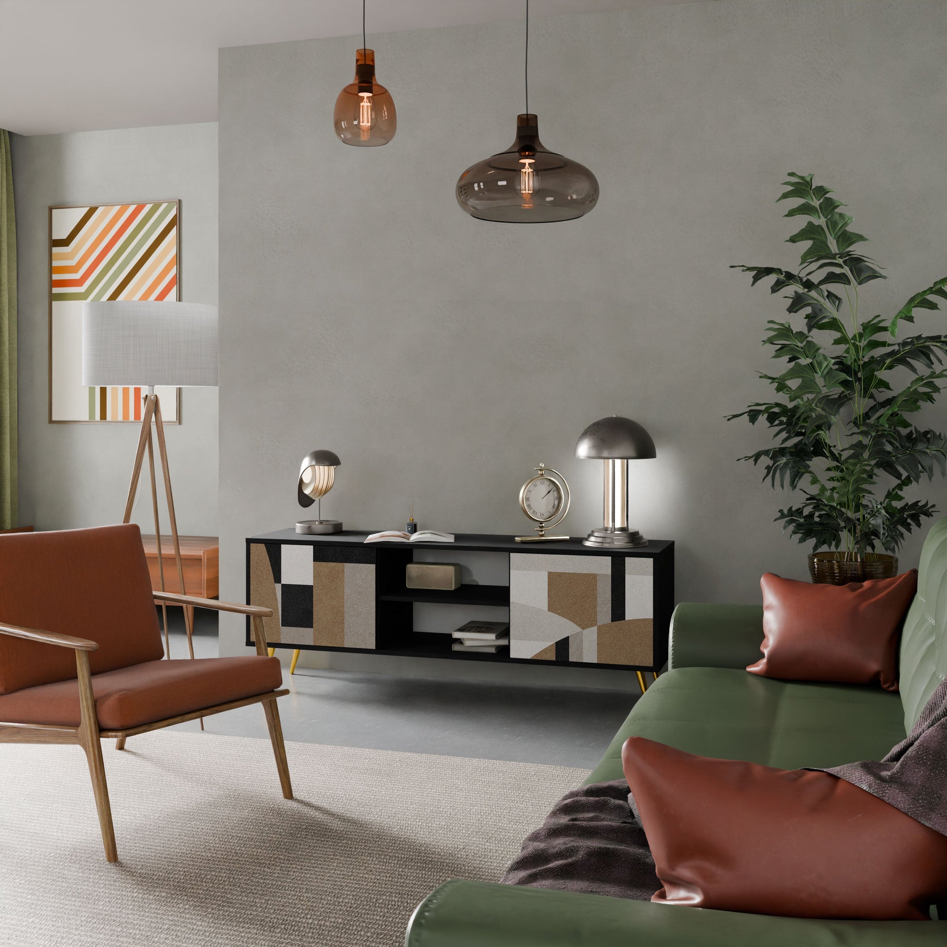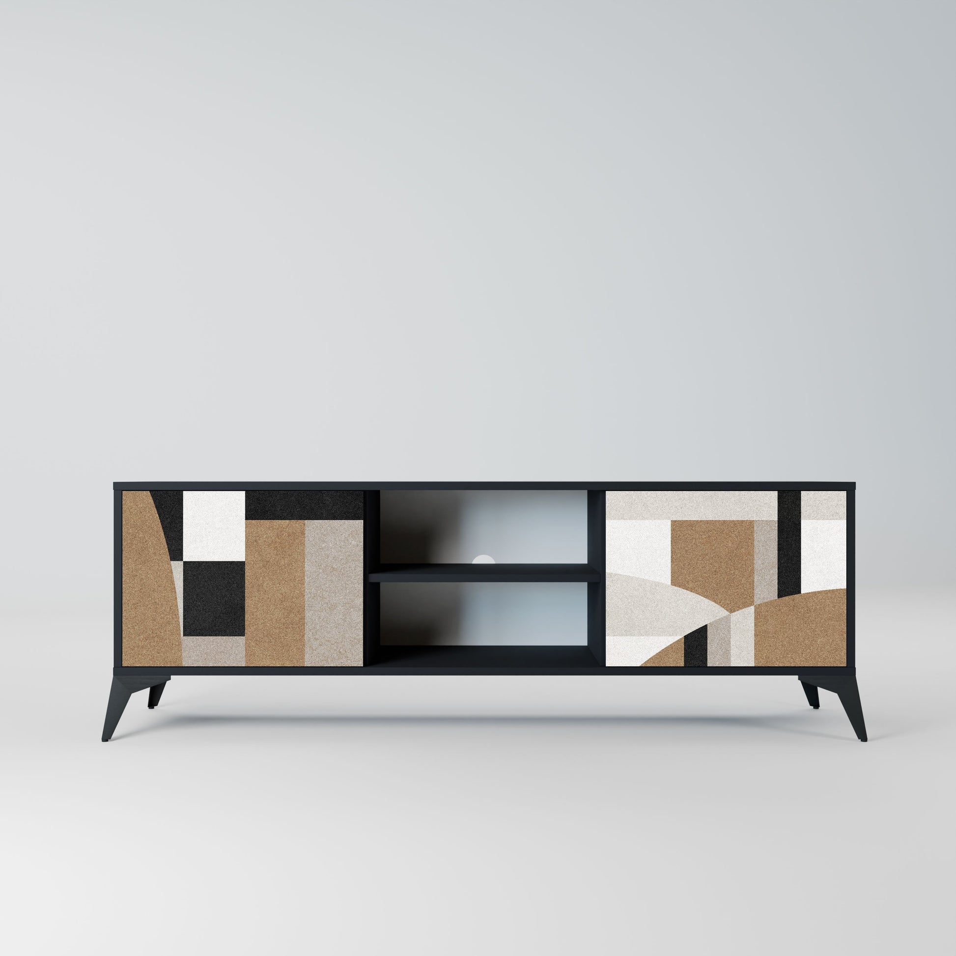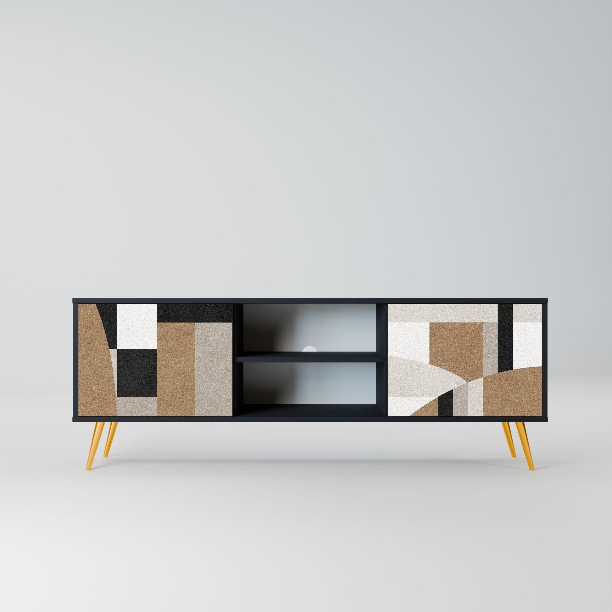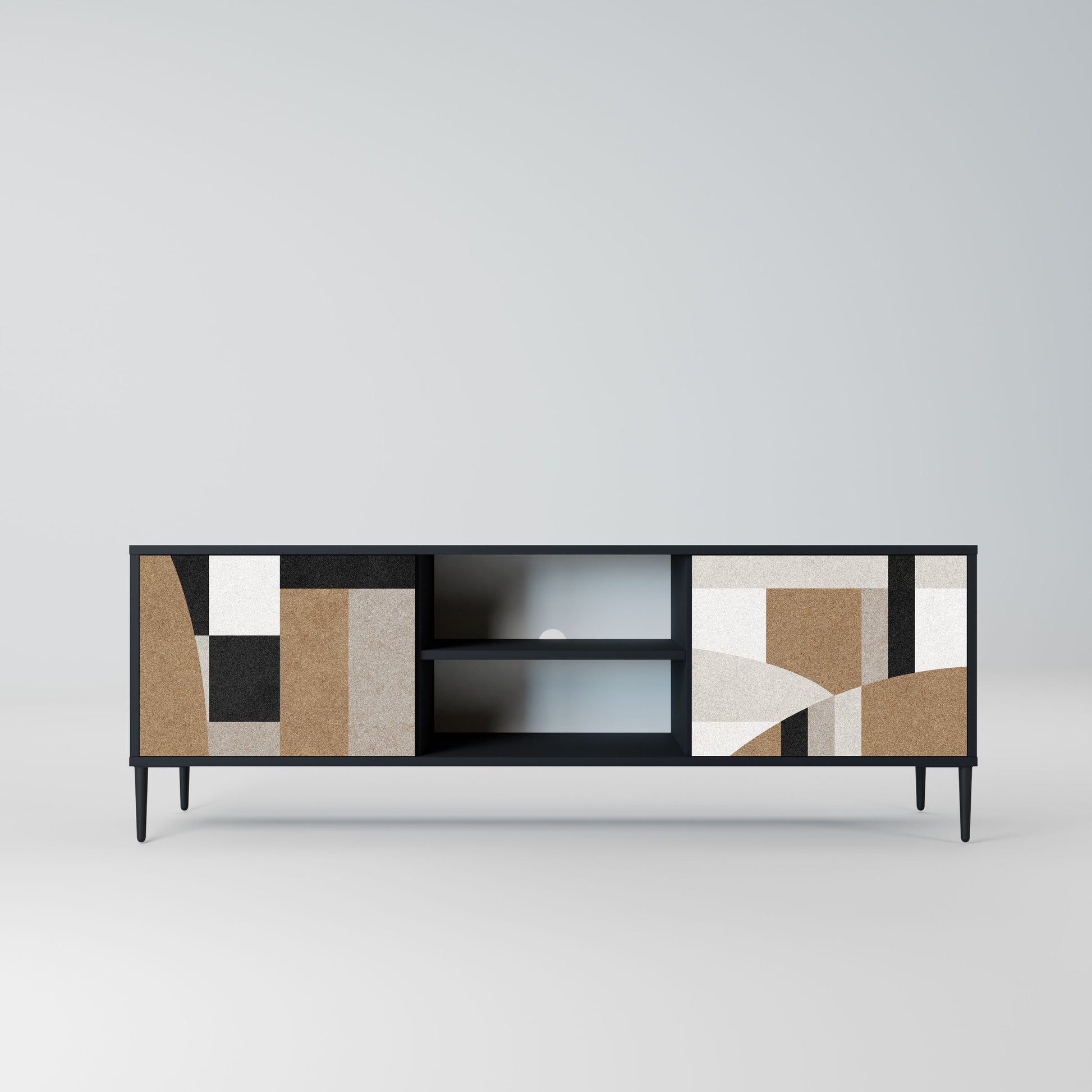 Il corpo nero conferisce al mobile TV un aspetto elegante e moderno, mentre i frontali con una stampa eccezionale attirano l'attenzione, rendendolo il punto focale di ogni stanza. L'interno spazioso offre spazio per dispositivi elettronici, cavi, telecomandi e altri accessori, aiutandoti a mantenere ordine e organizzazione.