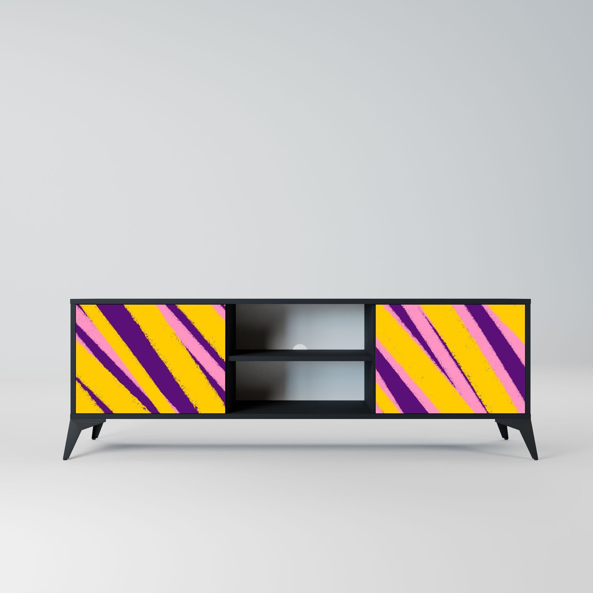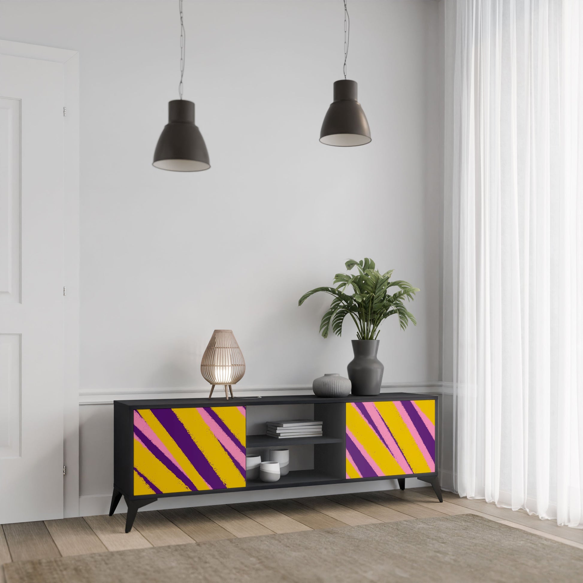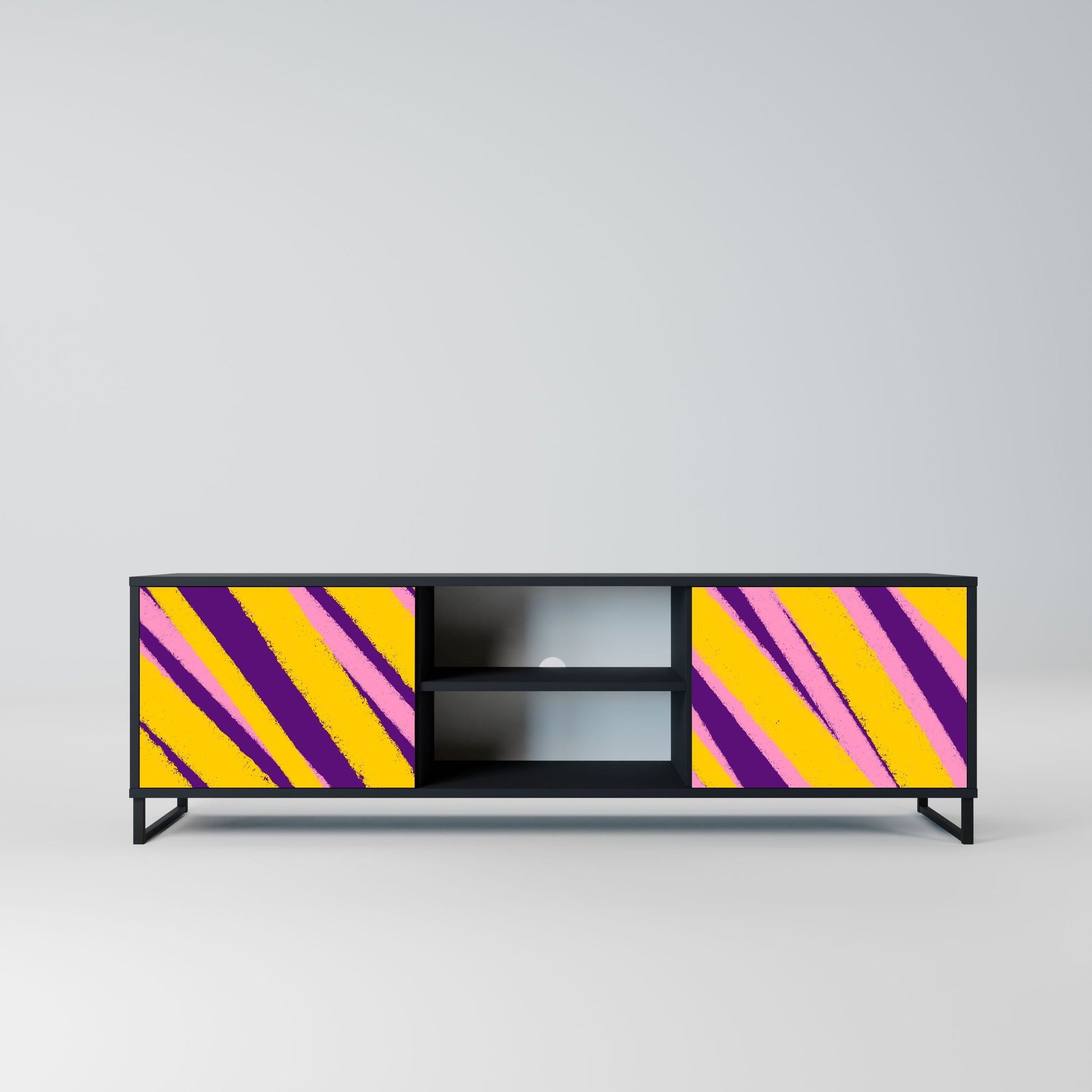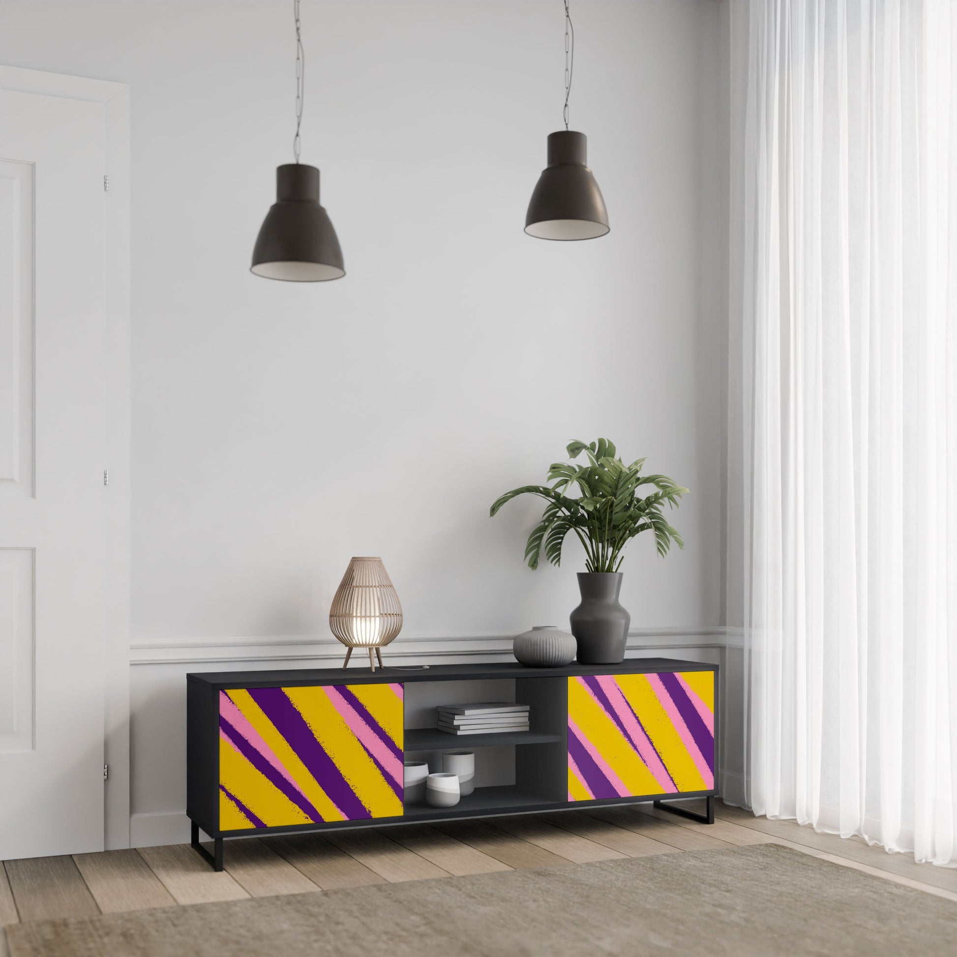 Il corpo nero conferisce al mobile TV un aspetto elegante e moderno, mentre i frontali con una stampa eccezionale attirano l'attenzione, rendendolo il punto focale di ogni stanza. L'interno spazioso offre spazio per dispositivi elettronici, cavi, telecomandi e altri accessori, aiutandoti a mantenere ordine e organizzazione.