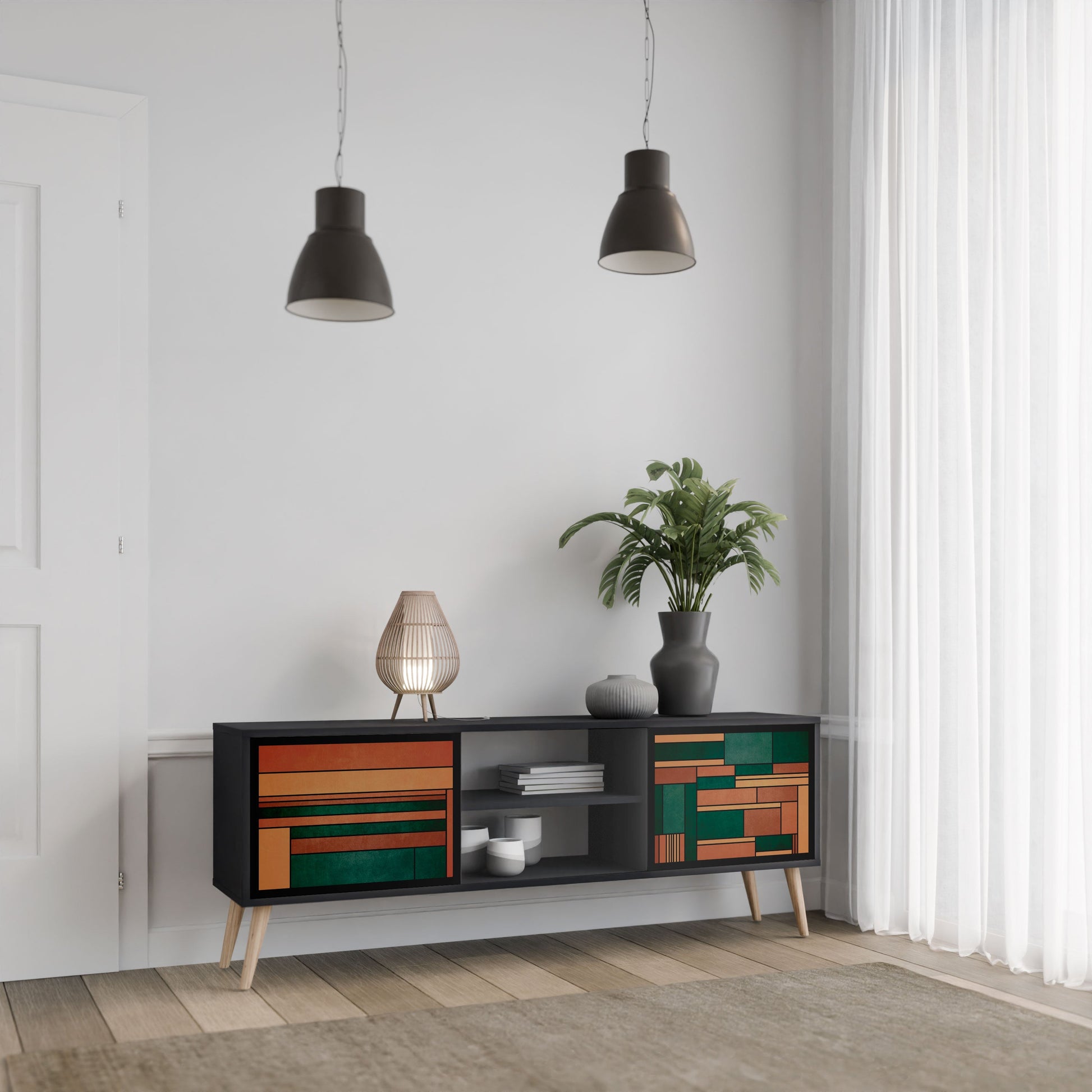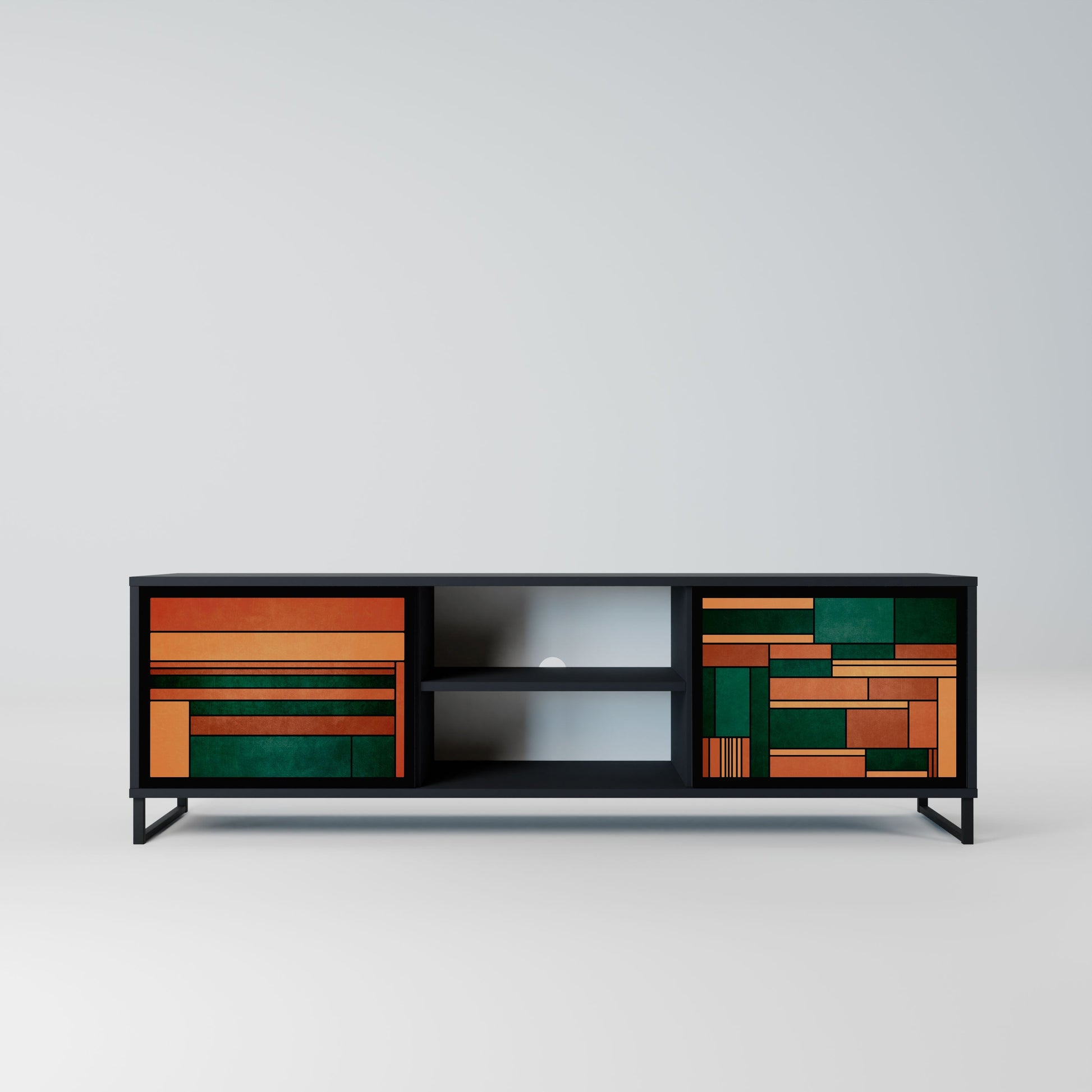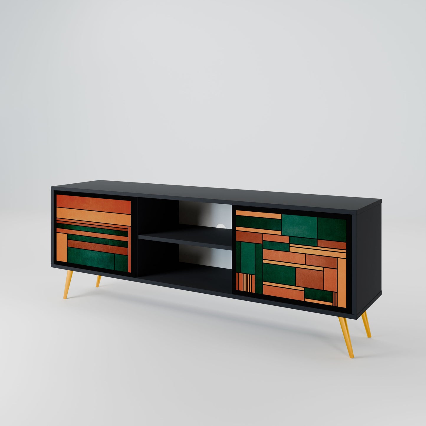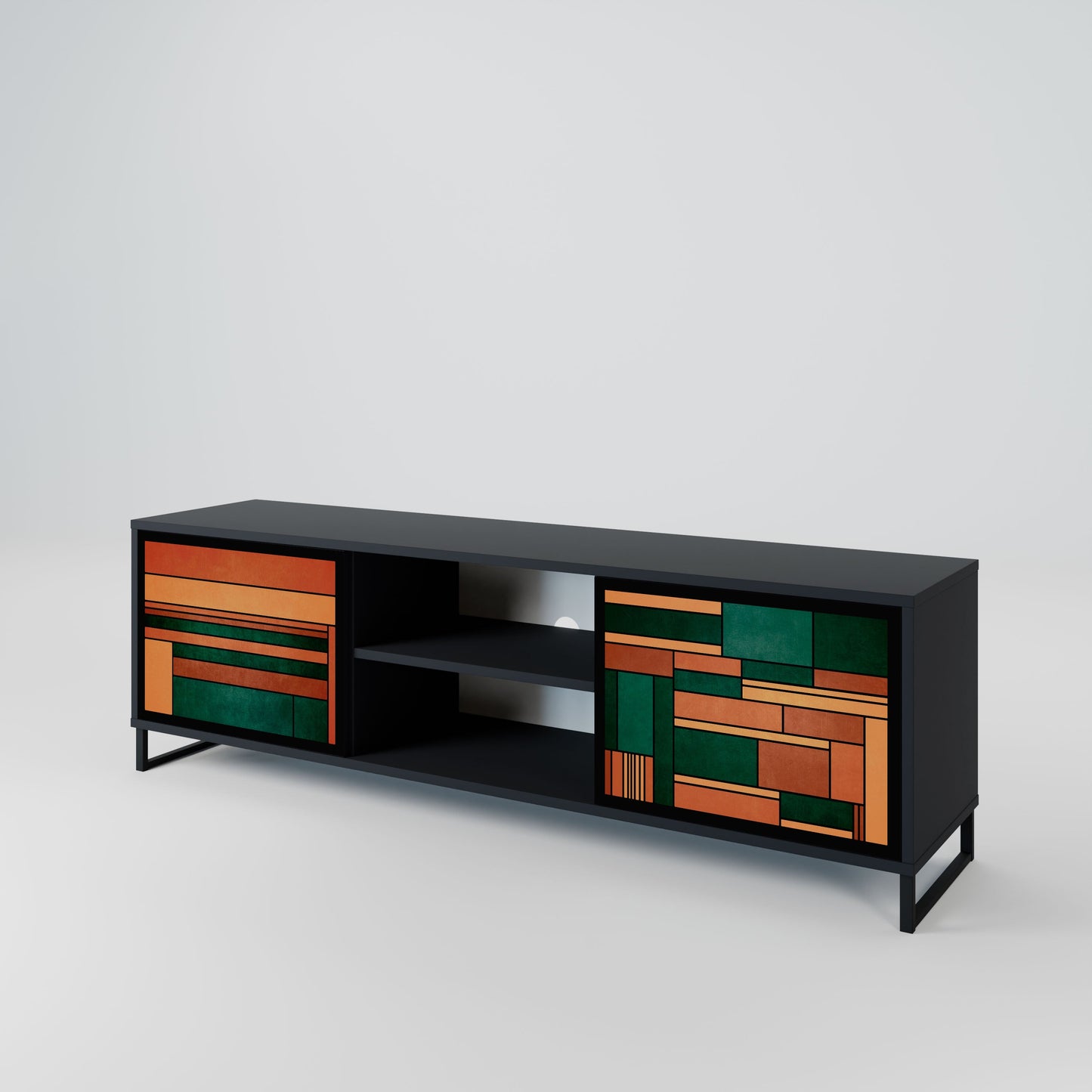 Il corpo nero conferisce al mobile TV un aspetto elegante e moderno, mentre i frontali con una stampa eccezionale attirano l'attenzione, rendendolo il punto focale di ogni stanza. L'interno spazioso offre spazio per dispositivi elettronici, cavi, telecomandi e altri accessori, aiutandoti a mantenere ordine e organizzazione.