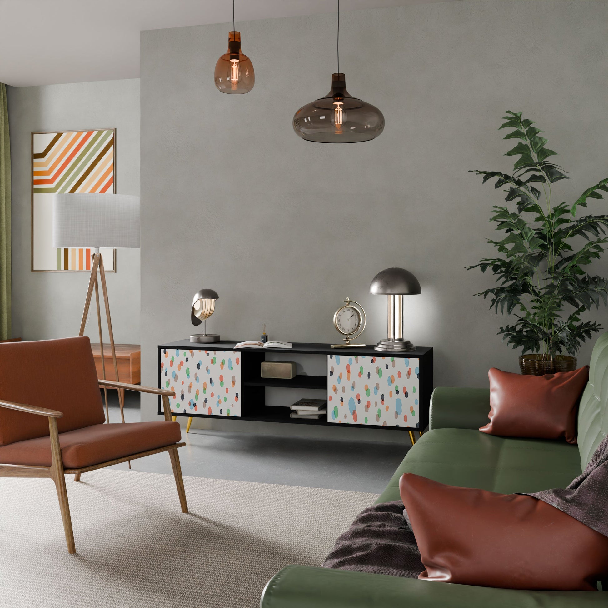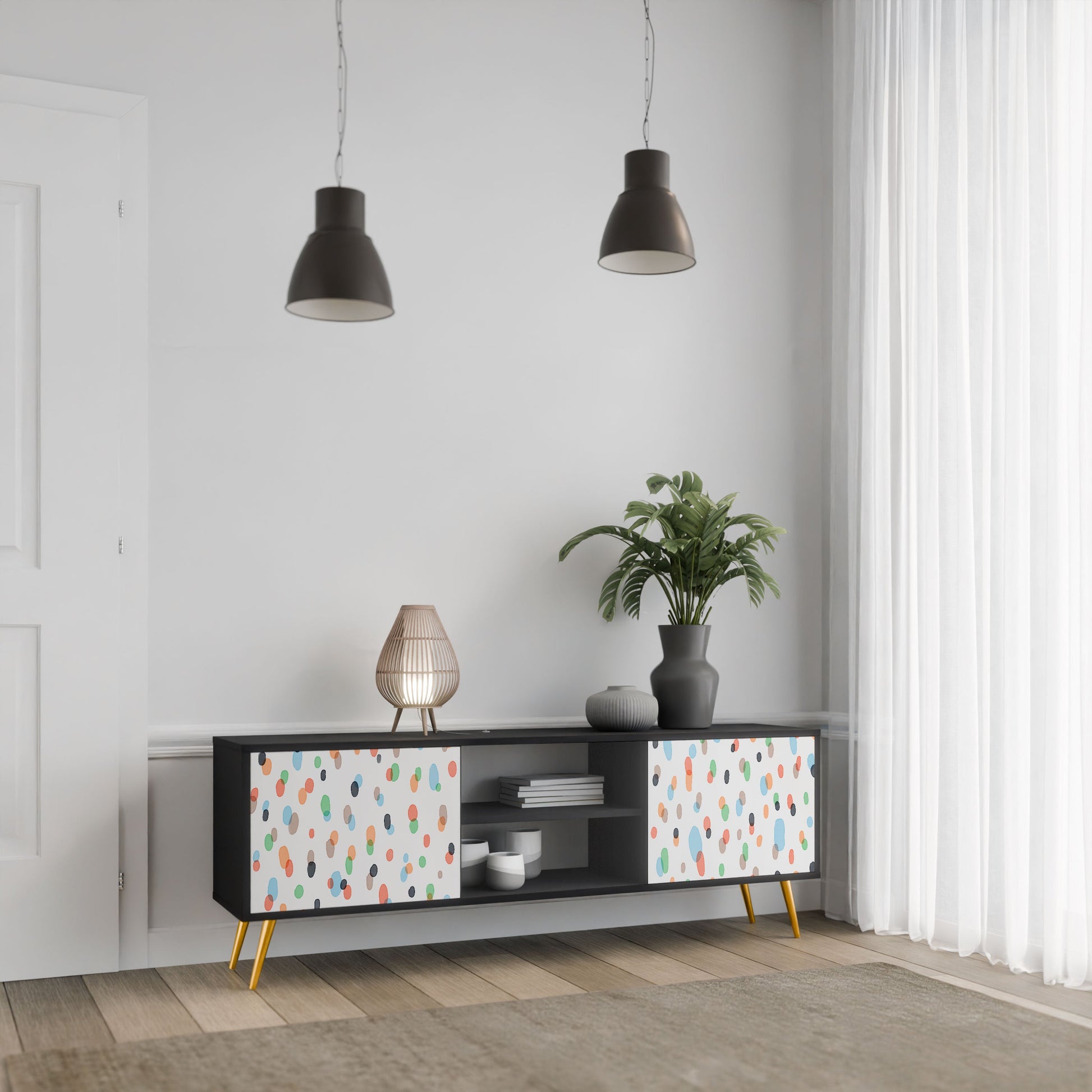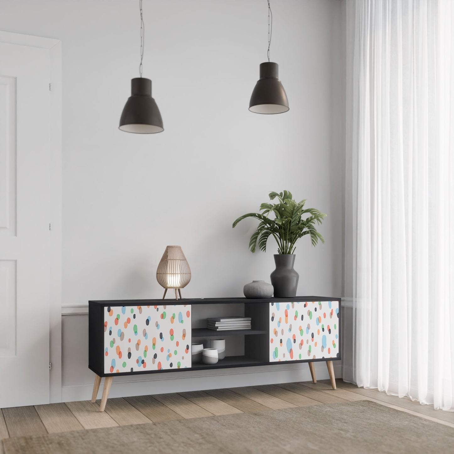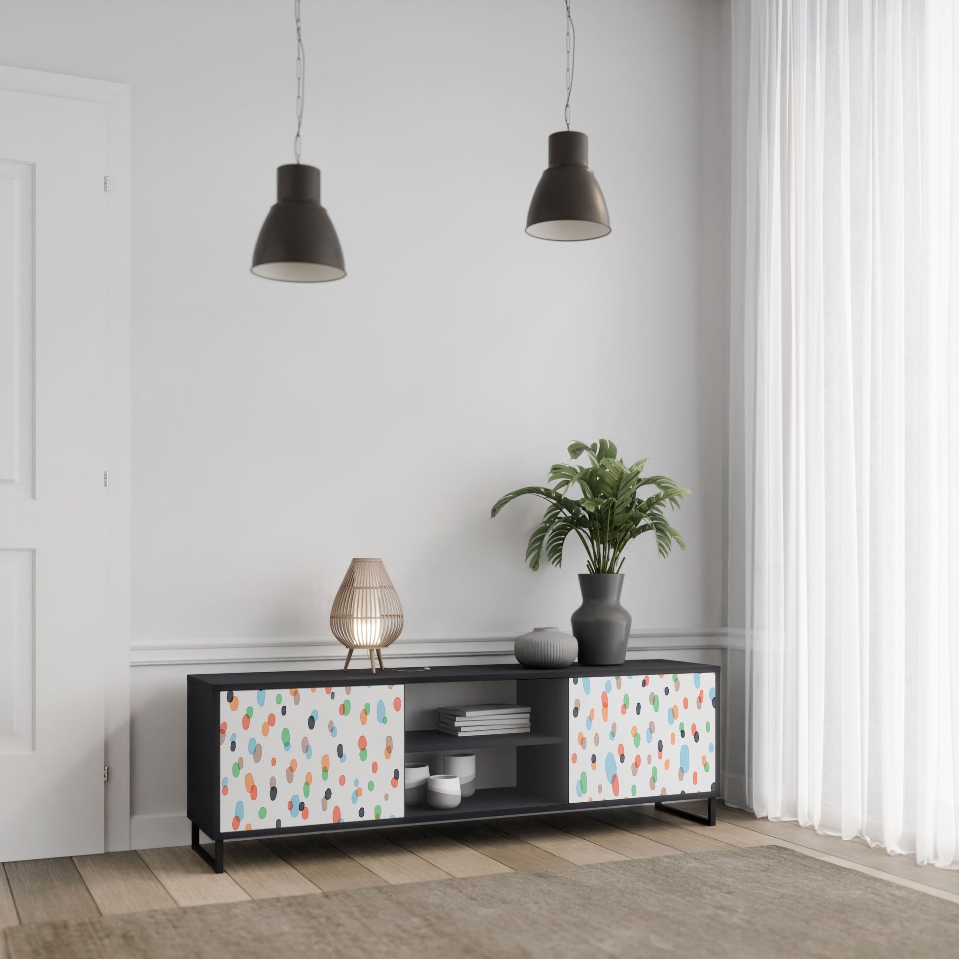 Il corpo nero conferisce al mobile TV un aspetto elegante e moderno, mentre i frontali con una stampa eccezionale attirano l'attenzione, rendendolo il punto focale di ogni stanza. L'interno spazioso offre spazio per dispositivi elettronici, cavi, telecomandi e altri accessori, aiutandoti a mantenere ordine e organizzazione.