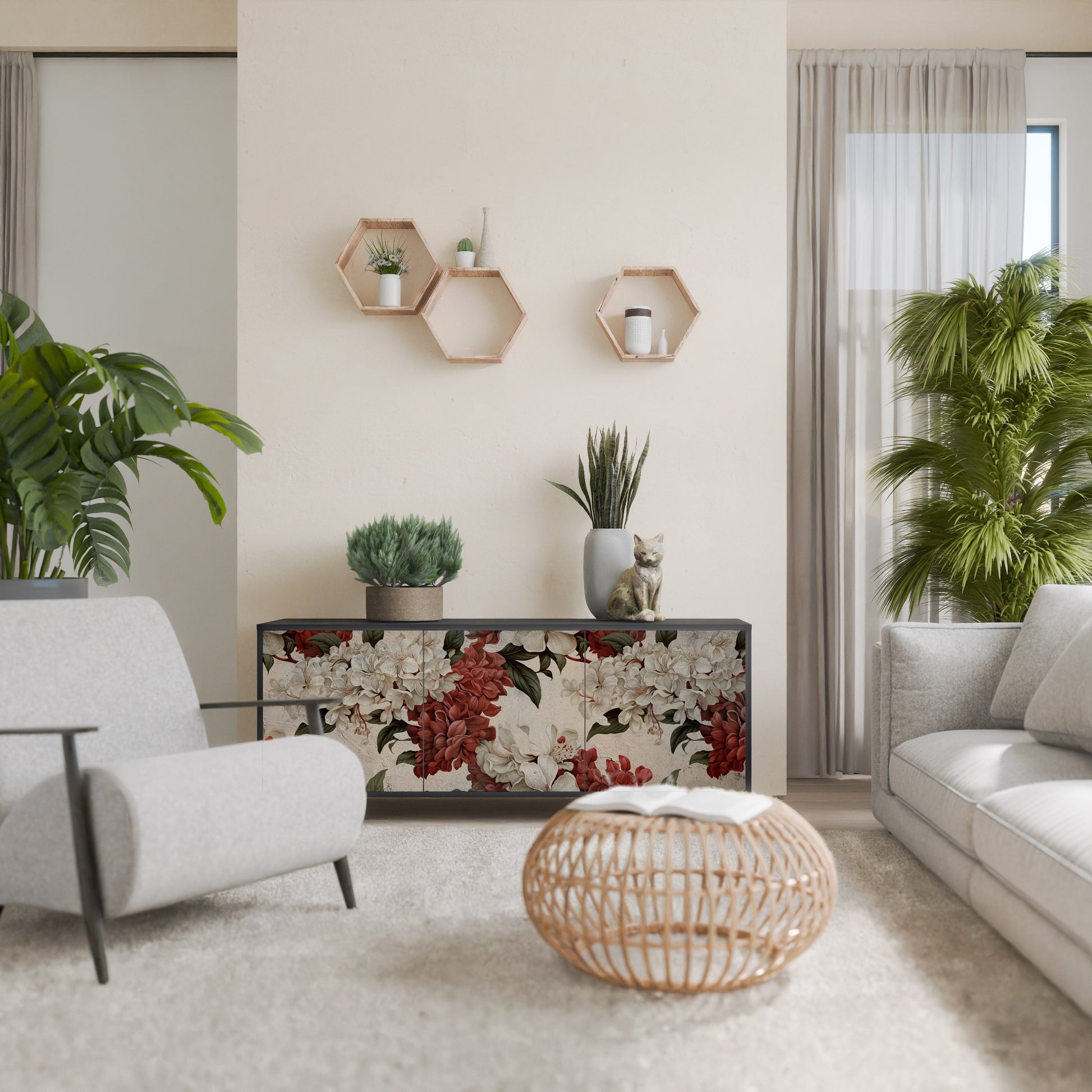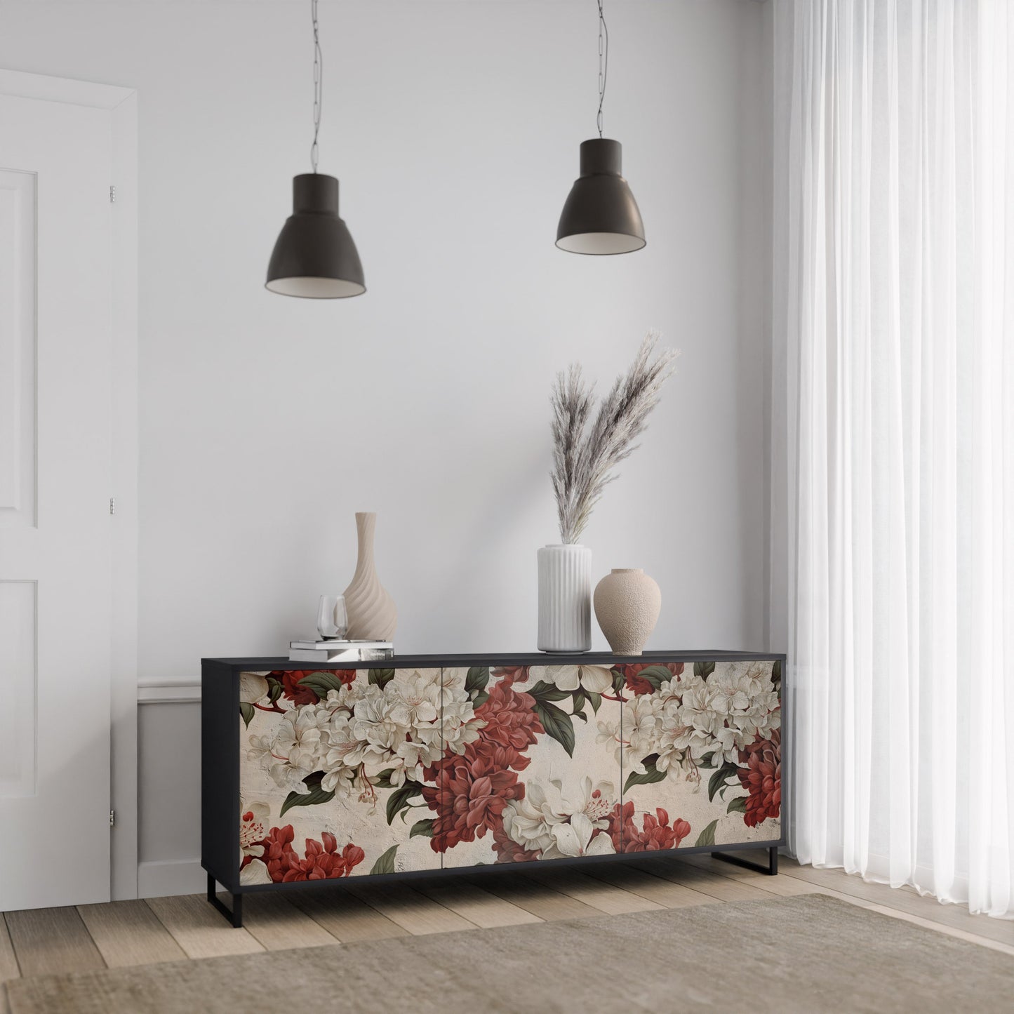 Eleganza e funzionalità in un unico mobile: la nostra credenza a 3 ante con corpo nero è la soluzione perfetta per gli amanti degli interni eleganti e moderni. Il corpo nero enfatizza il carattere audace del mobile, mentre i frontali con una stampa unica aggiungono un tocco artistico. Si adatta perfettamente al soggiorno, alla camera da letto o all'ufficio, completando sia gli arrangiamenti moderni che quelli industriali.