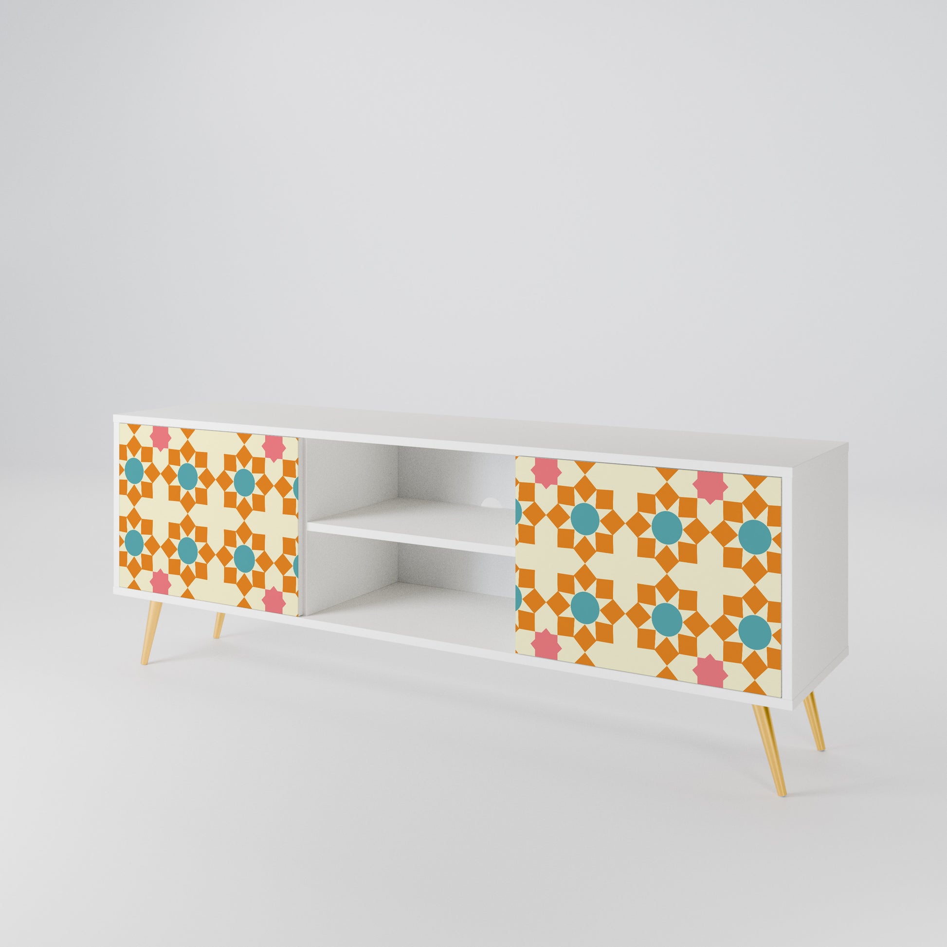 Il corpo bianco conferisce al mobile TV un aspetto luminoso e raffinato, mentre i frontali con una stampa eccezionale catturano l'attenzione, diventando il punto focale di qualsiasi stanza. Lo spazioso interno offre spazio per dispositivi elettronici, cavi, telecomandi e altri accessori, aiutandoti a mantenere ordine e organizzazione.