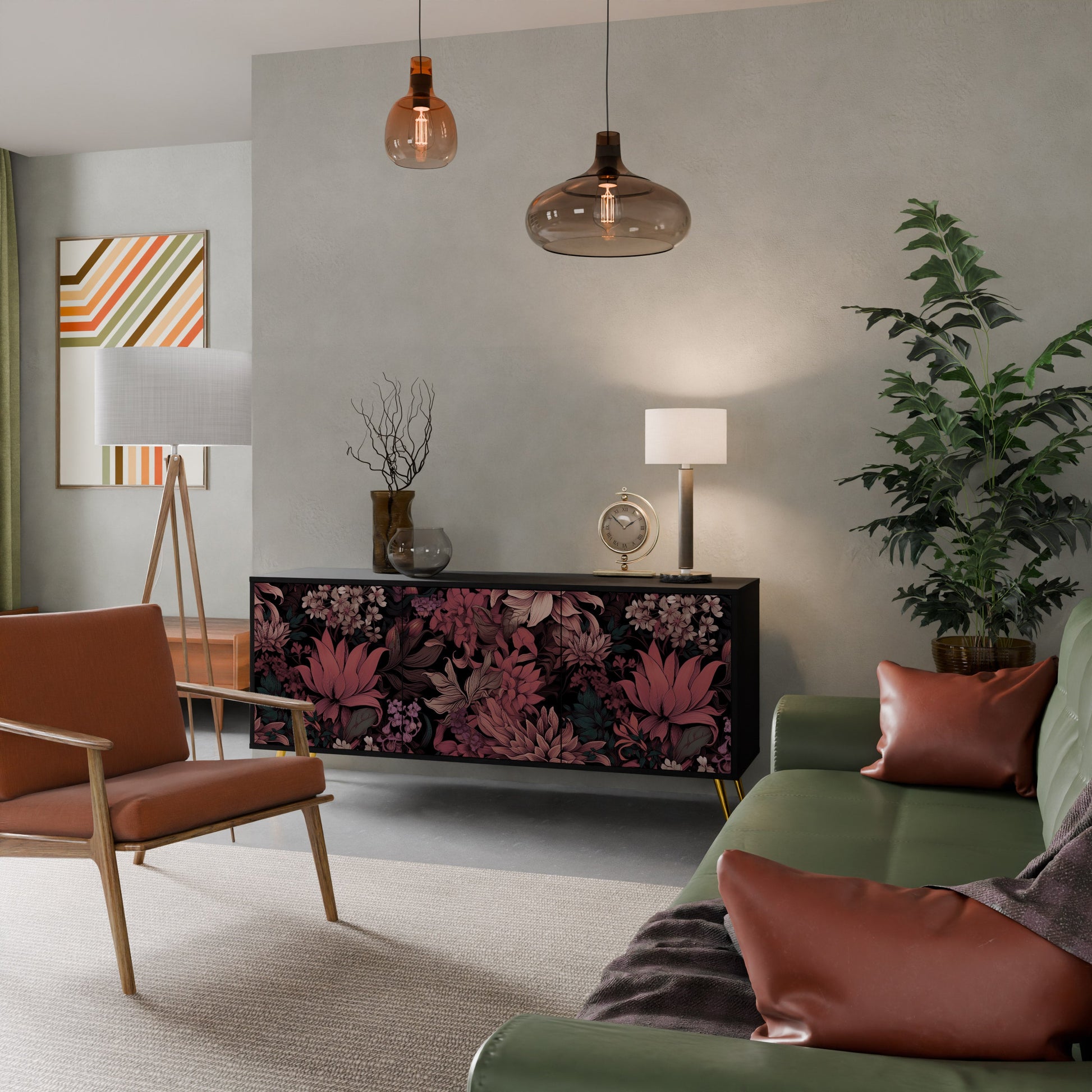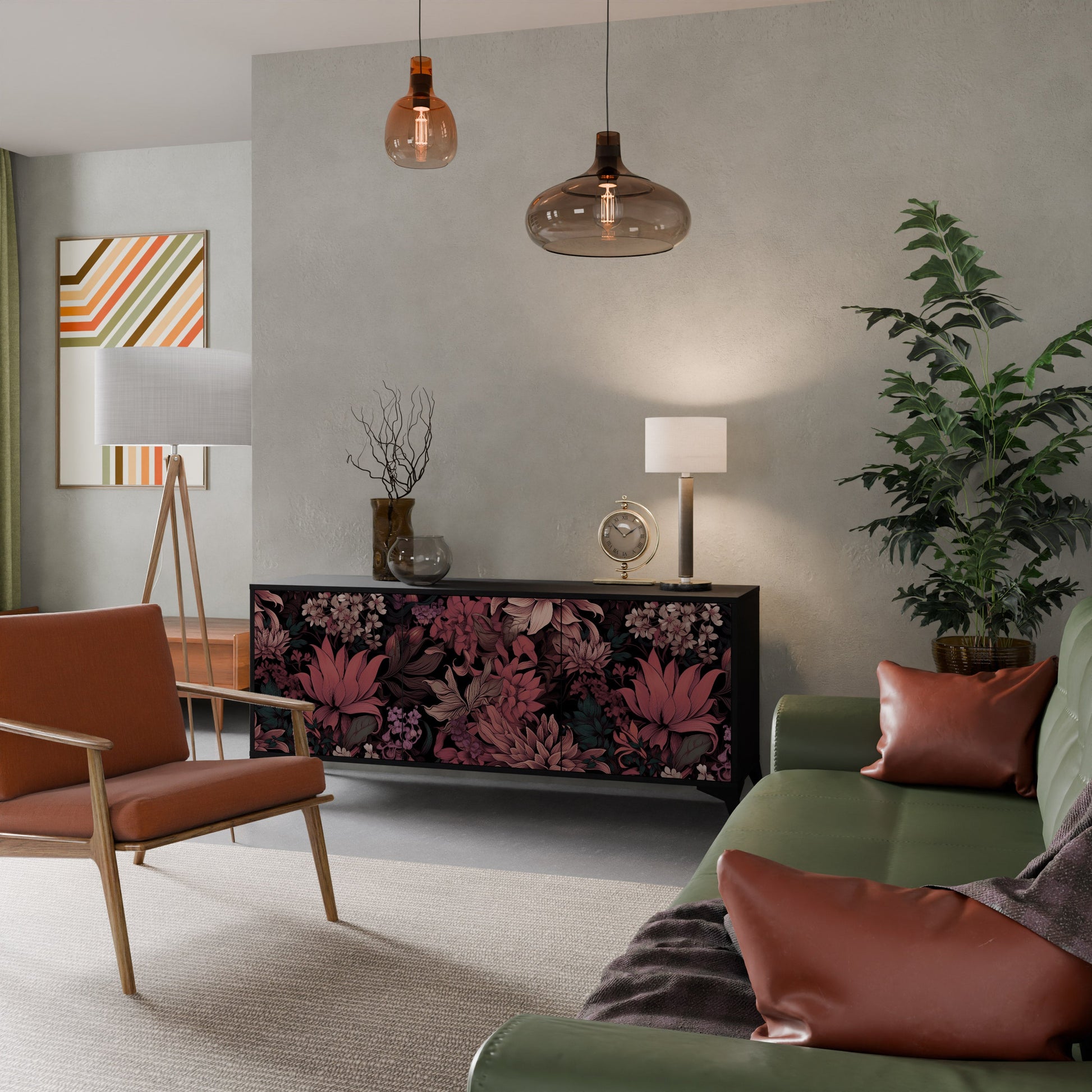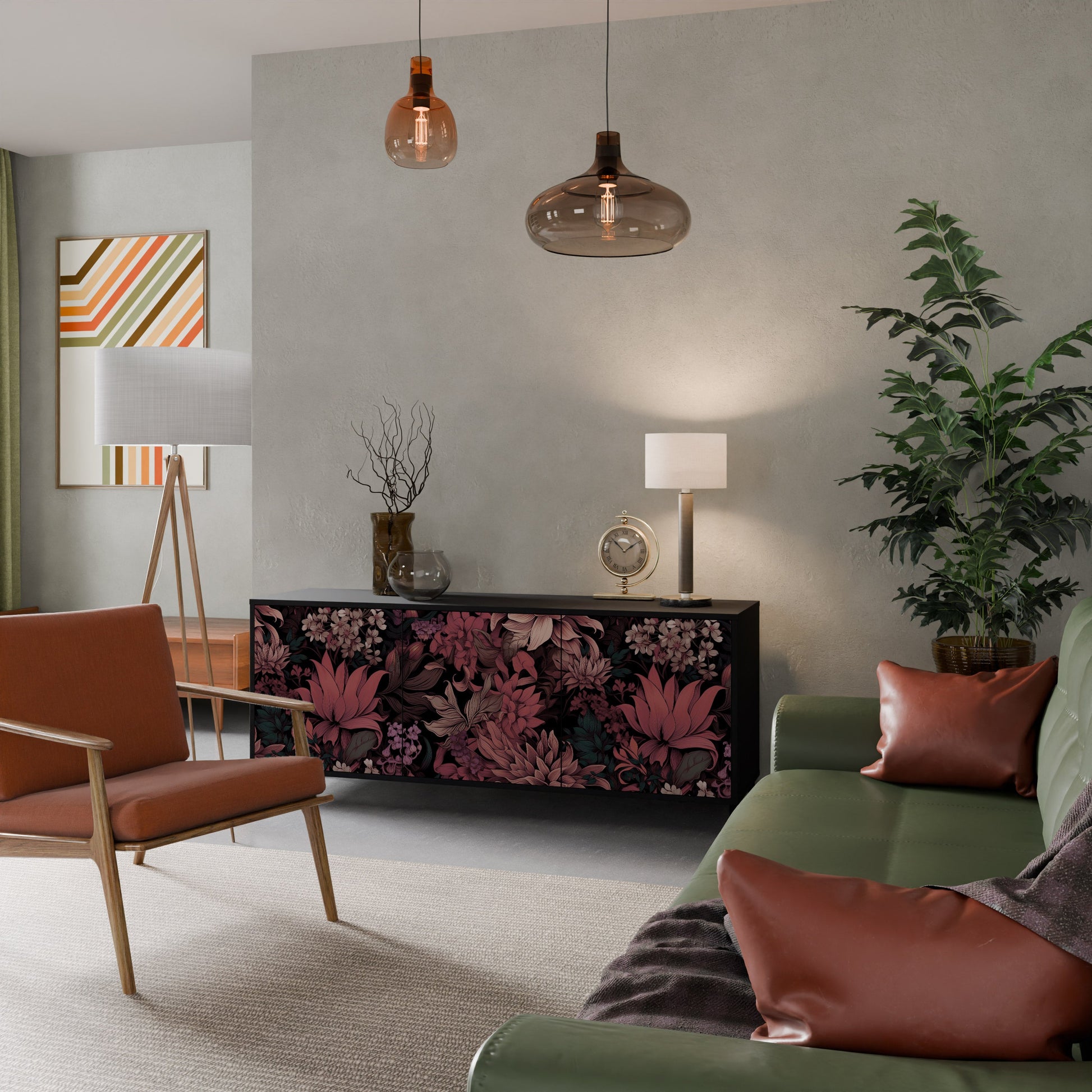 Eleganza e funzionalità in un unico mobile: la nostra credenza a 3 ante con corpo nero è la soluzione perfetta per gli amanti degli interni eleganti e moderni. Il corpo nero enfatizza il carattere audace del mobile, mentre i frontali con una stampa unica aggiungono un tocco artistico. Si adatta perfettamente al soggiorno, alla camera da letto o all'ufficio, completando sia gli arrangiamenti moderni che quelli industriali.
