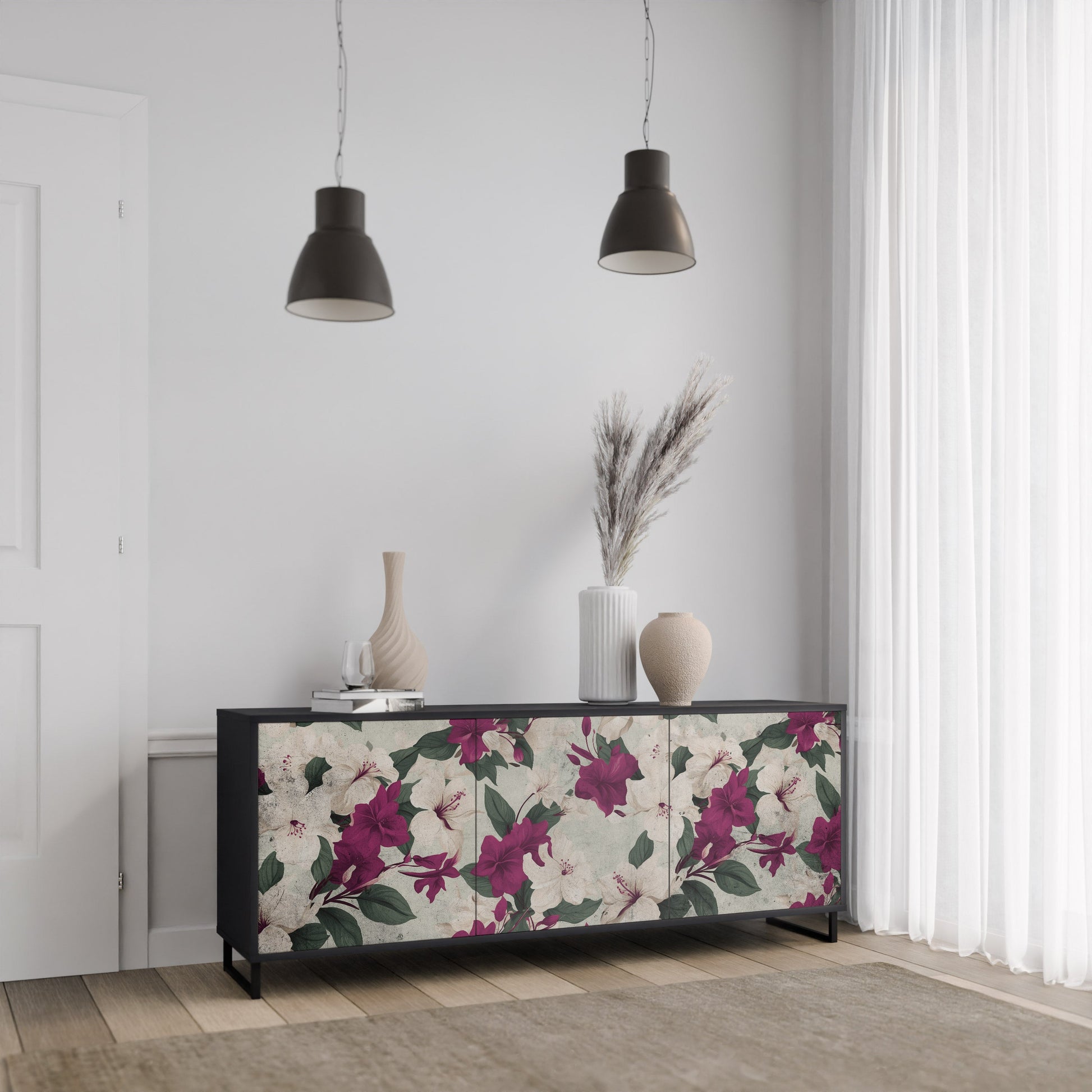 Eleganza e funzionalità in un unico mobile: la nostra credenza a 3 ante con corpo nero è la soluzione perfetta per gli amanti degli interni eleganti e moderni. Il corpo nero enfatizza il carattere audace del mobile, mentre i frontali con una stampa unica aggiungono un tocco artistico. Si adatta perfettamente al soggiorno, alla camera da letto o all'ufficio, completando sia gli arrangiamenti moderni che quelli industriali.