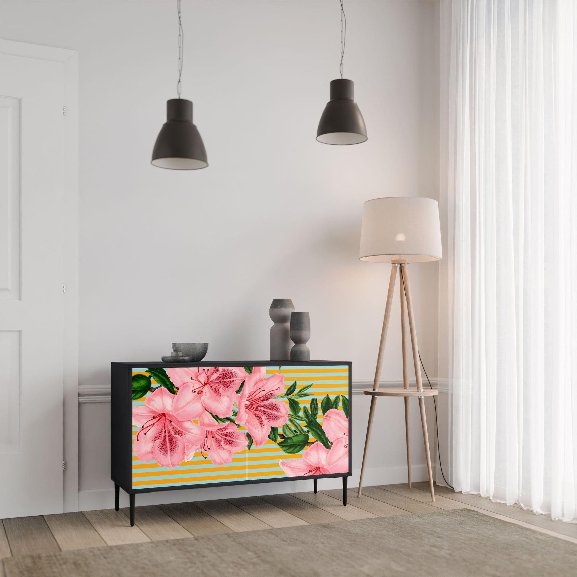 Eleganza e funzionalità in un unico mobile: la nostra credenza a 2 ante con corpo nero è la soluzione perfetta per gli amanti degli interni eleganti e moderni. Il corpo nero enfatizza il carattere audace del mobile, mentre i frontali con una stampa unica aggiungono un tocco artistico. Si adatta perfettamente al soggiorno, alla camera da letto o all'ufficio, completando sia gli arrangiamenti moderni che quelli industriali.