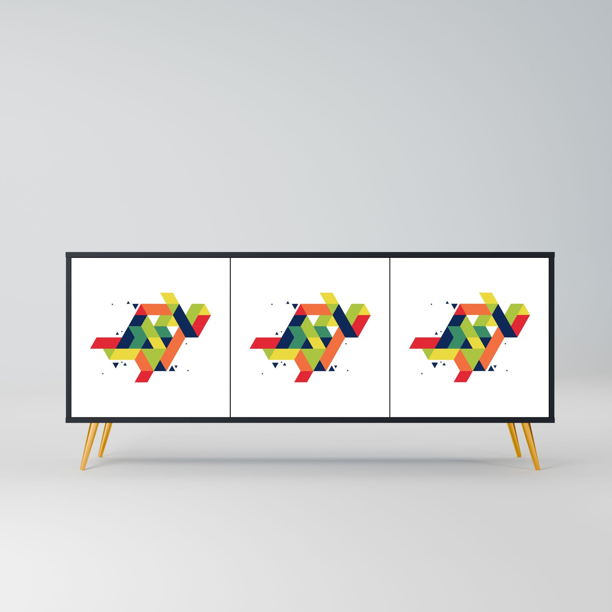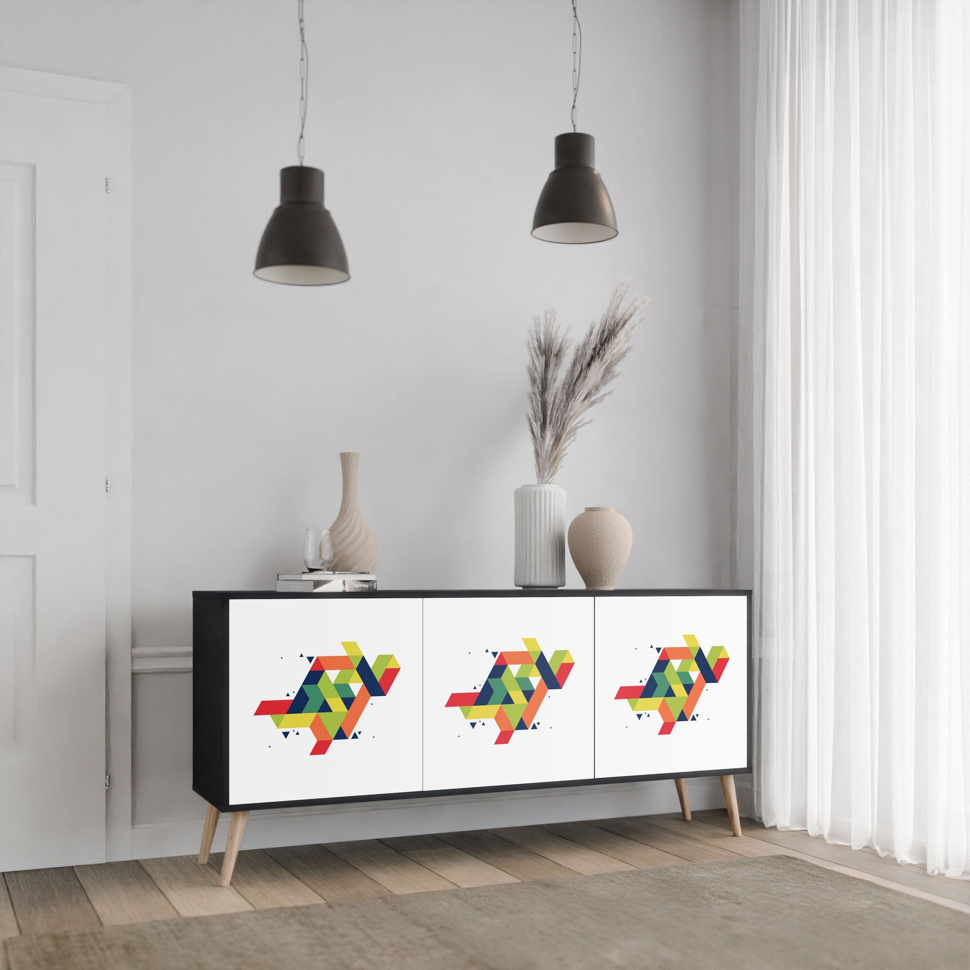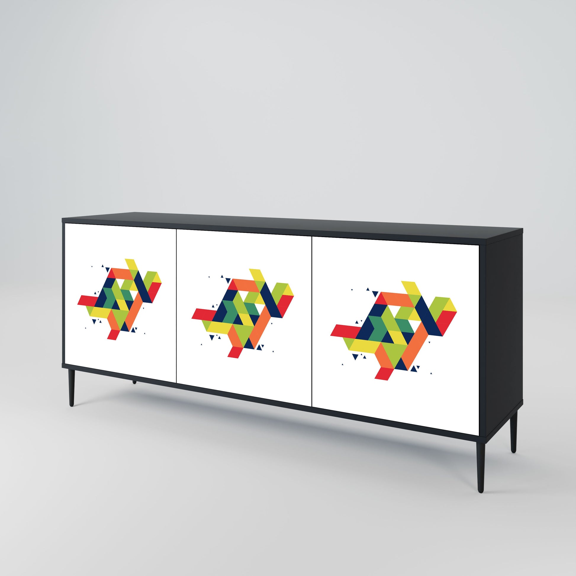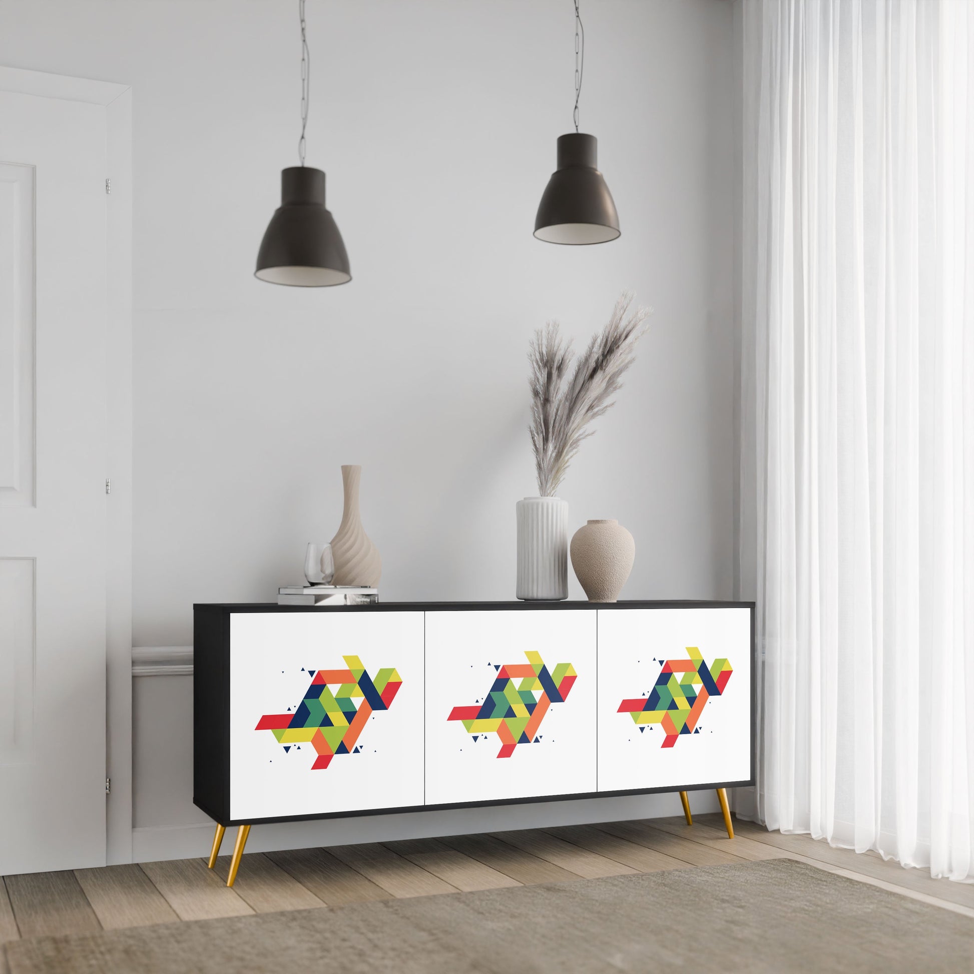 Eleganza e funzionalità in un unico mobile: la nostra credenza a 3 ante con corpo nero è la soluzione perfetta per gli amanti degli interni eleganti e moderni. Il corpo nero enfatizza il carattere audace del mobile, mentre i frontali con una stampa unica aggiungono un tocco artistico. Si adatta perfettamente al soggiorno, alla camera da letto o all'ufficio, completando sia gli arrangiamenti moderni che quelli industriali.