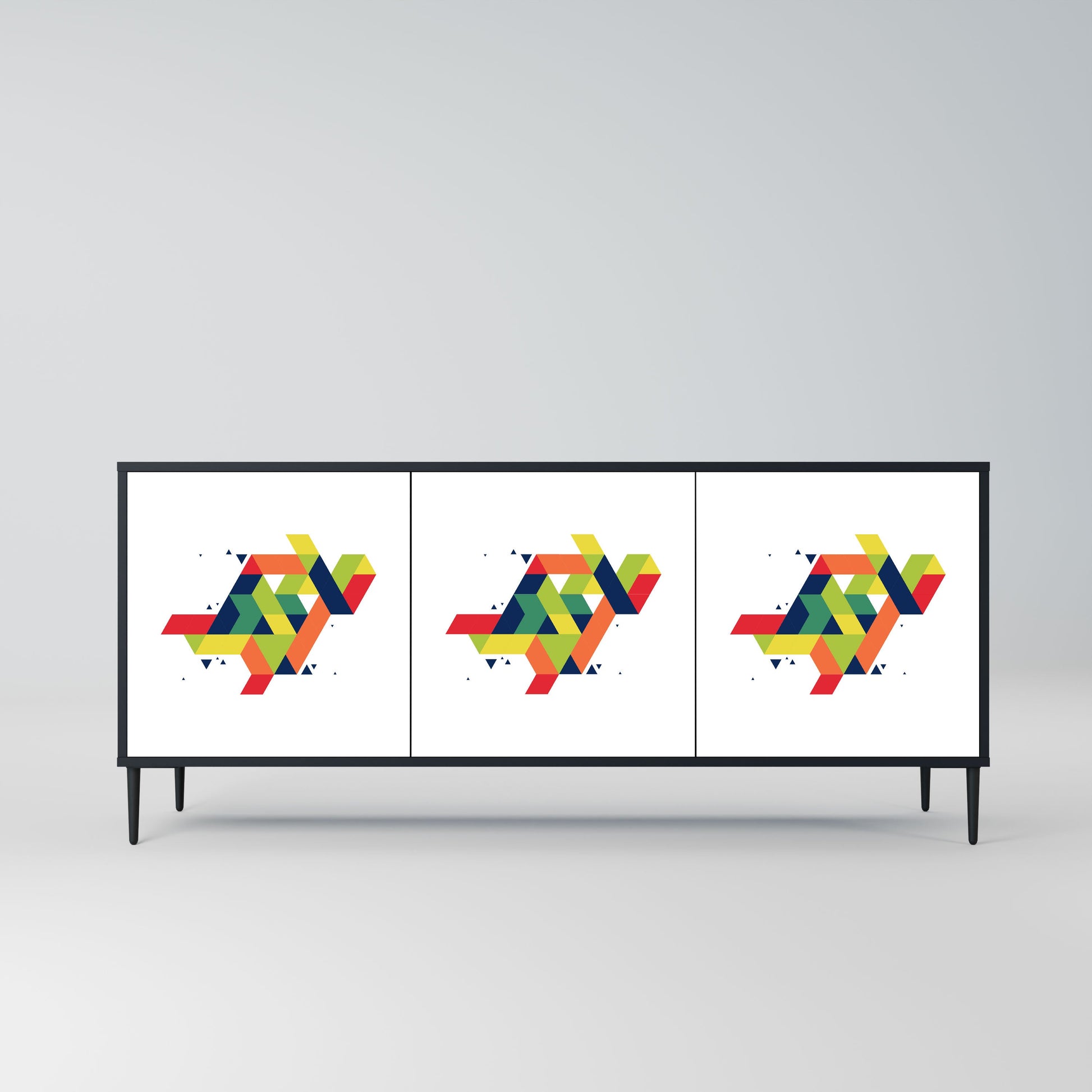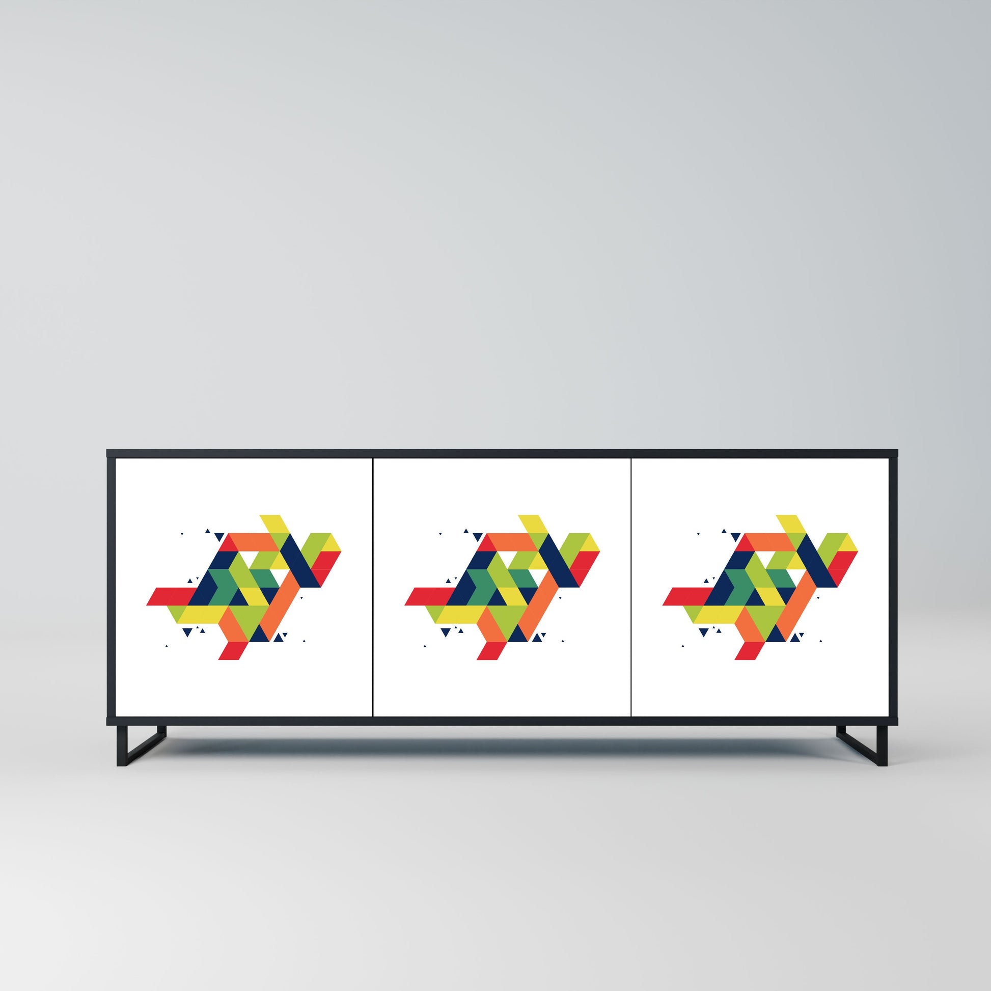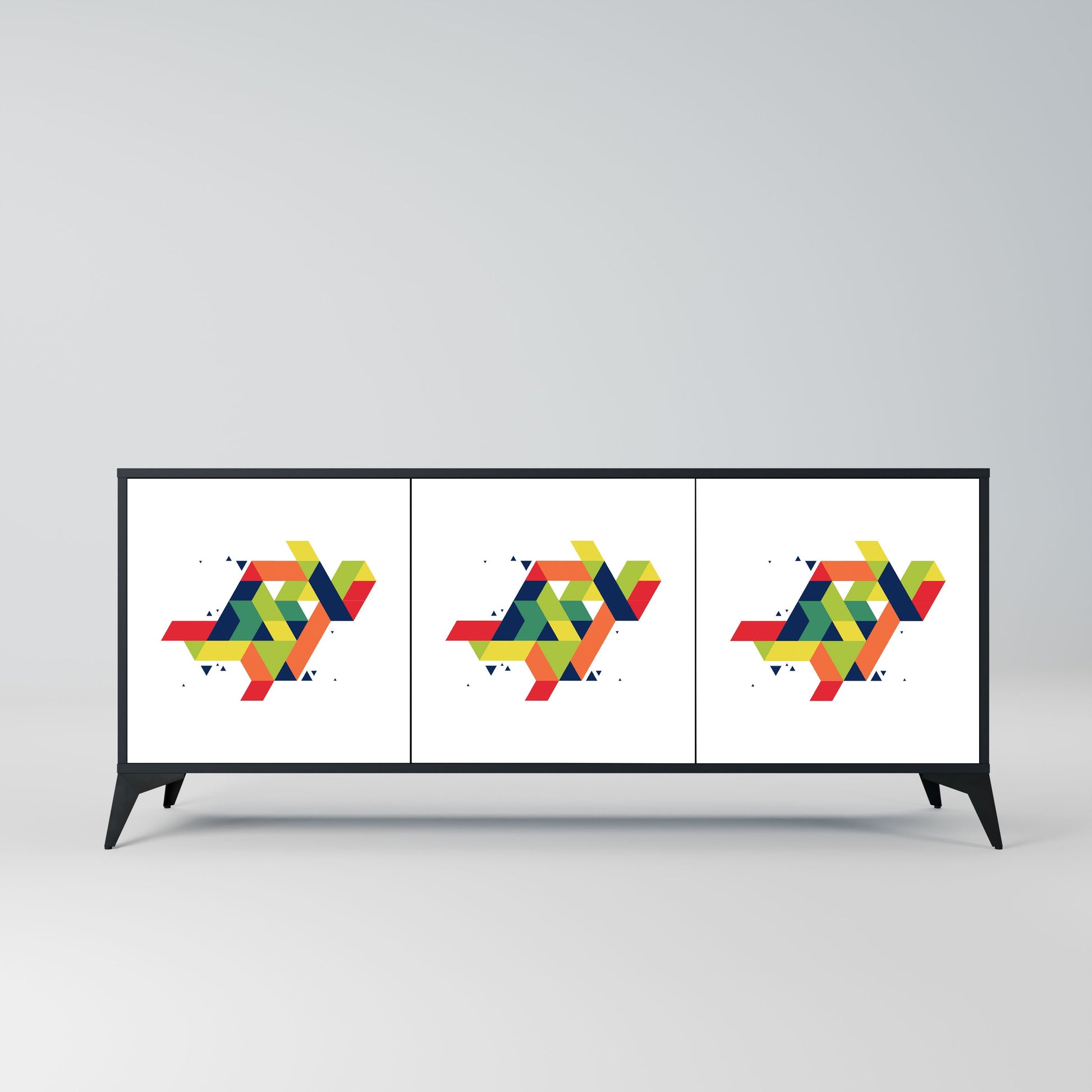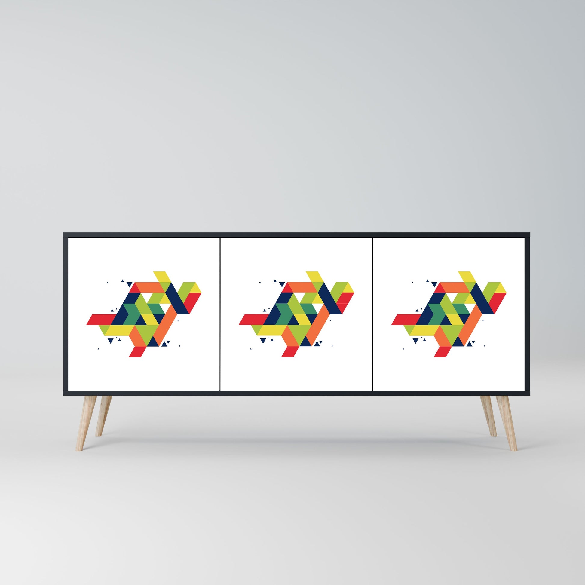 Eleganza e funzionalità in un unico mobile: la nostra credenza a 3 ante con corpo nero è la soluzione perfetta per gli amanti degli interni eleganti e moderni. Il corpo nero enfatizza il carattere audace del mobile, mentre i frontali con una stampa unica aggiungono un tocco artistico. Si adatta perfettamente al soggiorno, alla camera da letto o all'ufficio, completando sia gli arrangiamenti moderni che quelli industriali.