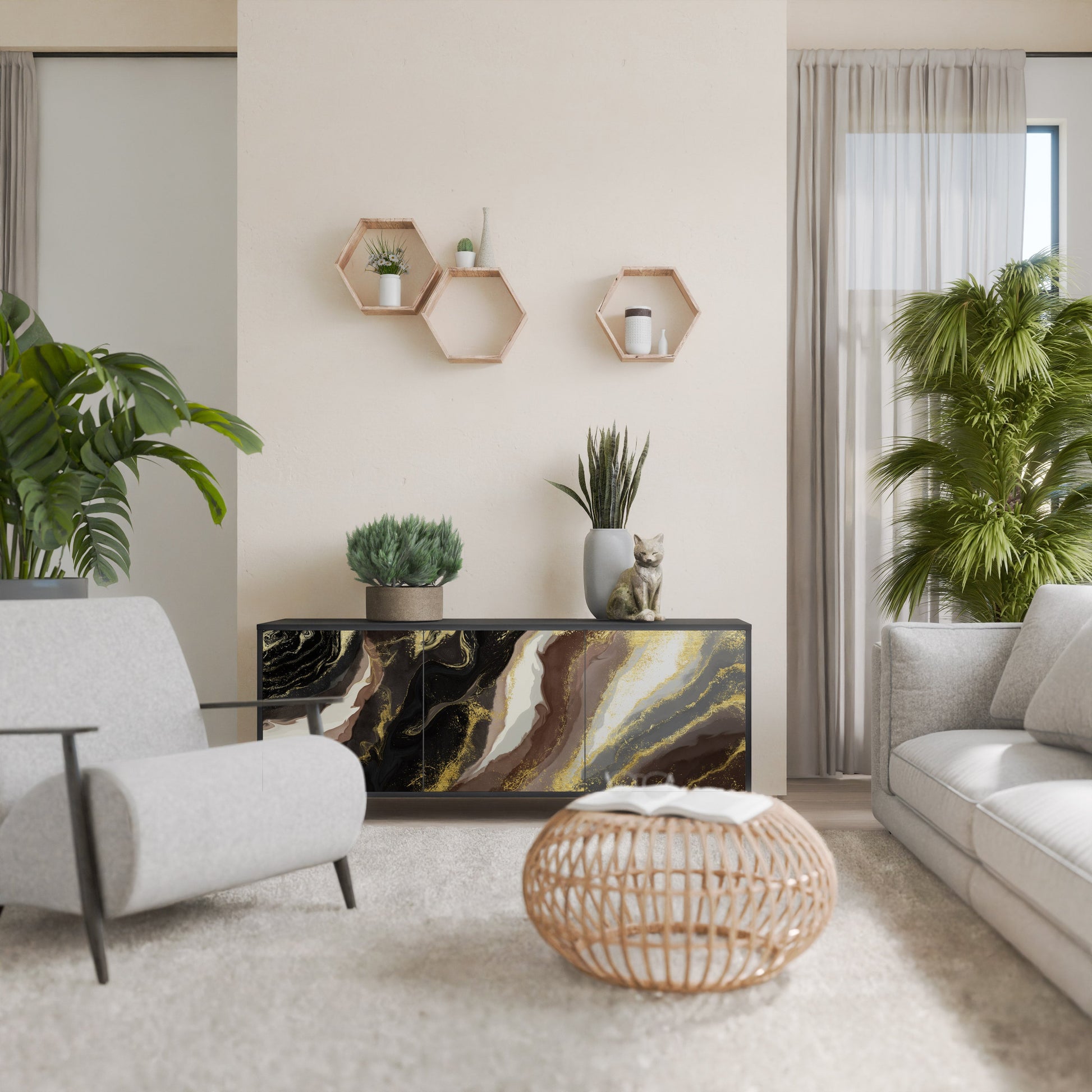 Eleganza e funzionalità in un unico mobile: la nostra credenza a 3 ante con corpo nero è la soluzione perfetta per gli amanti degli interni eleganti e moderni. Il corpo nero enfatizza il carattere audace del mobile, mentre i frontali con una stampa unica aggiungono un tocco artistico. Si adatta perfettamente al soggiorno, alla camera da letto o all'ufficio, completando sia gli arrangiamenti moderni che quelli industriali.