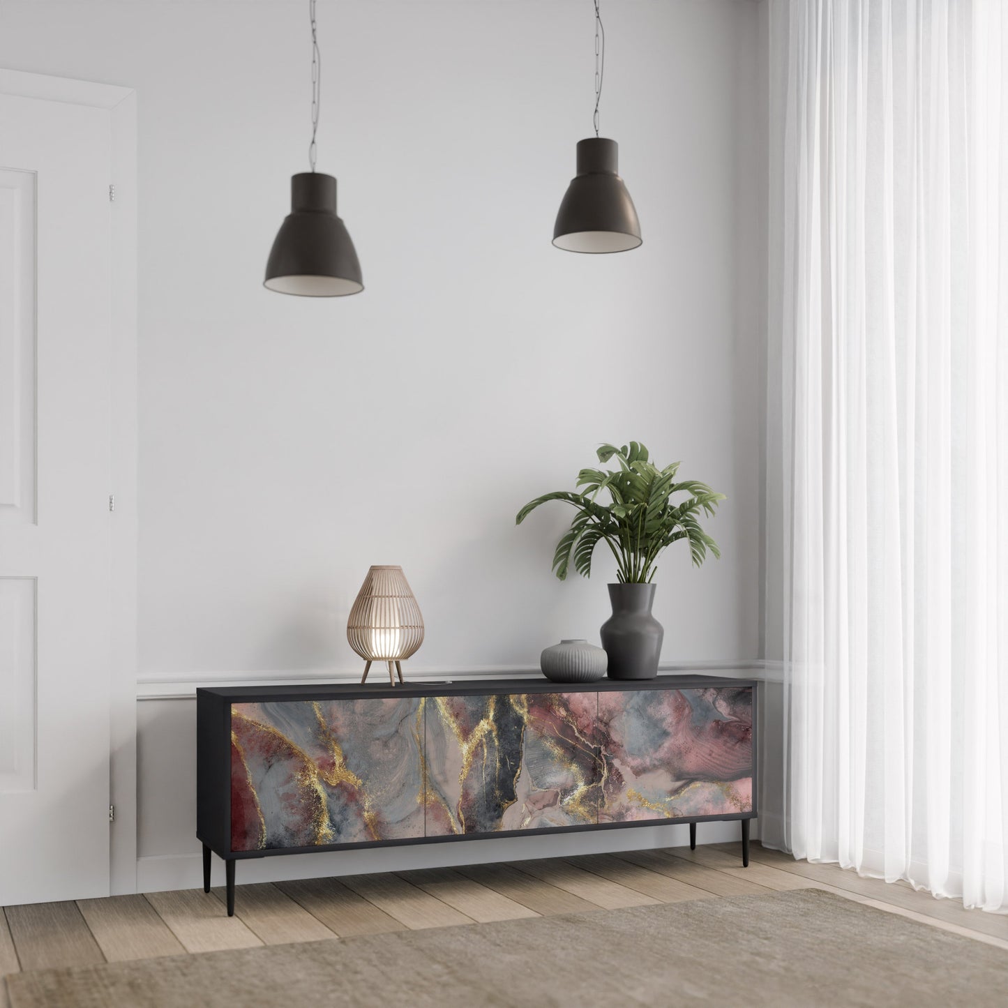Il corpo nero del supporto crea un accento audace e moderno che si abbina magnificamente ad allestimenti industriali e minimalisti. I frontali con una stampa di design aggiungono carattere e unicità, rendendo questo pezzo non solo pratico ma anche un elemento decorativo di spicco.