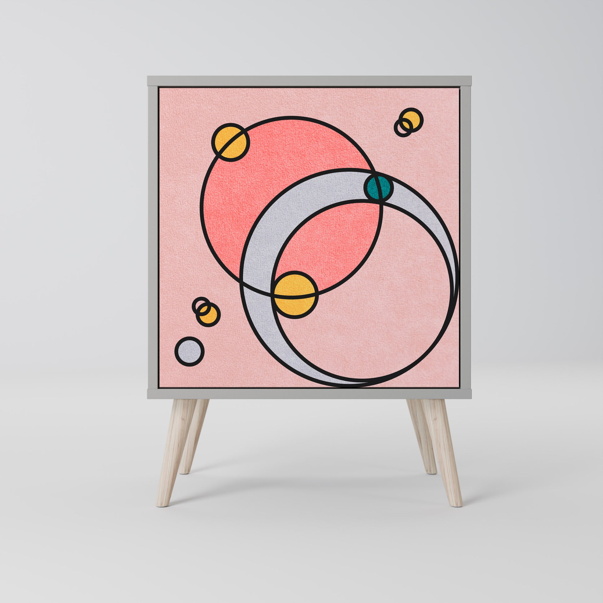 Questo mobile compatto ma straordinariamente elegante colpisce per il suo design minimalista, che si adatta perfettamente sia agli interni moderni che a quelli classici. Il tenue colore grigio della struttura conferisce al mobile un carattere discreto ma distintivo, mentre i frontali con una stampa esclusiva aggiungono un tocco artistico.