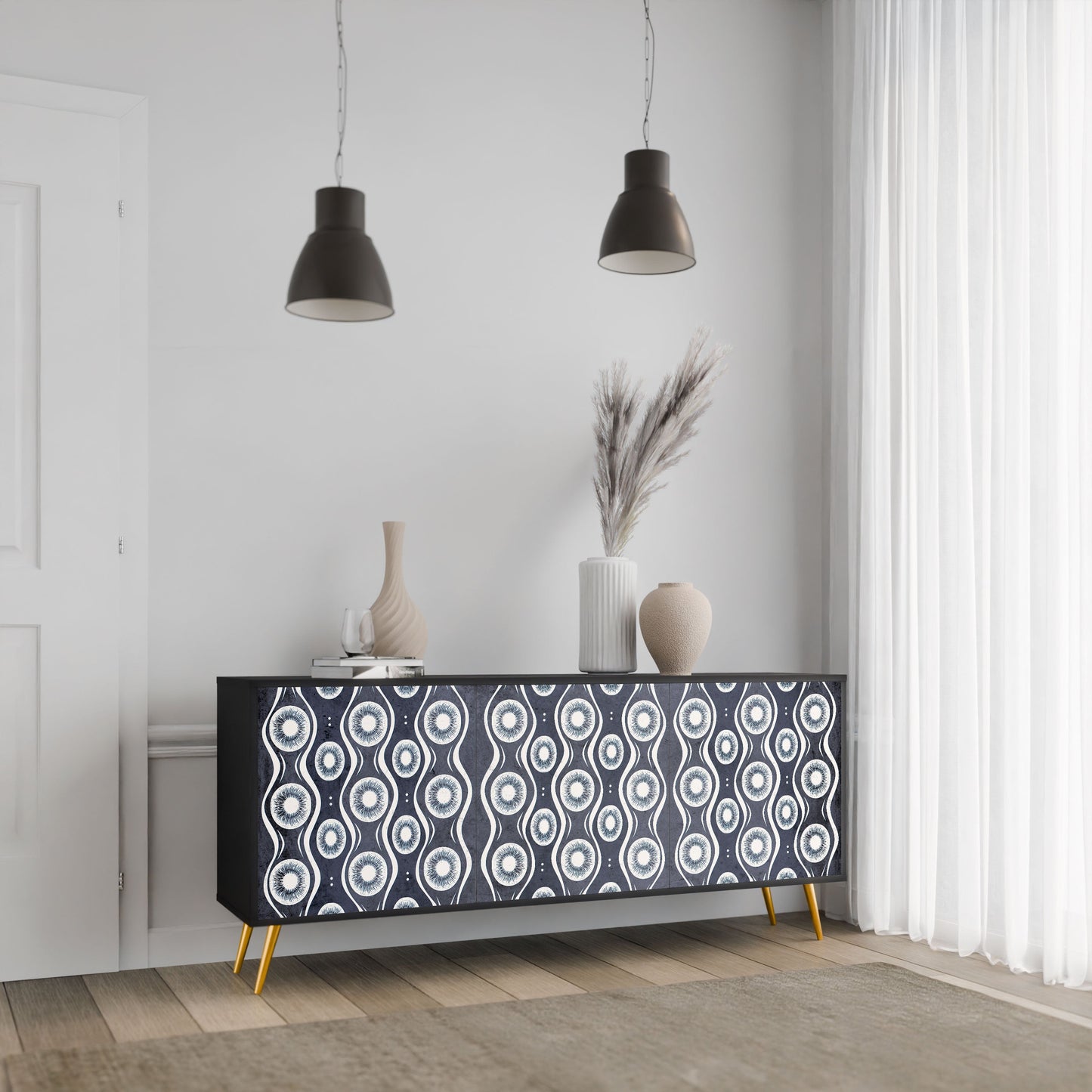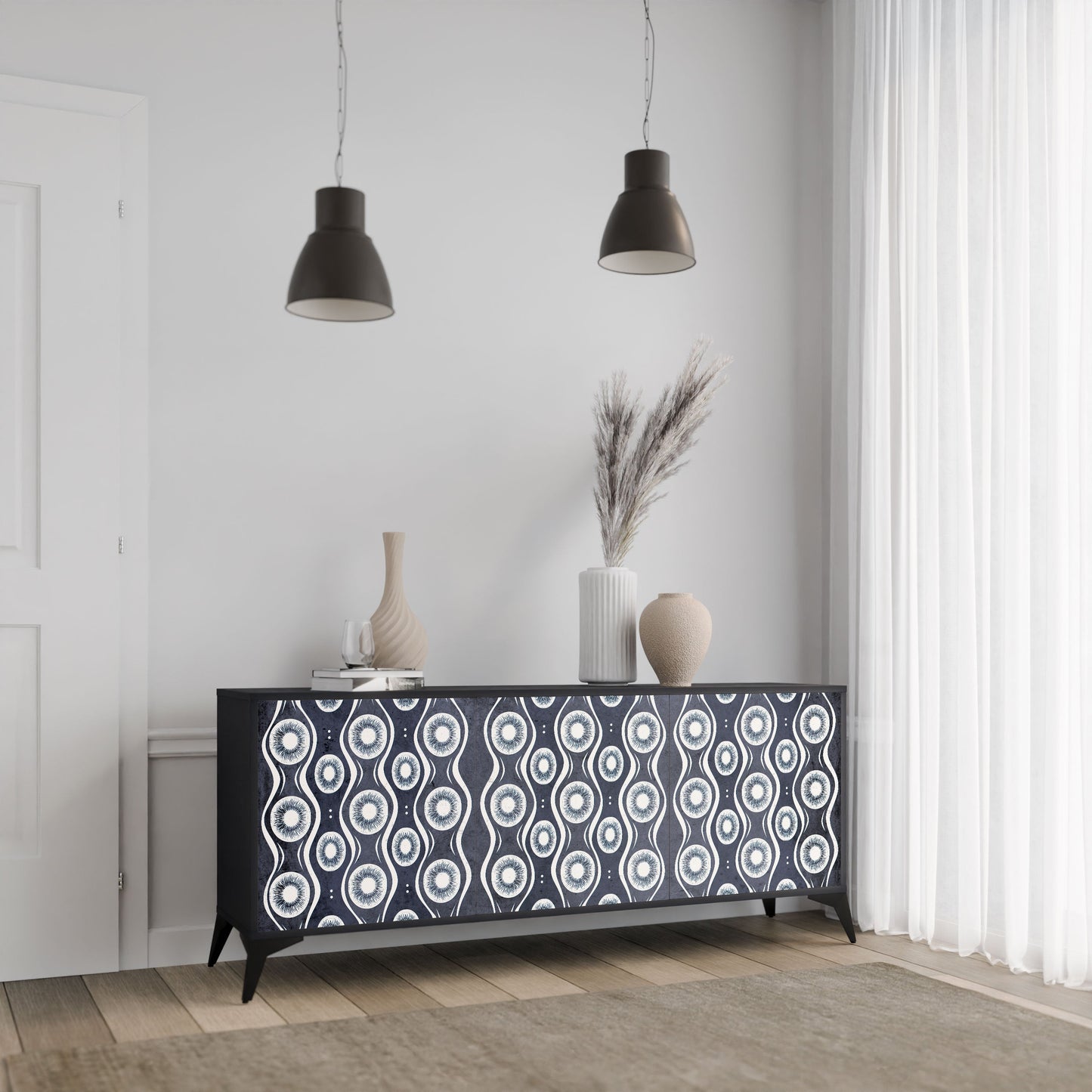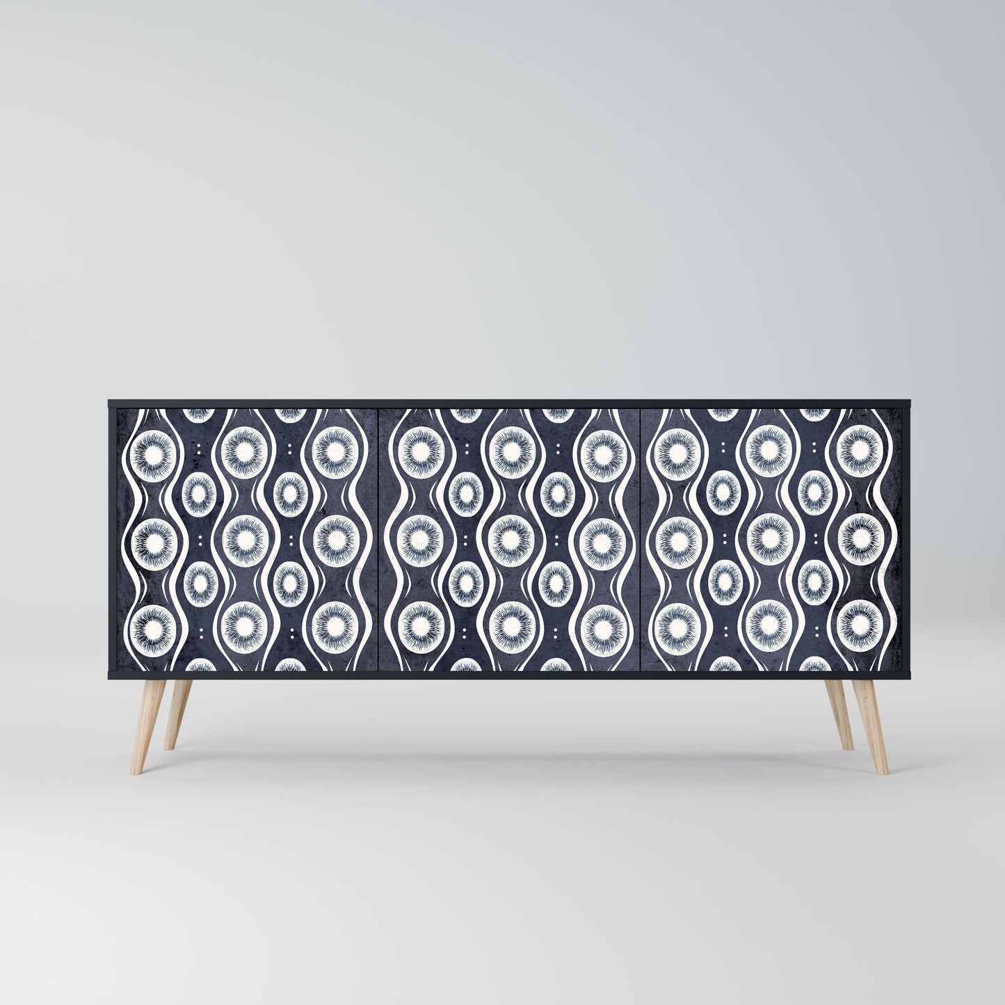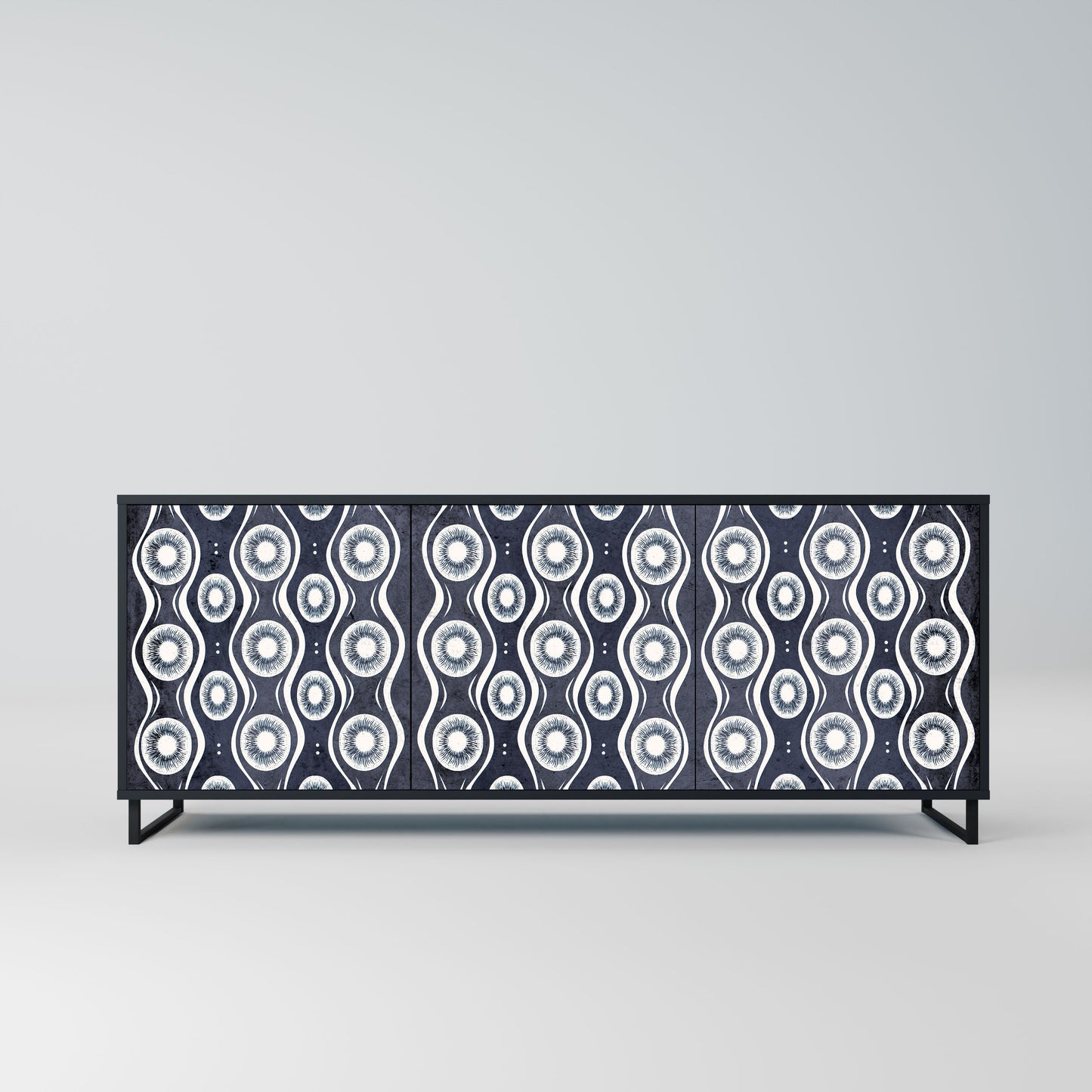Eleganza e funzionalità in un unico mobile: la nostra credenza a 3 ante con corpo nero è la soluzione perfetta per gli amanti degli interni eleganti e moderni. Il corpo nero enfatizza il carattere audace del mobile, mentre i frontali con una stampa unica aggiungono un tocco artistico. Si adatta perfettamente al soggiorno, alla camera da letto o all'ufficio, completando sia gli arrangiamenti moderni che quelli industriali.