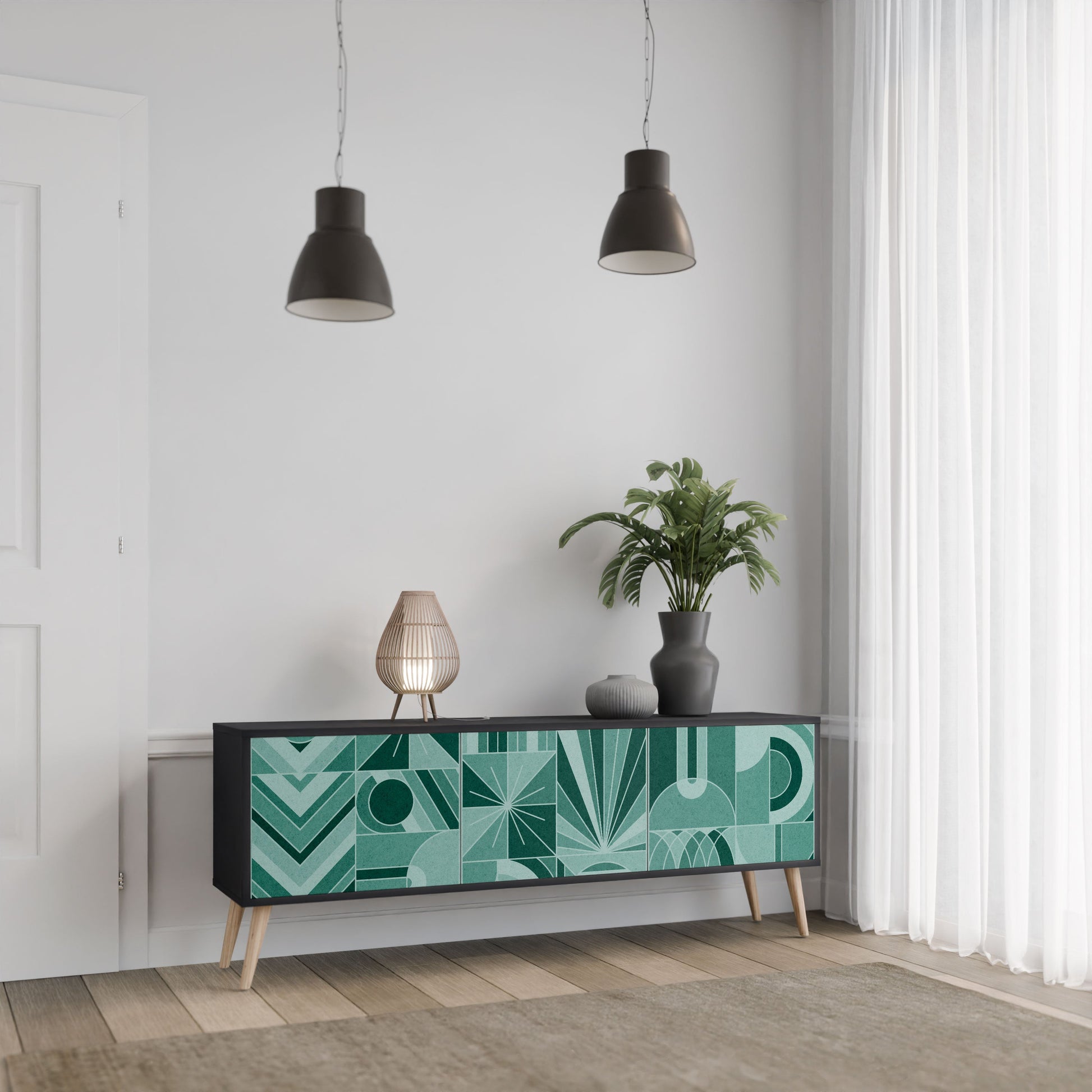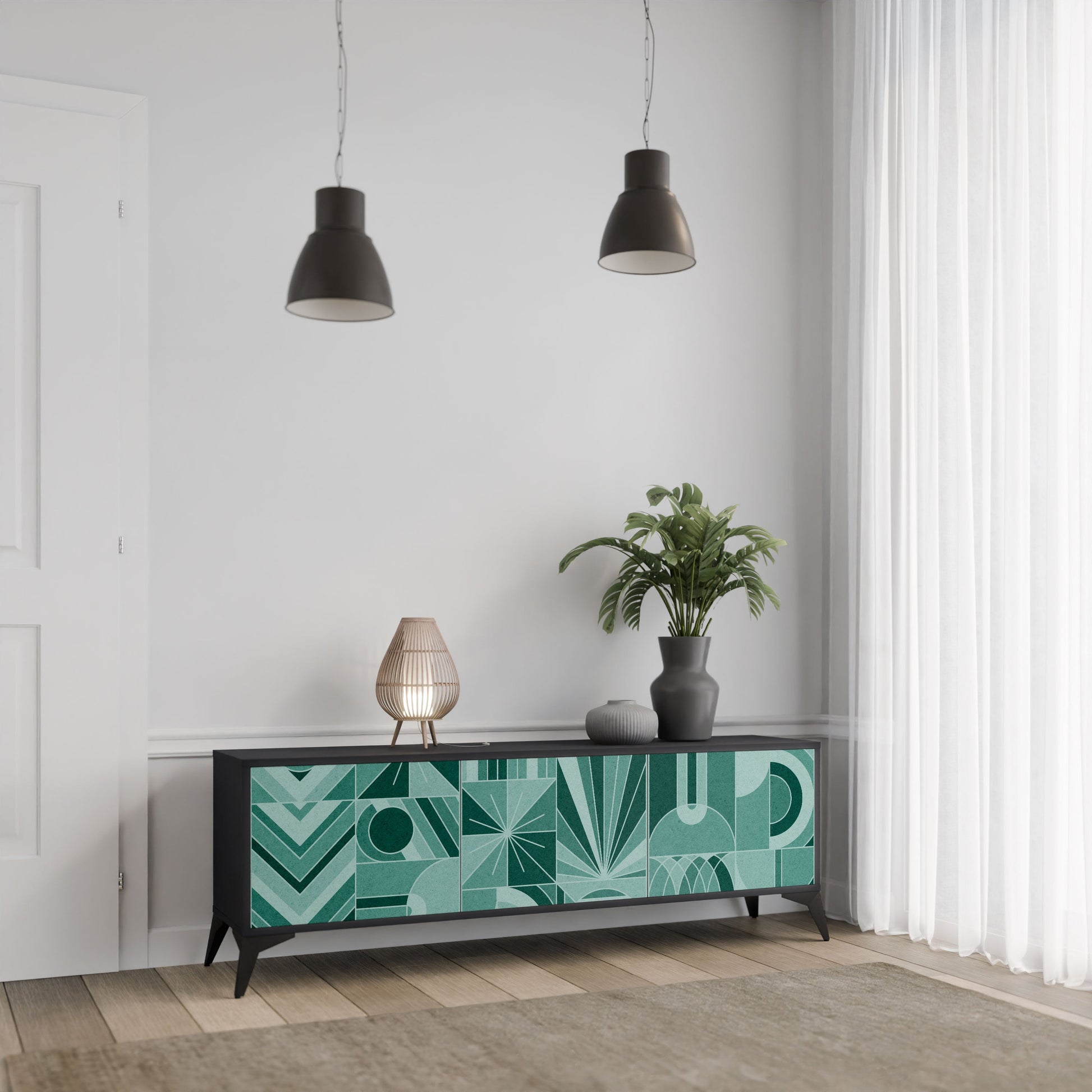 Il corpo nero del supporto crea un accento audace e moderno che si abbina magnificamente ad allestimenti industriali e minimalisti. I frontali con una stampa di design aggiungono carattere e unicità, rendendo questo pezzo non solo pratico ma anche un elemento decorativo di spicco.