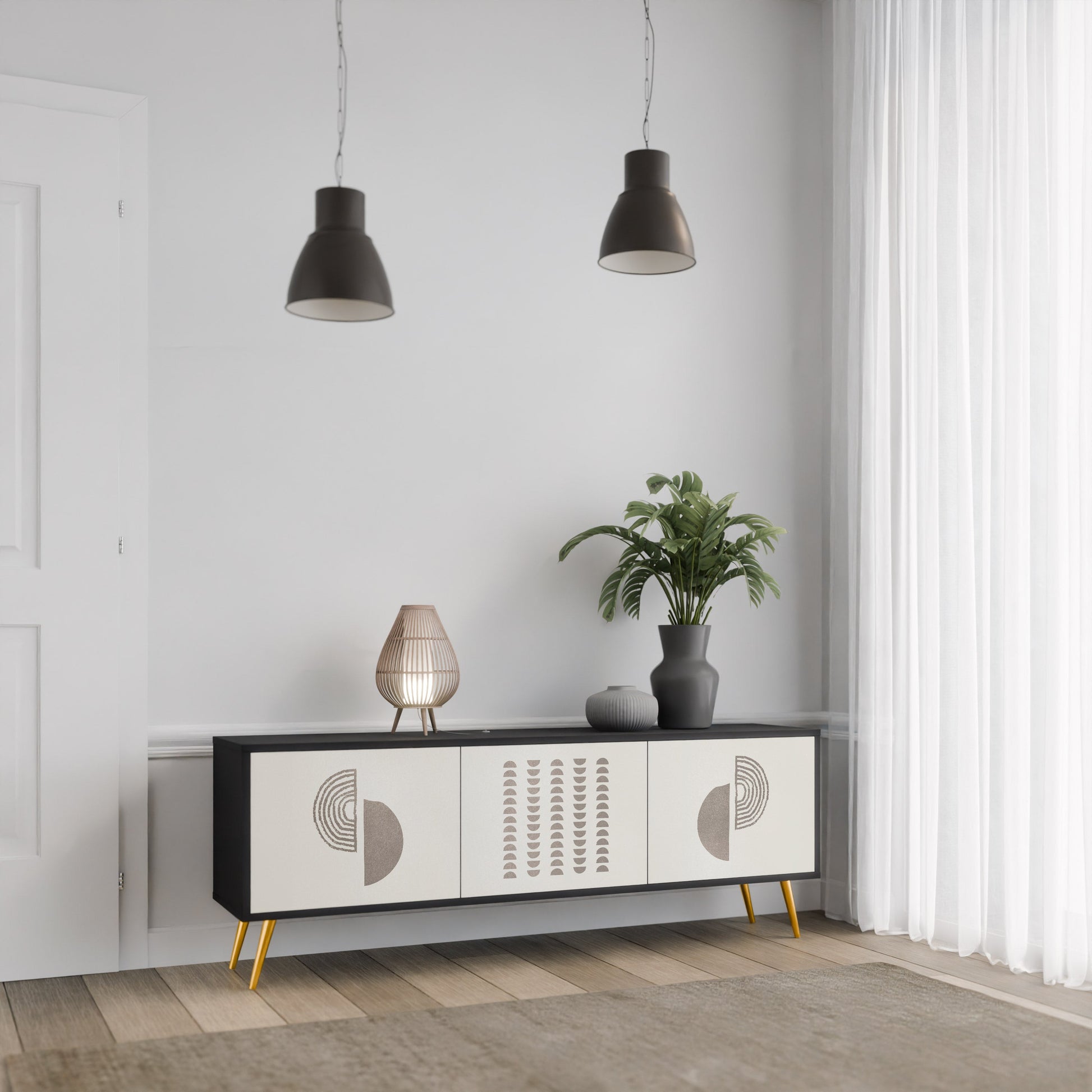 Scopri il perfetto mix di stile e funzionalità! Il nostro mobile porta TV a 3 ante con corpo nero porta eleganza moderna e il massimo spazio di archiviazione al tuo interno. È una scelta ideale per il soggiorno, offrendo un posto per la tua TV e spazio per dispositivi elettronici, accessori e decorazioni.