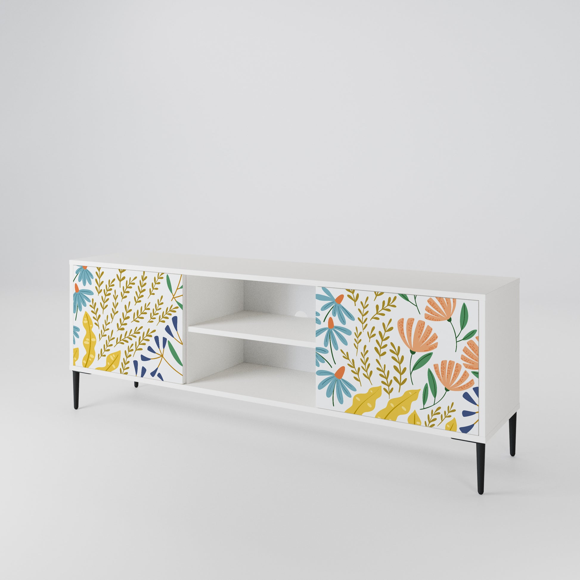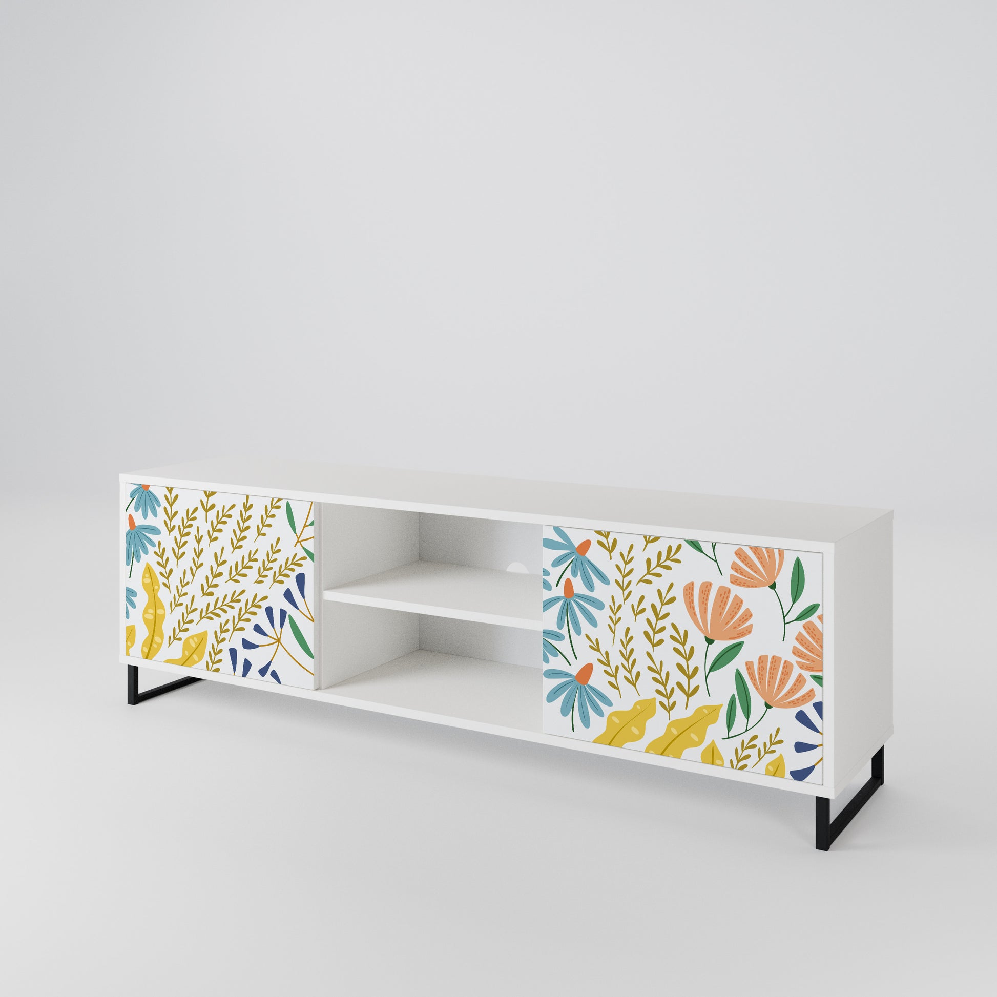 Il corpo bianco conferisce al mobile TV un aspetto luminoso e raffinato, mentre i frontali con una stampa eccezionale catturano l'attenzione, diventando il punto focale di qualsiasi stanza. Lo spazioso interno offre spazio per dispositivi elettronici, cavi, telecomandi e altri accessori, aiutandoti a mantenere ordine e organizzazione.