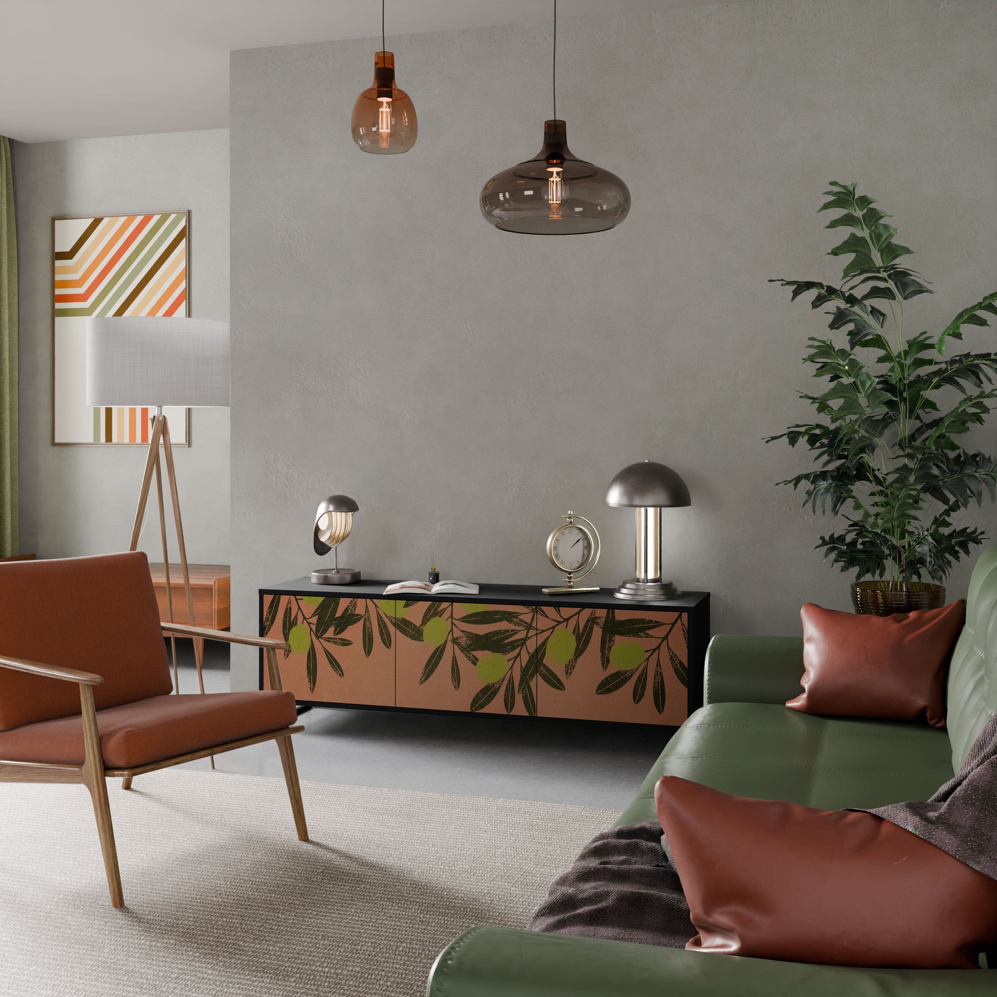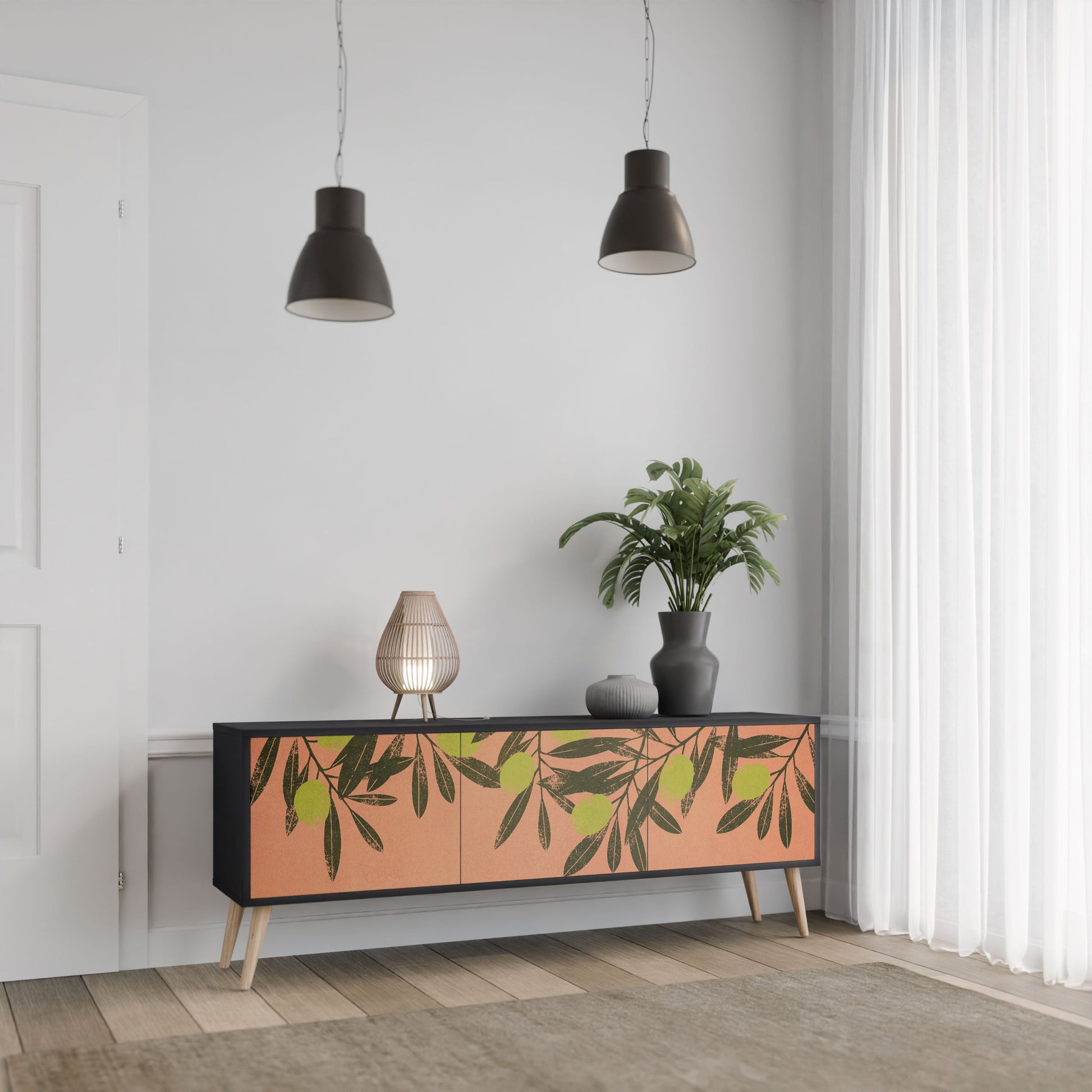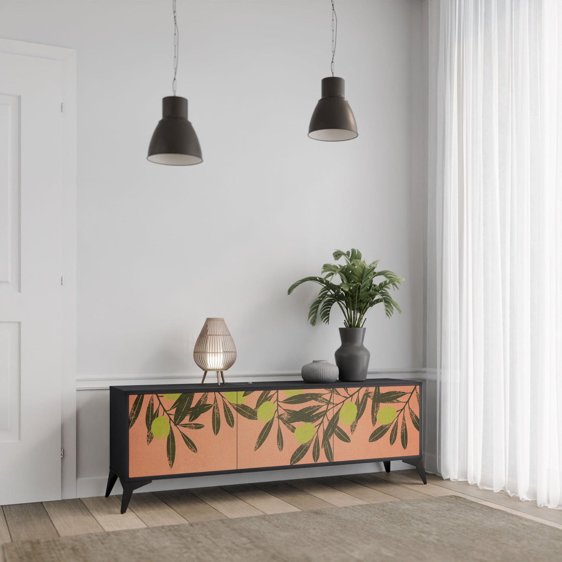 Il corpo nero del supporto crea un accento audace e moderno che si abbina magnificamente ad allestimenti industriali e minimalisti. I frontali con una stampa di design aggiungono carattere e unicità, rendendo questo pezzo non solo pratico ma anche un elemento decorativo di spicco.