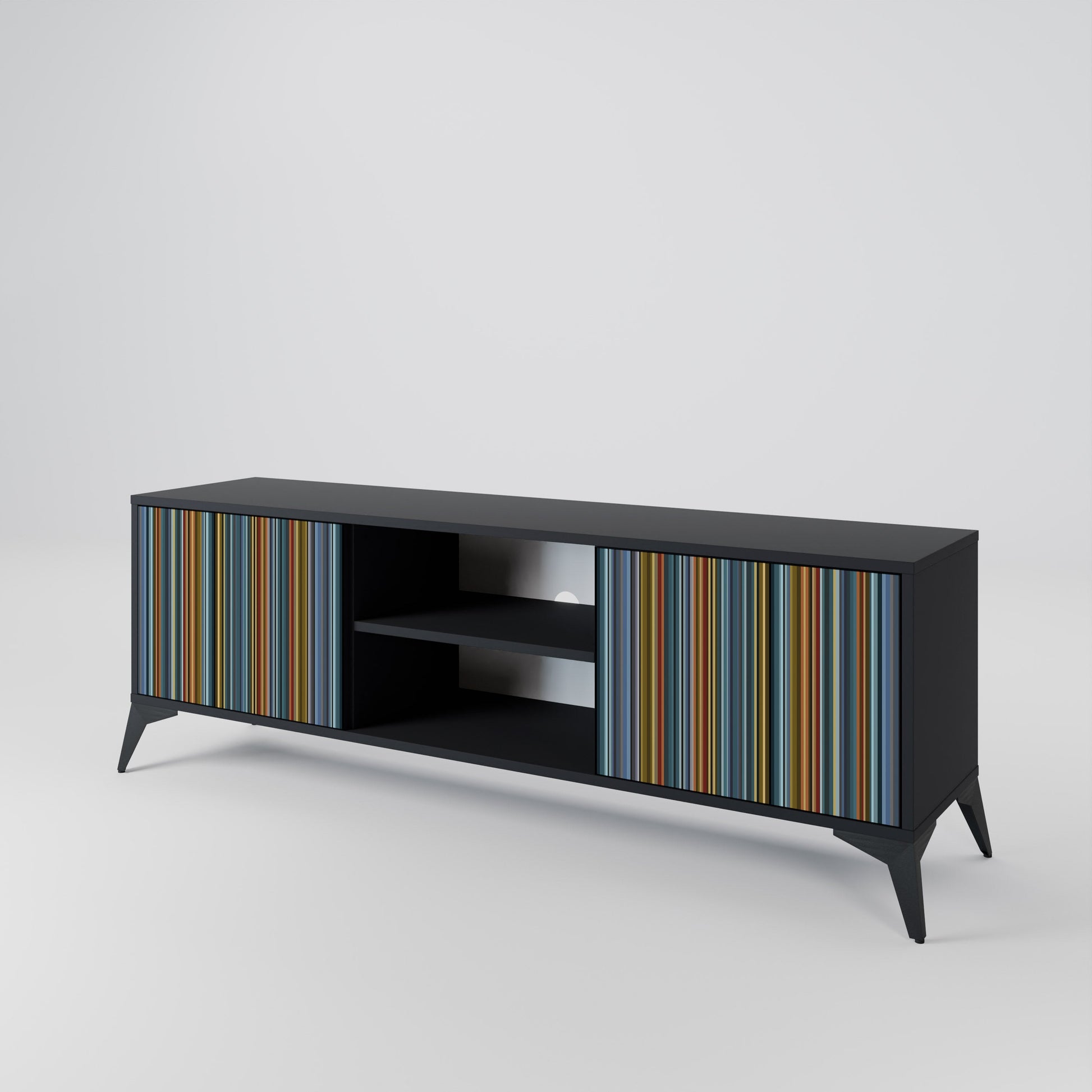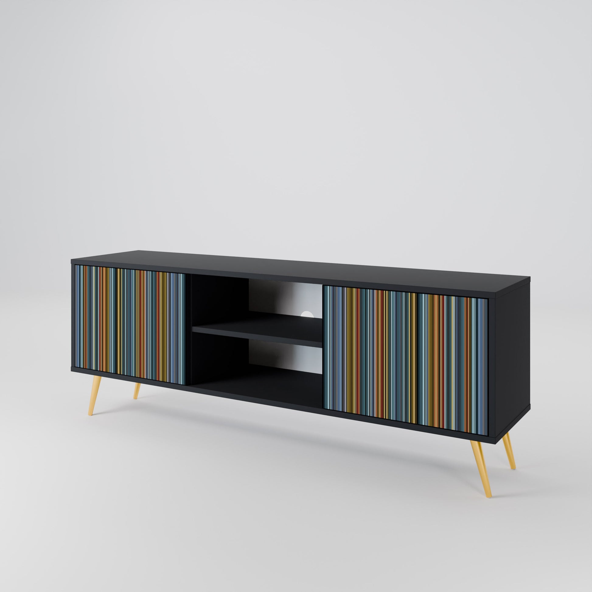 Il corpo nero conferisce al mobile TV un aspetto elegante e moderno, mentre i frontali con una stampa eccezionale attirano l'attenzione, rendendolo il punto focale di ogni stanza. L'interno spazioso offre spazio per dispositivi elettronici, cavi, telecomandi e altri accessori, aiutandoti a mantenere ordine e organizzazione.