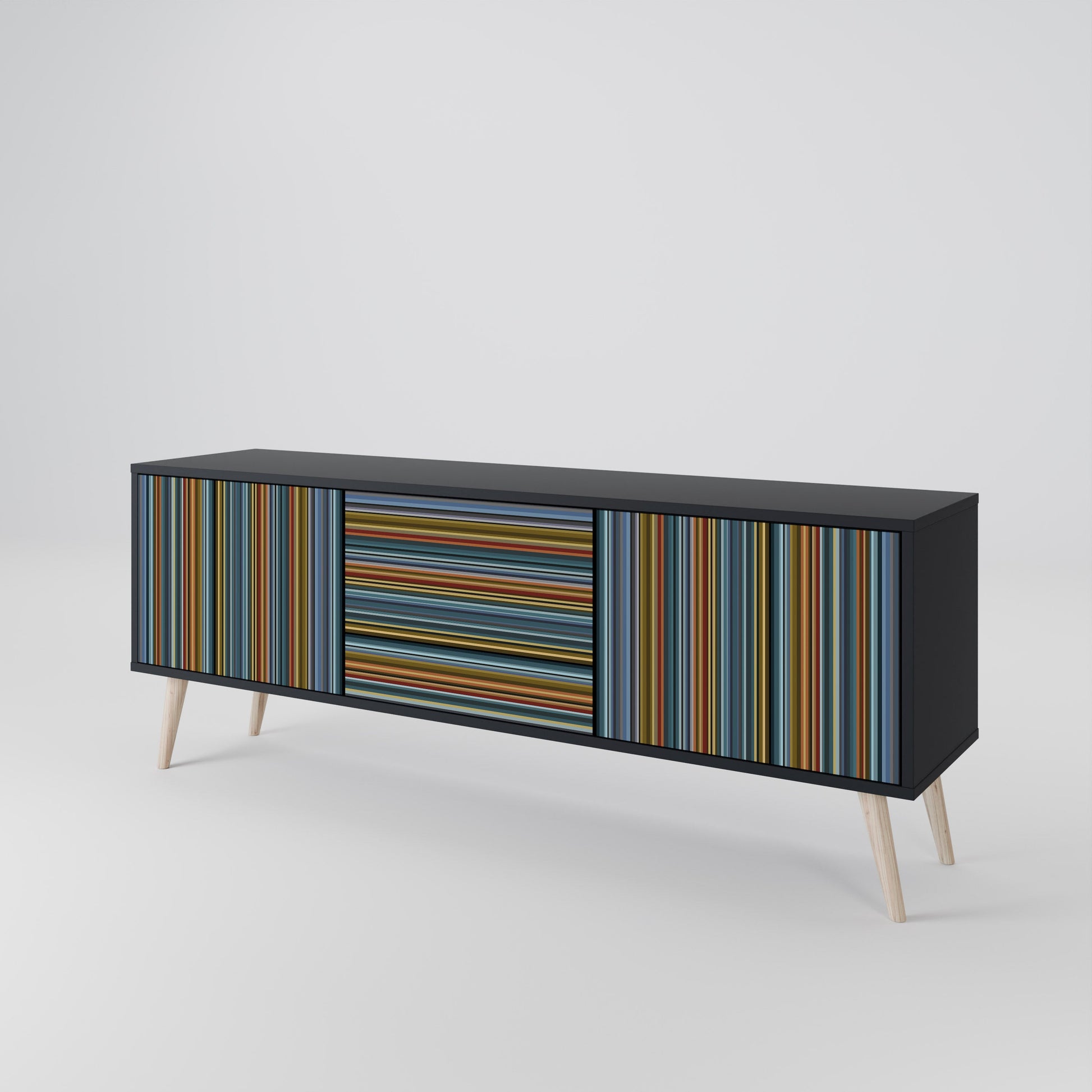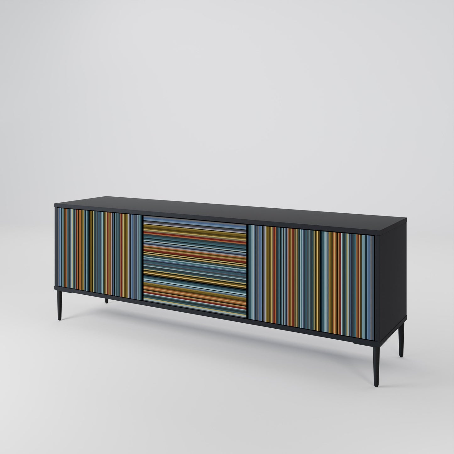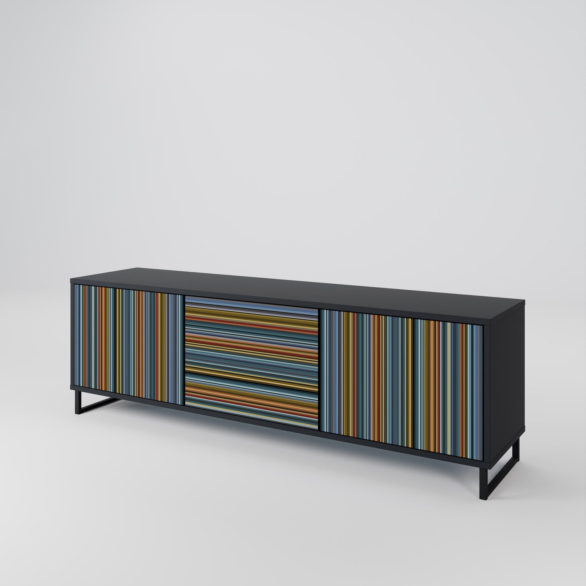 Il corpo nero del supporto crea un accento audace e moderno che si abbina magnificamente ad allestimenti industriali e minimalisti. I frontali con una stampa di design aggiungono carattere e unicità, rendendo questo pezzo non solo pratico ma anche un elemento decorativo di spicco.
