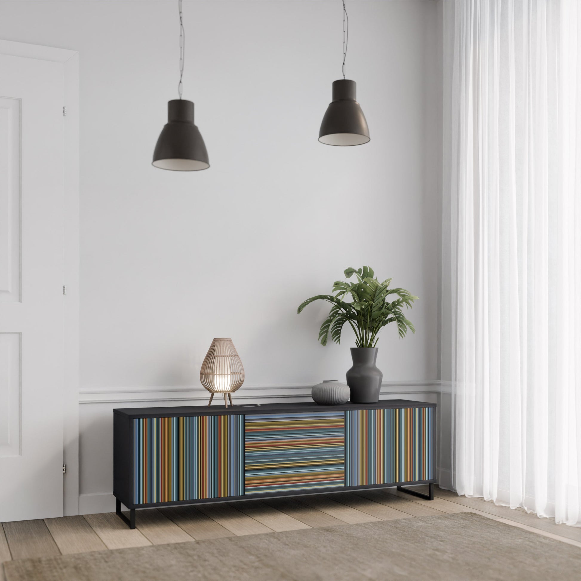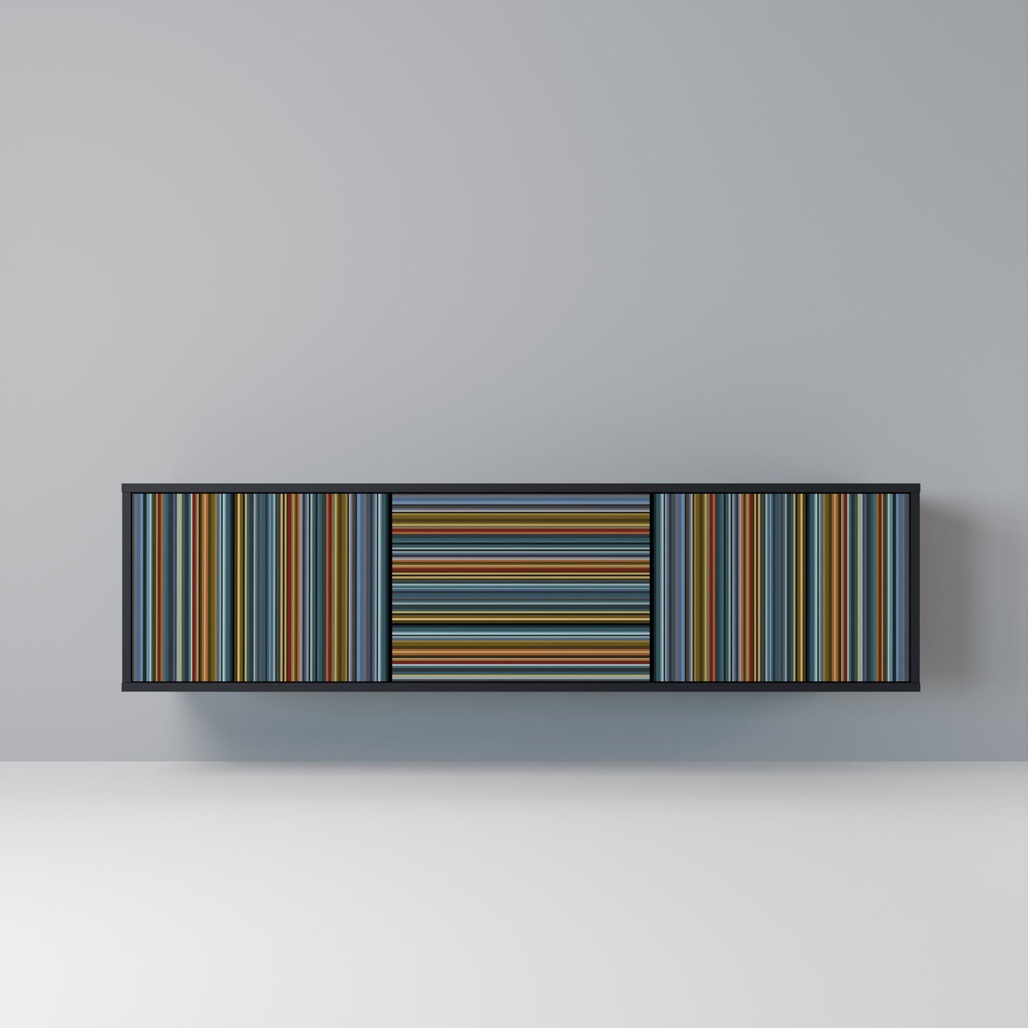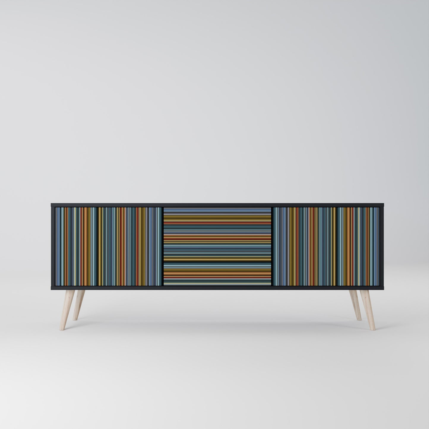 Il corpo nero del supporto crea un accento audace e moderno che si abbina magnificamente ad allestimenti industriali e minimalisti. I frontali con una stampa di design aggiungono carattere e unicità, rendendo questo pezzo non solo pratico ma anche un elemento decorativo di spicco.