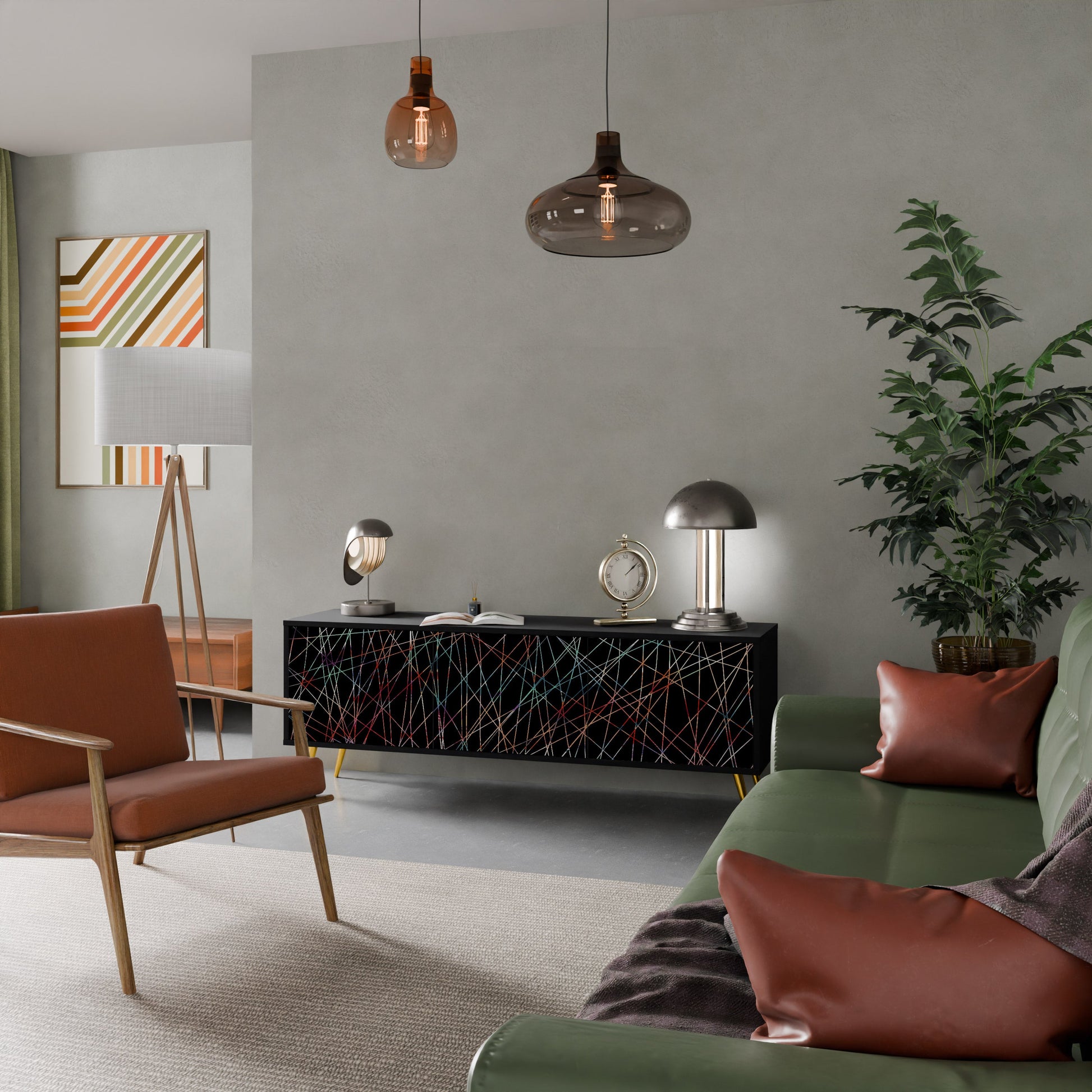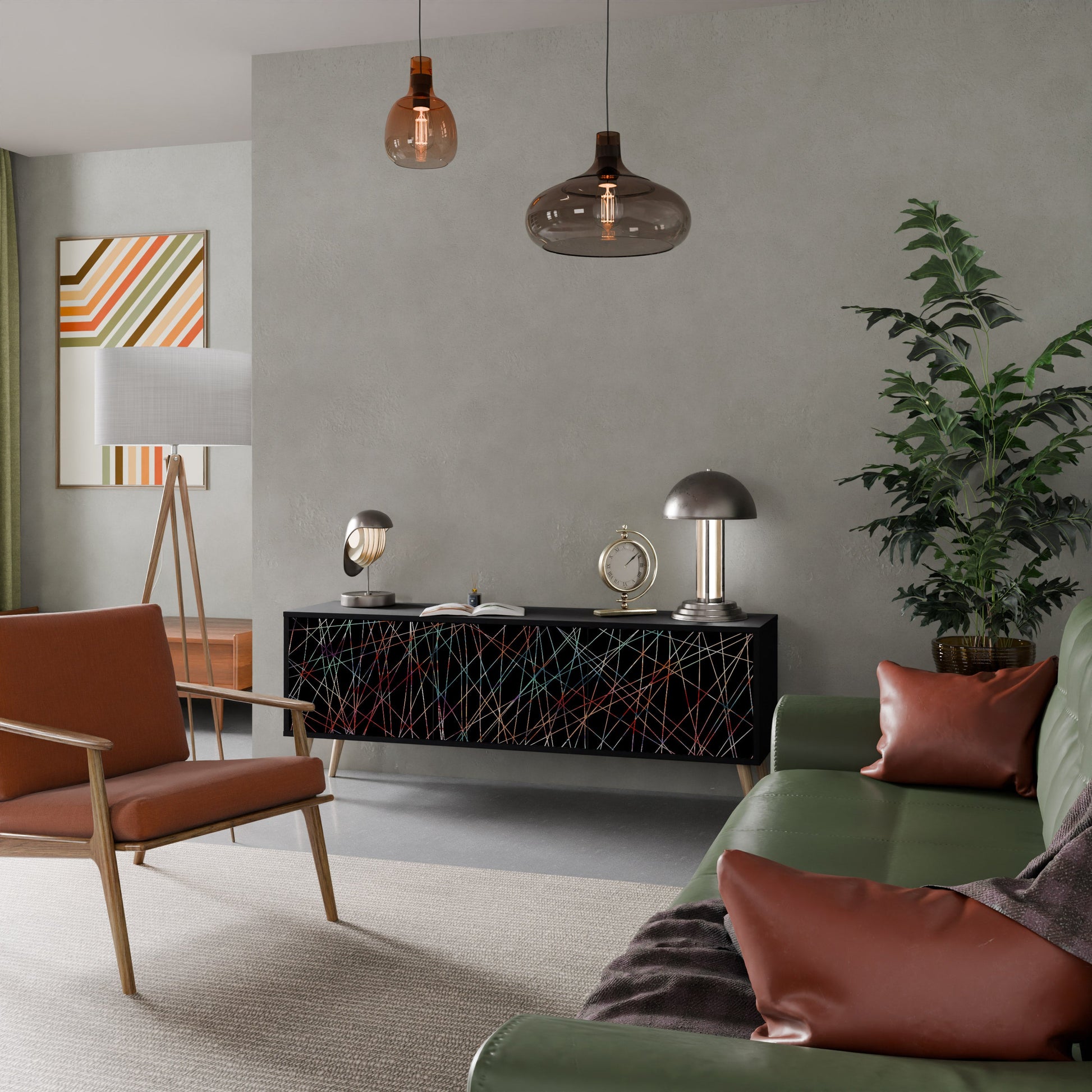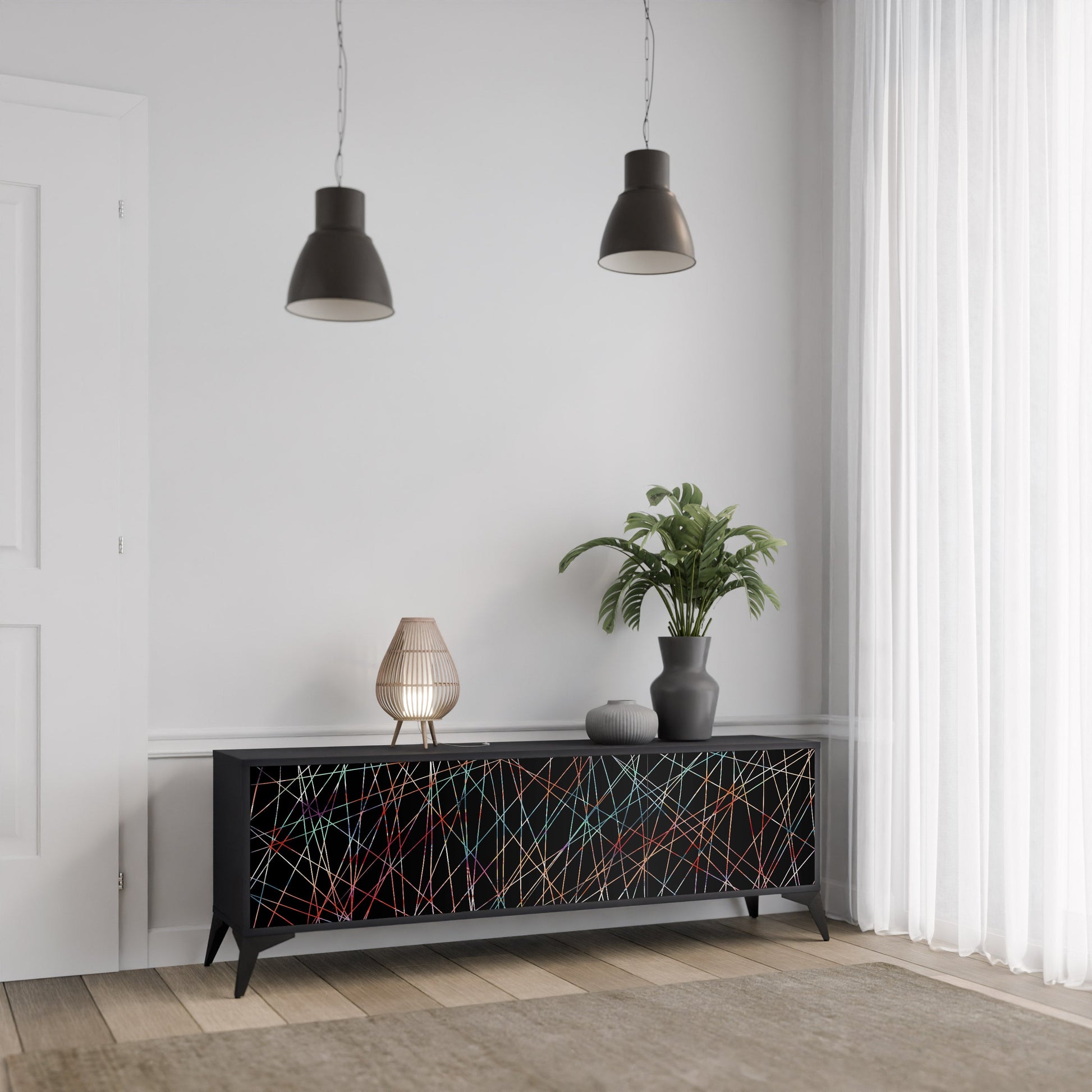 Il corpo nero del supporto crea un accento audace e moderno che si abbina magnificamente ad allestimenti industriali e minimalisti. I frontali con una stampa di design aggiungono carattere e unicità, rendendo questo pezzo non solo pratico ma anche un elemento decorativo di spicco.